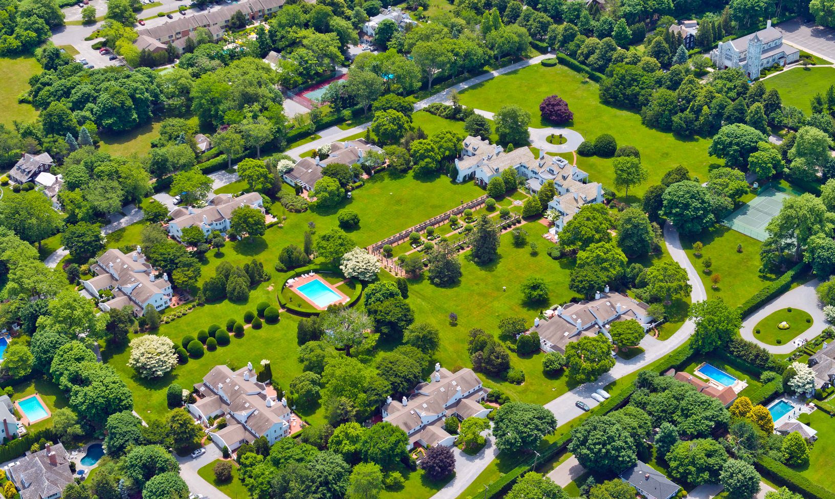 This newly renovated townhouse sits in the heart of the famous Whitefield compound, designed by Stanford White, located right in Southampton village. The 16 + acres of beautiful park designed by Frederick Law Olmstead includes impressive green lawns, specimen trees, stunning gardens, two tennis courts, an over-sized swimming pool and ... your very own ballroom! The 2500+/- square foot unit was redesigned by acclaimed Architect Basil Walter, wh