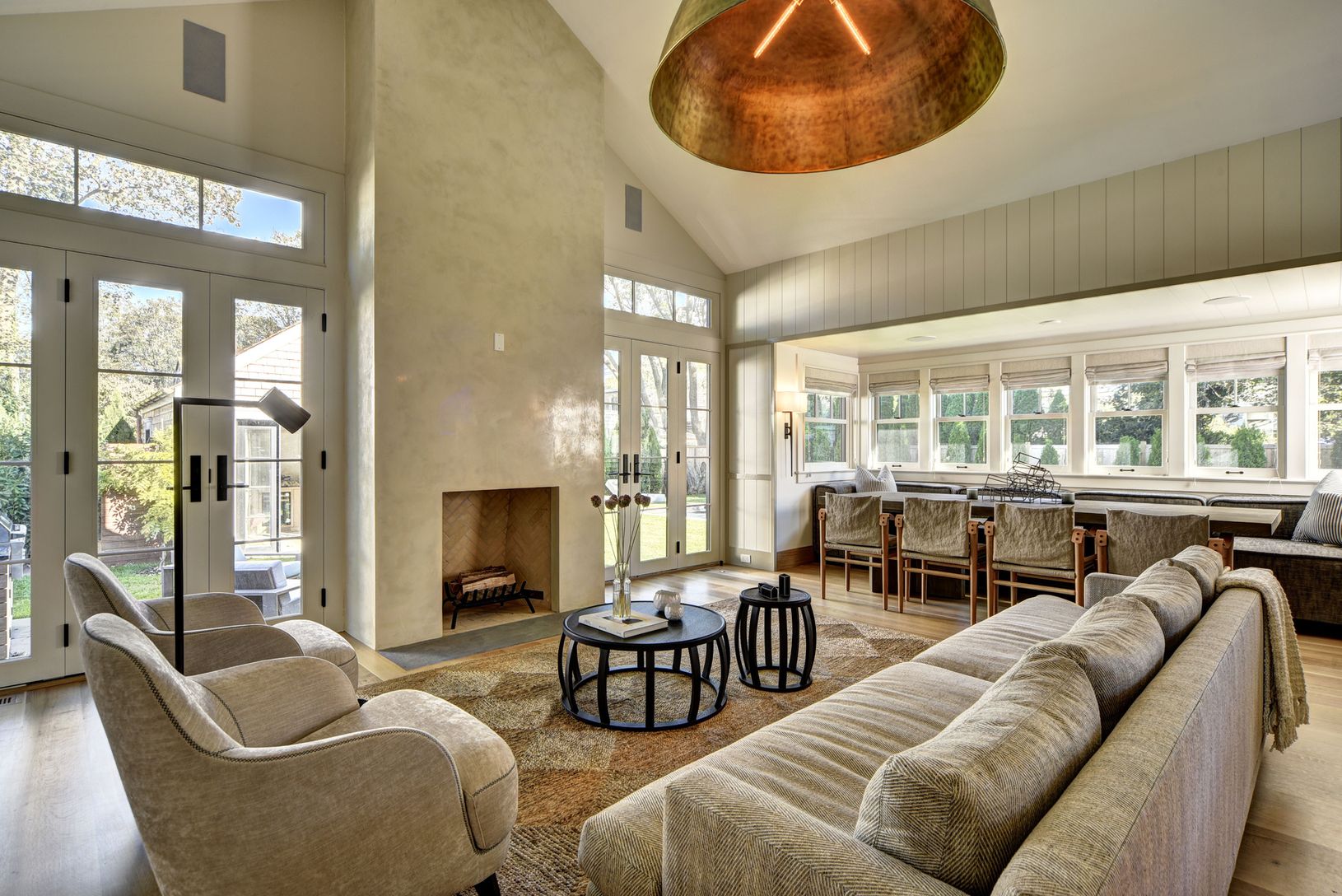 pool & pool house and inviting outdoor entertaining. The entry leads to a light-filled, double-height living room with wood burning fireplace opening to a stone patio with an outdoor fireplace, dining area, luxe kitchen, 2 bedrooms and a full bath. The second floor master suite features a spacious bathroom with large steam shower in addition to an e