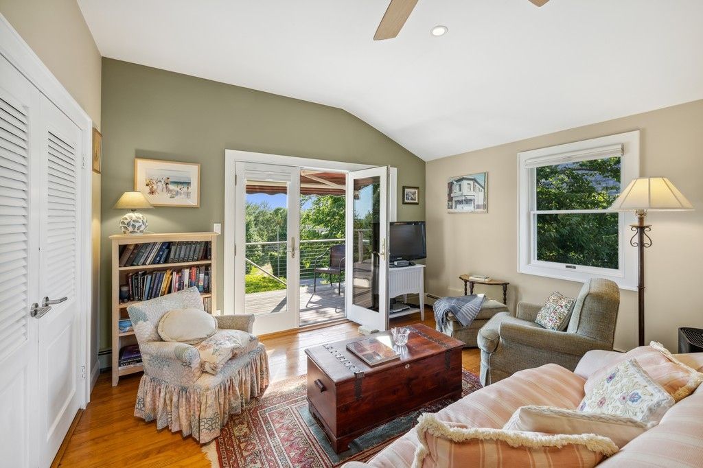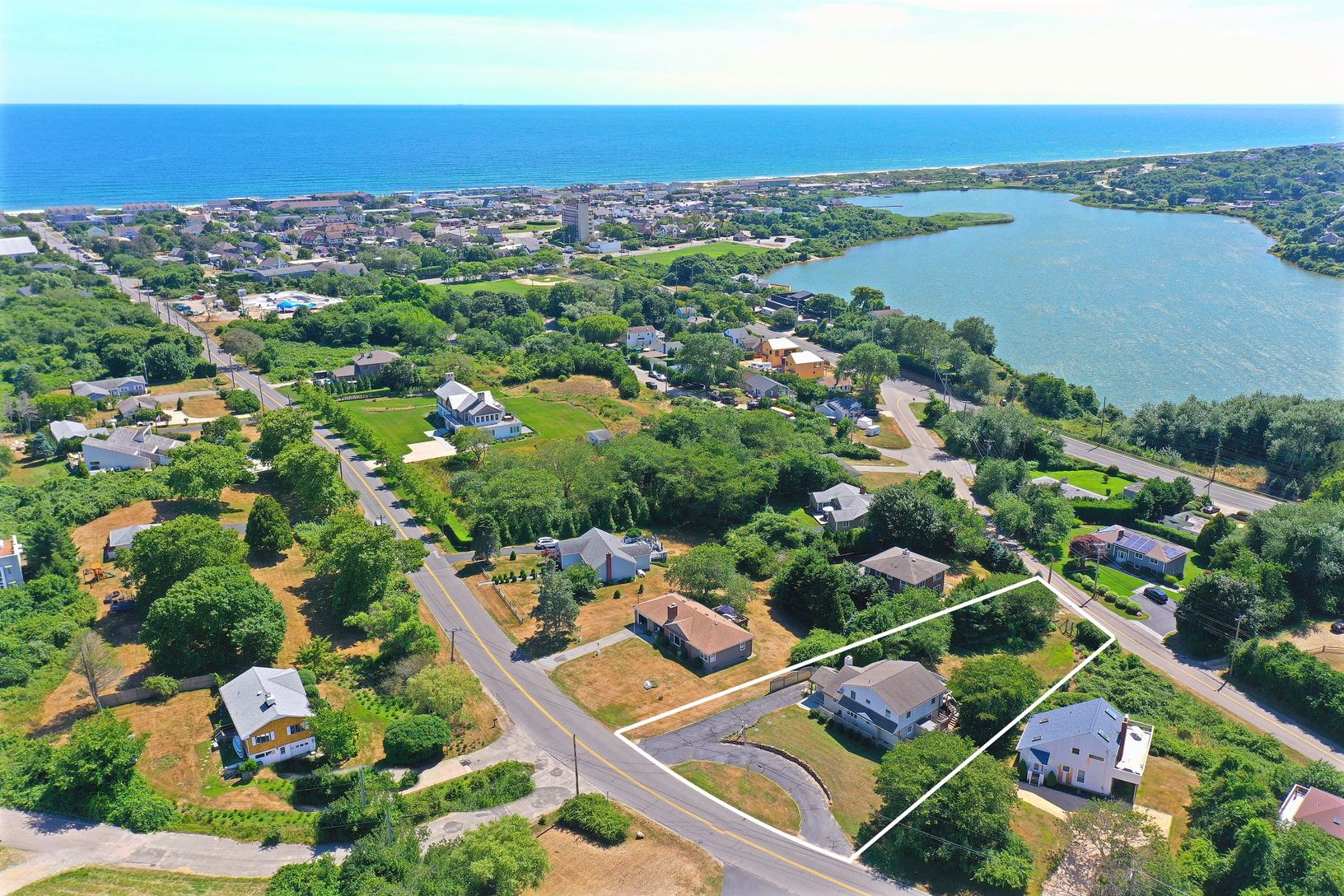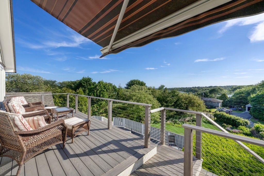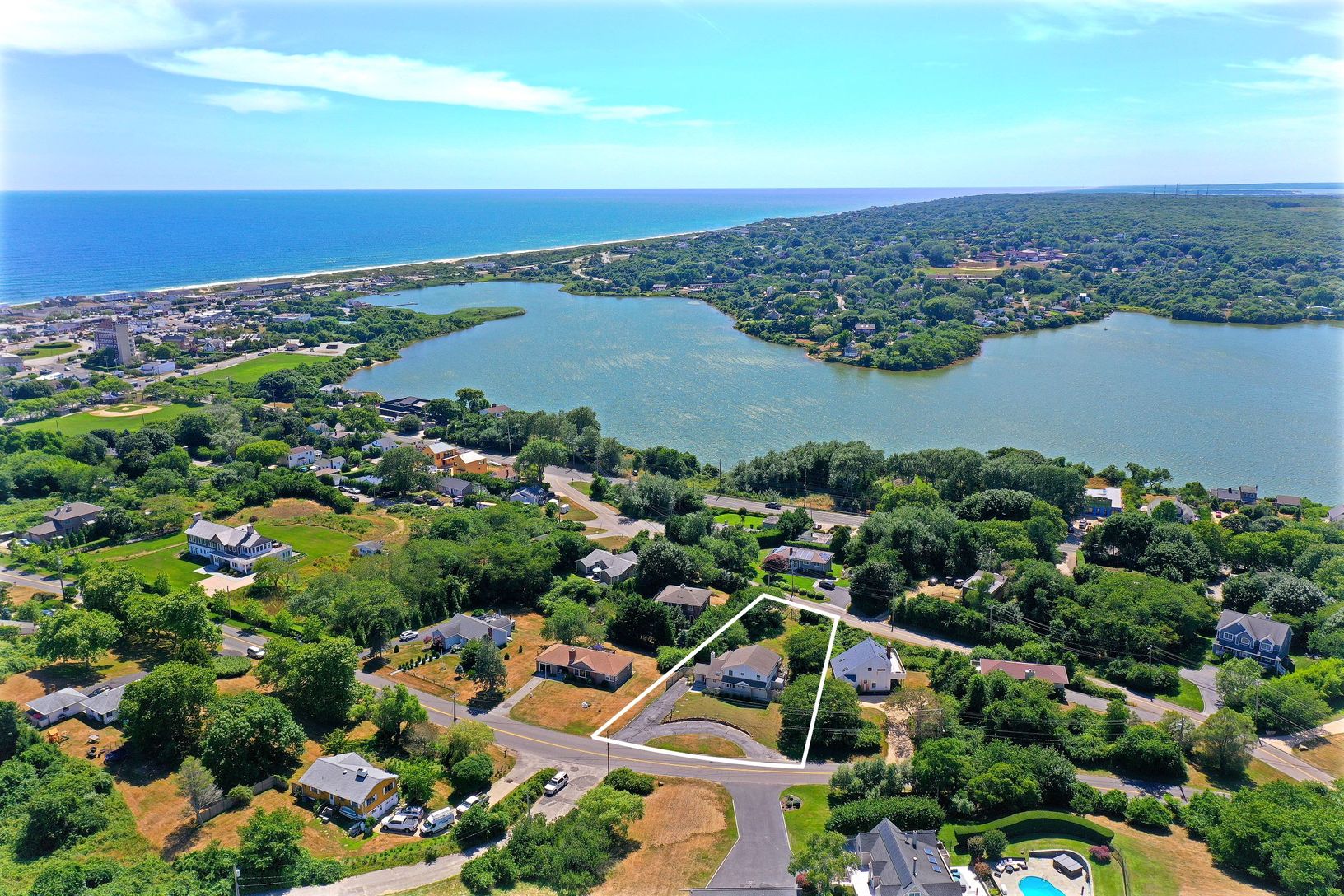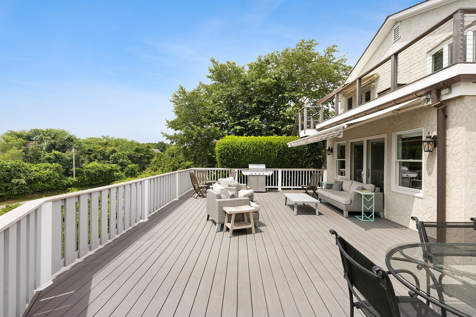 Nicely situated on shy half acre and close to town and ocean is this five bedroom, two bath home with sprawling yard and expansive decking for entertaining. Spacious and sun filled open living room with fireplace, dining, open kitchen with breakfast area. Upstairs primary bedroom has sitting area and doors that open to deck with awning where you can relax and take in the pond and ocean views. Outdoor shower and central air. Brand new upgraded