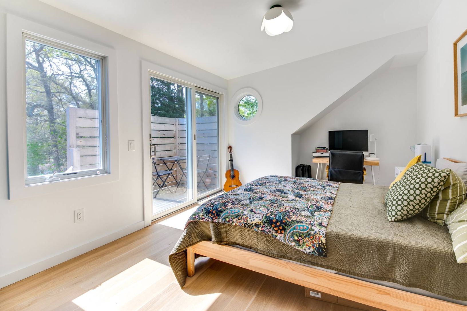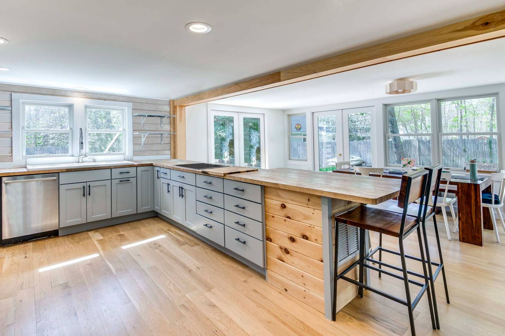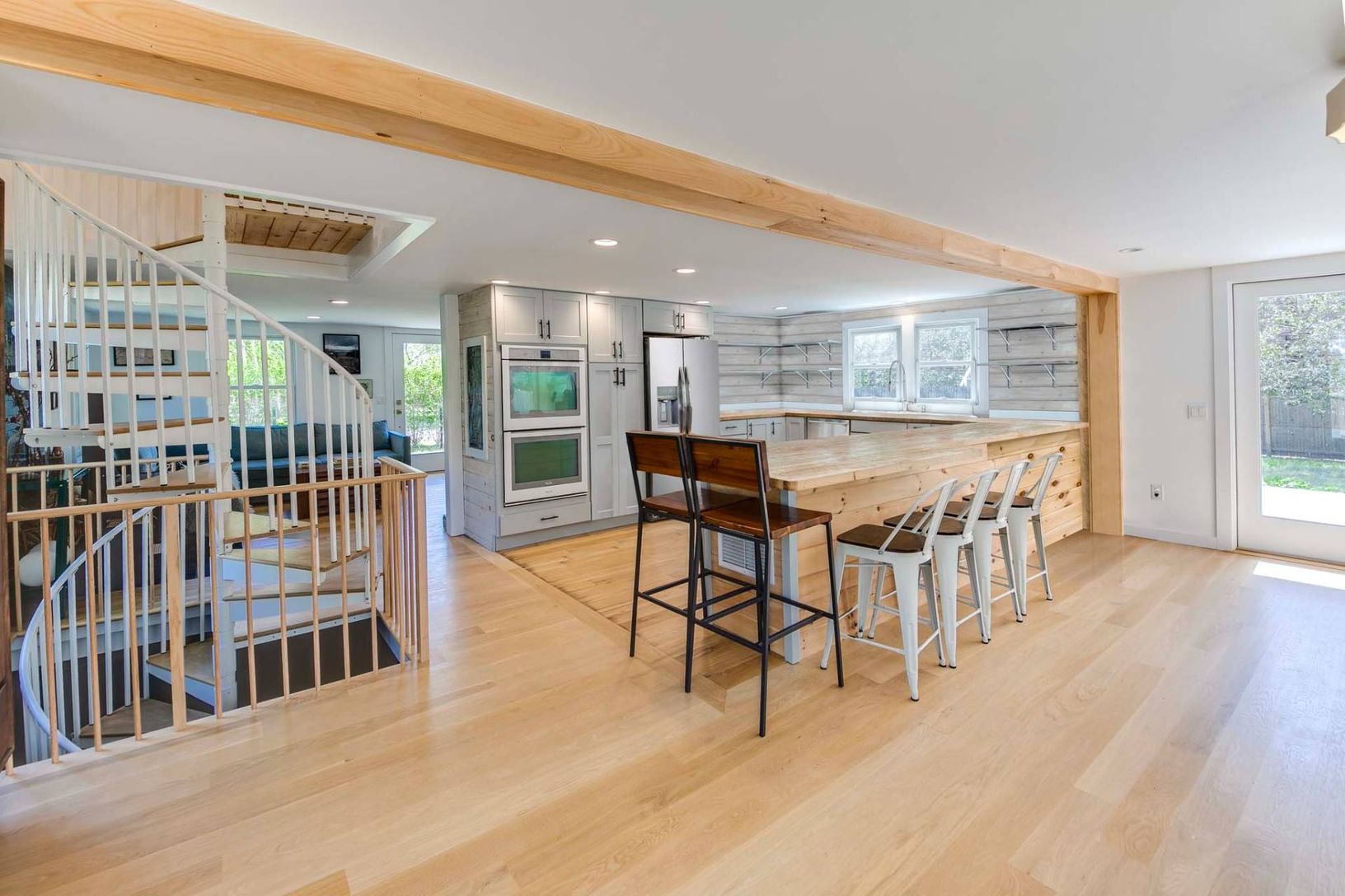 This light-filled East Hampton beach home combines beachy charm with modern updates in a quietly stylish package. With 3 bedrooms and 3 newly renovated baths, the home is bright and inviting throughout. The custom kitchen features south-facing windows, premium appliances, eat-in seating, and easy access to a sunny patio with outdoor kitchen-perfect for al fresco dining and entertaining. Charming details like a wood stove and spiral staircase a