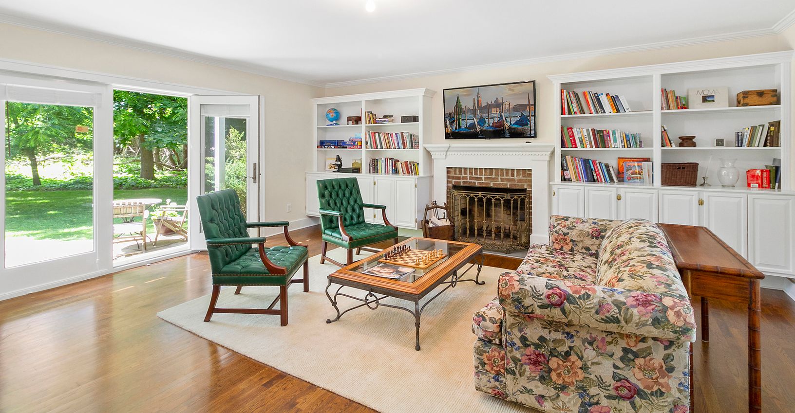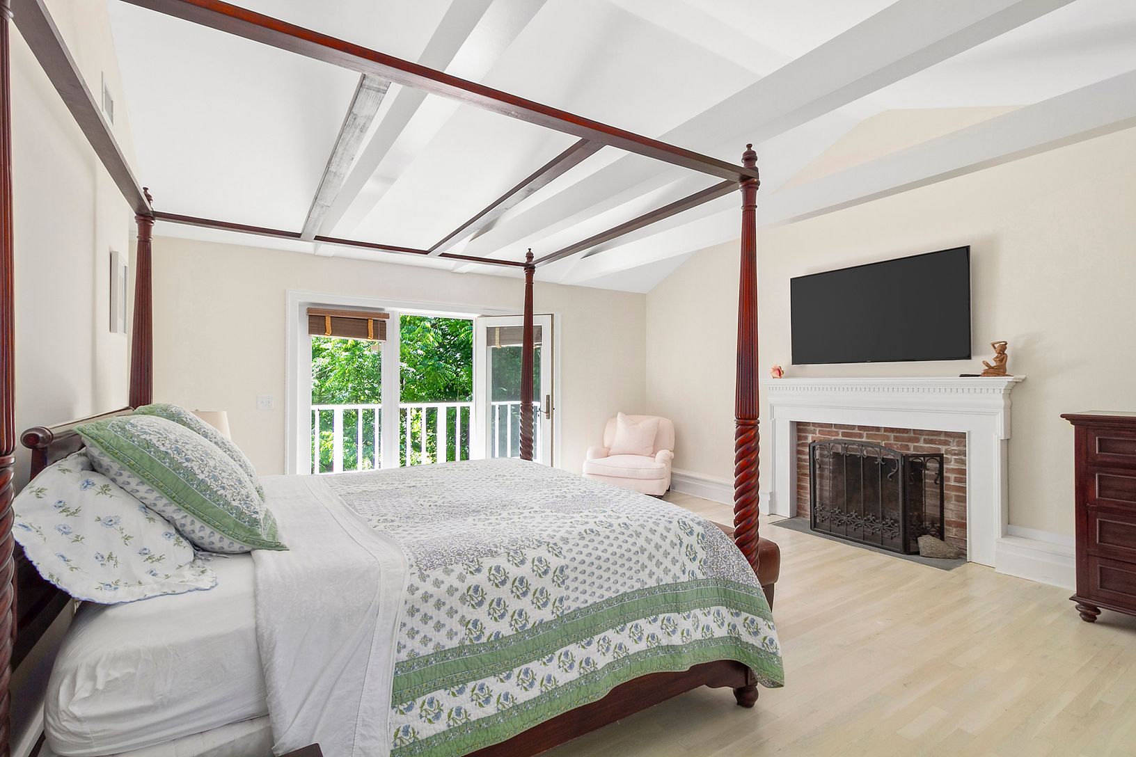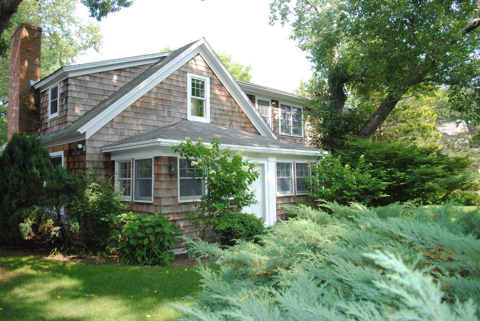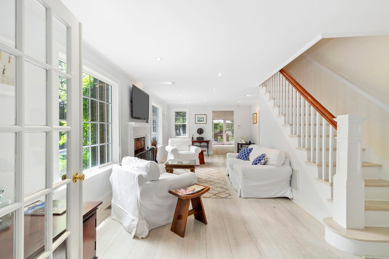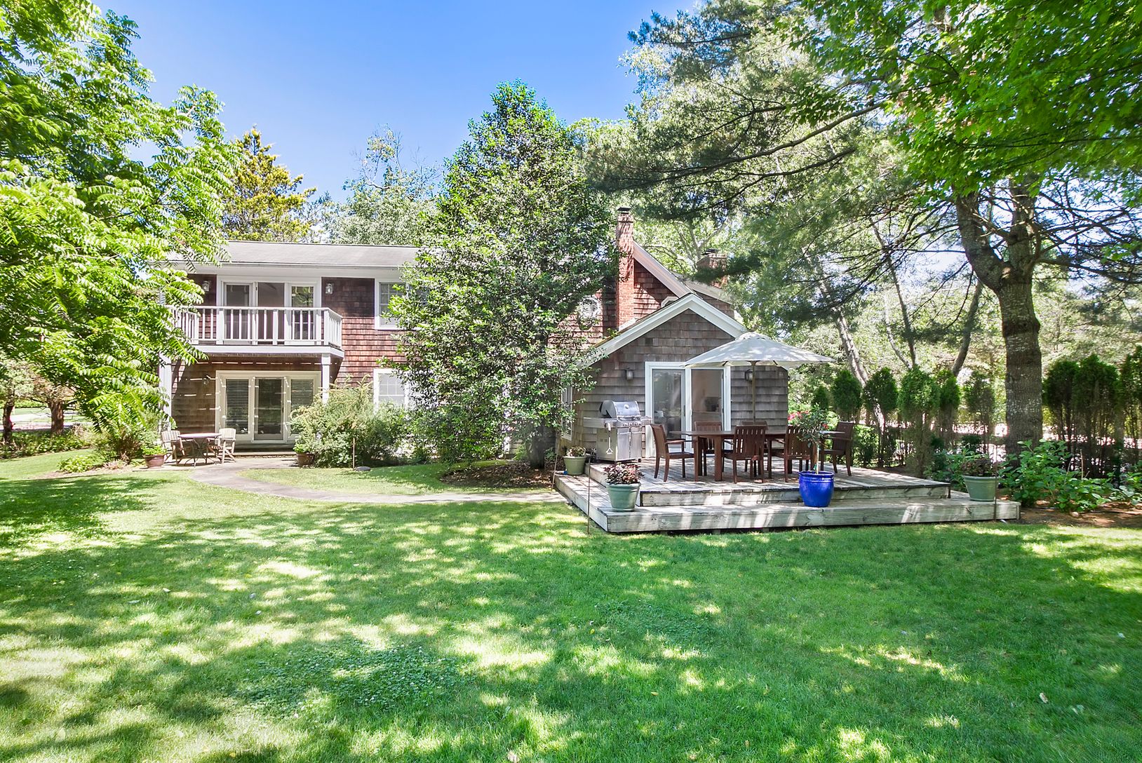 This comfortable two-story farmhouse is privately situated on .8-acre in the Village of Southampton. Features of this 4 bedroom, 4.5 bathroom home include freshly painted, recently upgraded eat-in kitchen, 2 living/sitting rooms with fireplaces & large Flat Screen Televisions , sunporch, formal dining room, outdoor deck and terrace. The Second floor comprises: 3 bedrooms, 2 and one-half bathrooms. Master bedroom with balcony has a