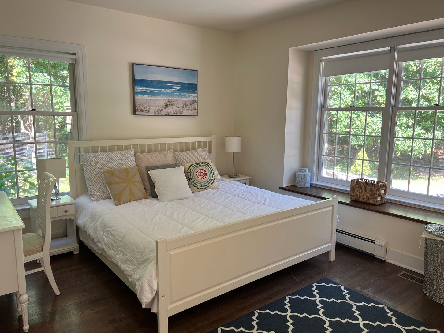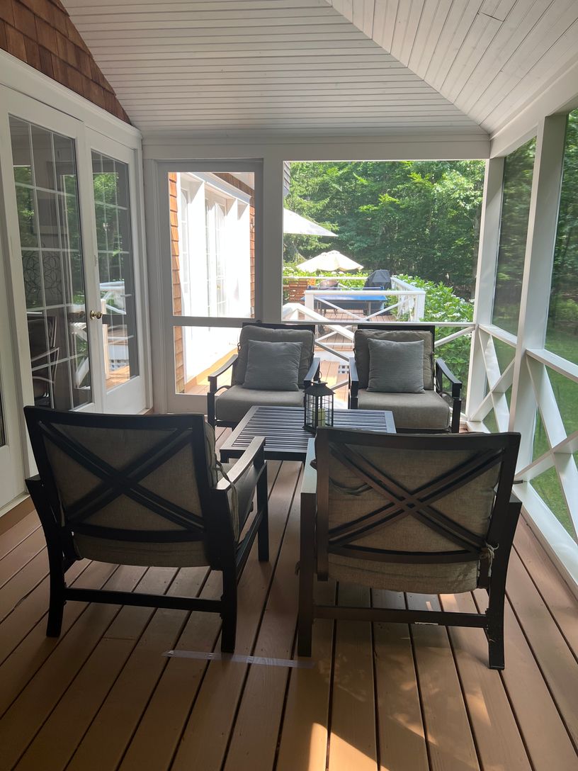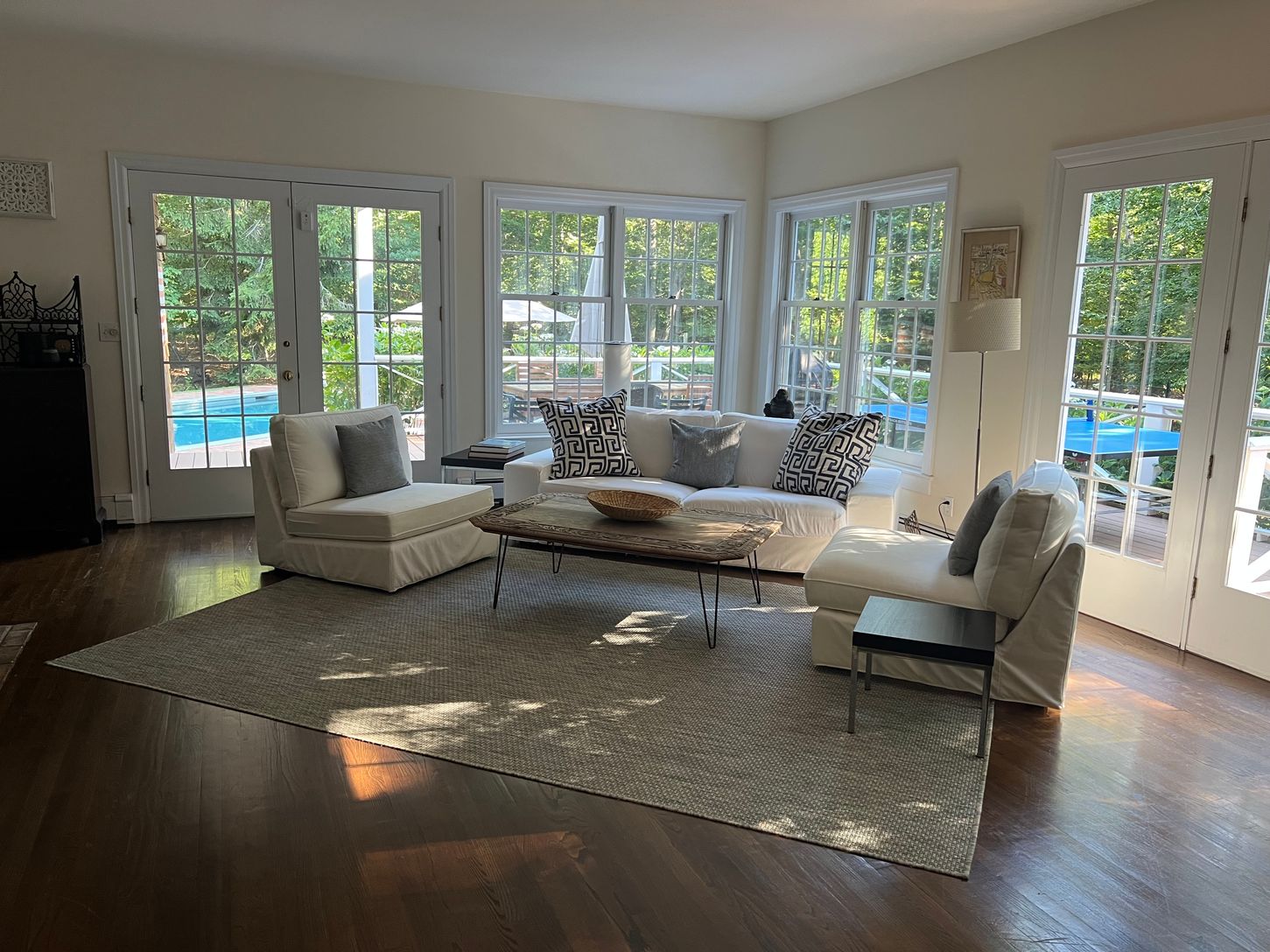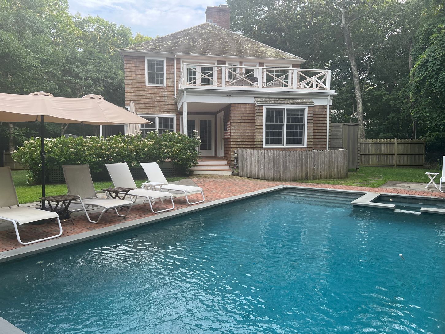 Close to private beach on Gardiner's Bay from this immaculate, 4-bedroom, 3.5-bath home. Spacious living room with fireplace, formal dining room, sun room off kitchen, master suite with fireplace, Jacuzzi with steam shower, sauna, central air, and beautiful screened porch with heated salt water pool and lots of privacy.