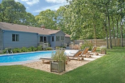 Located a stone's throw from the sandy beach, this completely turn-key designer's home is an idyllic spot for year-round comfort and enjoyment. Set on a shy acre, there is a bluestone path leading to the front veranda and welcoming glass pane door opening to the front foyer with stone floor. The living room has a raised hearth and bay window and just beyond is a dining area with views to the pool through sliding doors. Immediately adjacent is