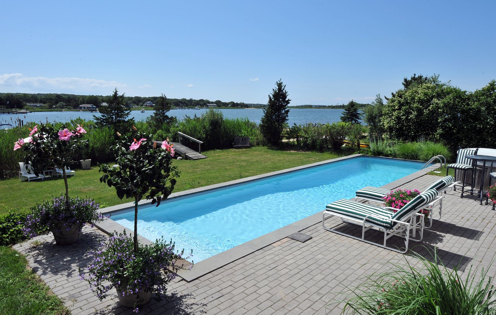 Enjoy Inspiring sunset views over Sag Harbor Cove at this newly decorated, waterfront home with waterside pool and deep-water dock for two boats; all of this on a quiet cul-de-sac in the Redwood section of Sag Harbor Village. All rooms have a view of the water. Four bedrooms include a grand master suite on the first floor. A separate guest suite has its own entrance. The other bedrooms are en suite. Entertain on your expansive waterside patio;