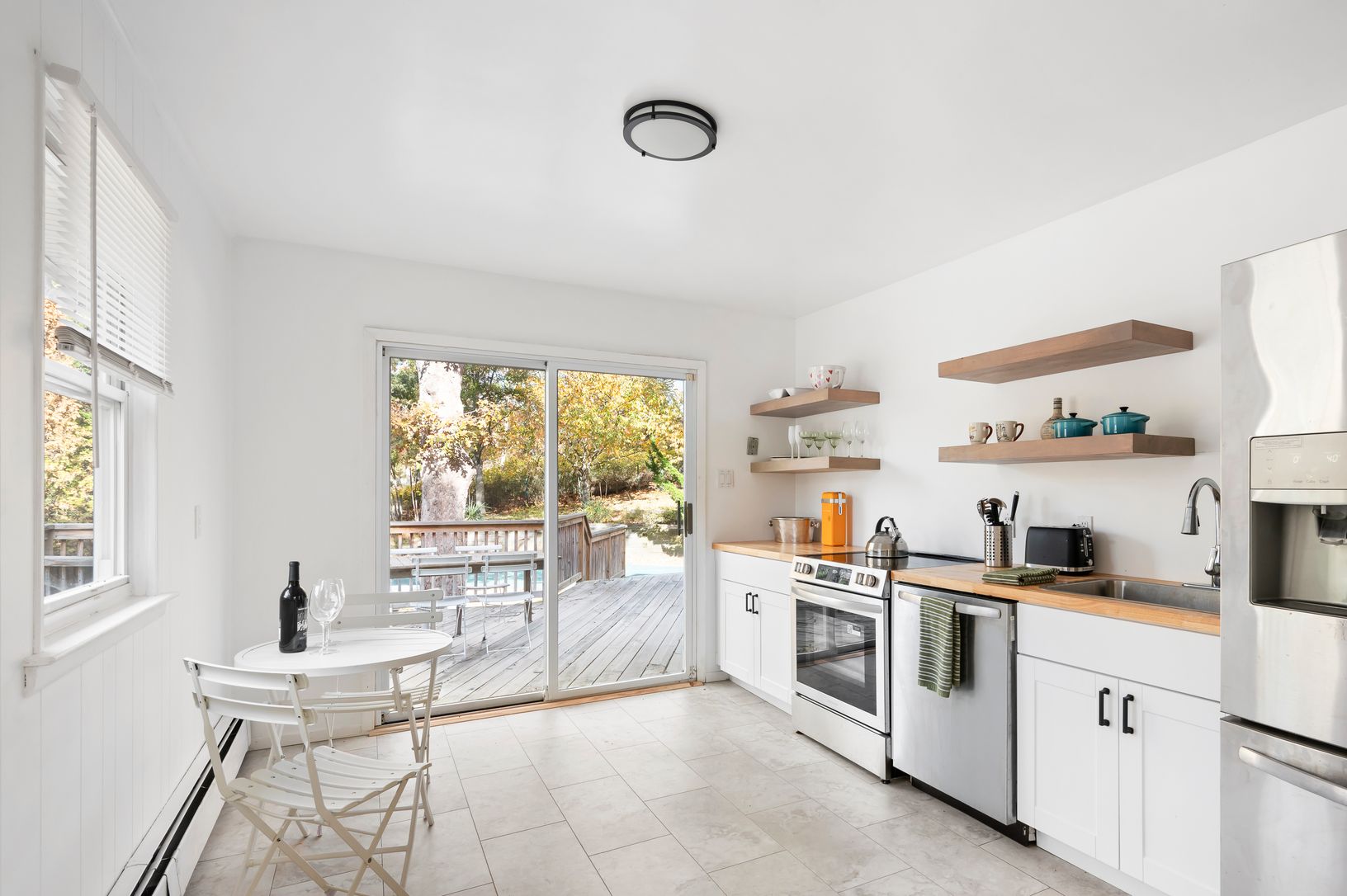 Just 600 feet from Shinnecock Bay, this well-appointed cottage is designed for effortless living. Step into a living room offering double-height ceilings and oversized windows that bring in plenty of natural light. Off the hall are two bedrooms and a full bath, while beyond the living room, the eat-in kitchen opens to the deck and rear yard with a heated pool-ideal for relaxed summer living. The second floor features an en suite bedroom and an