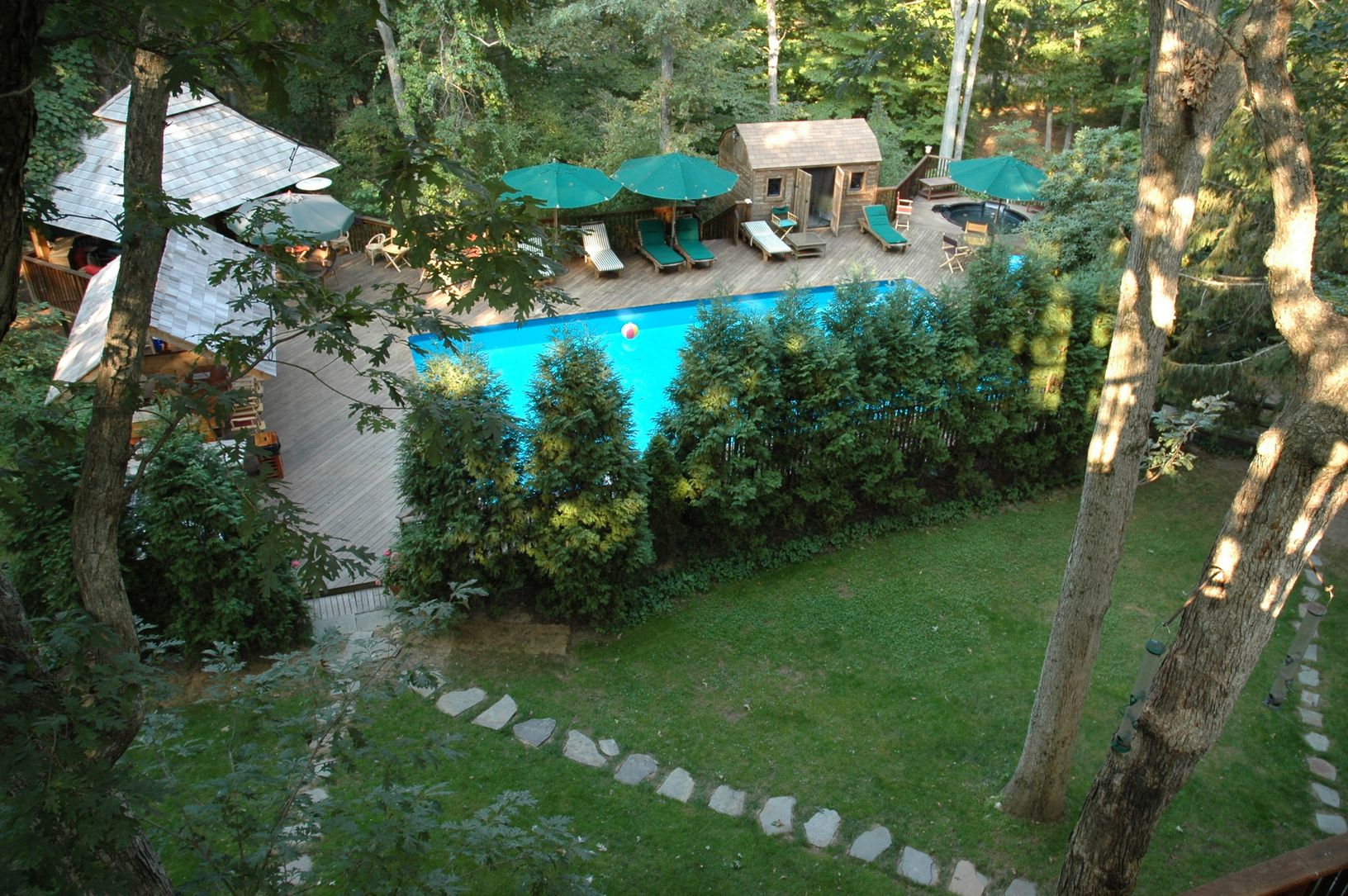 Tucked away on a 1.75 acre wooded lot lies this hidden gem. A two story post modern with five bedrooms, 4 full baths, powder room, fireplace, central air and heated pool. Lush landscaping with multiple decks. Great house, great location! Excellent rental history.