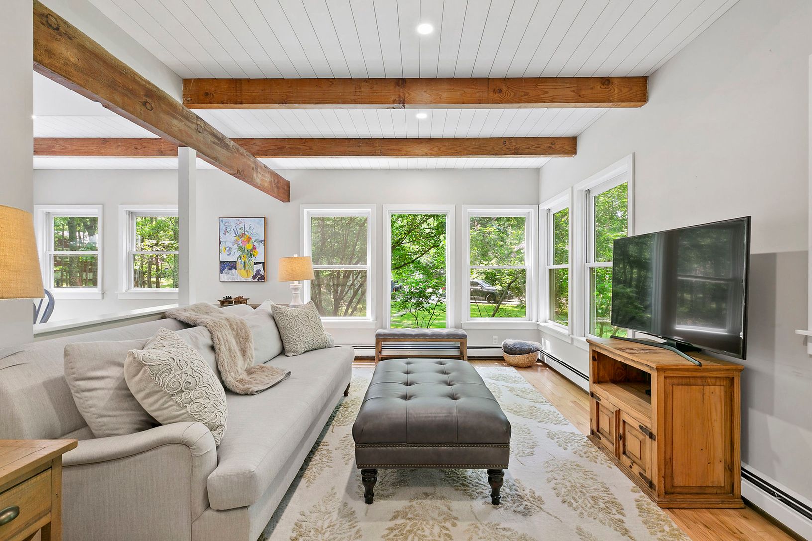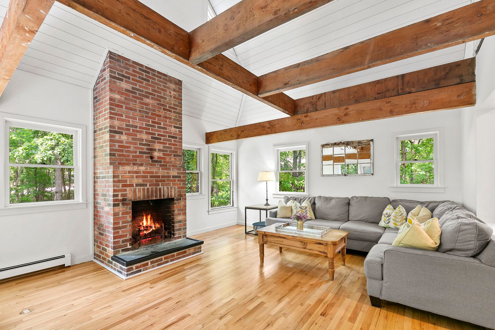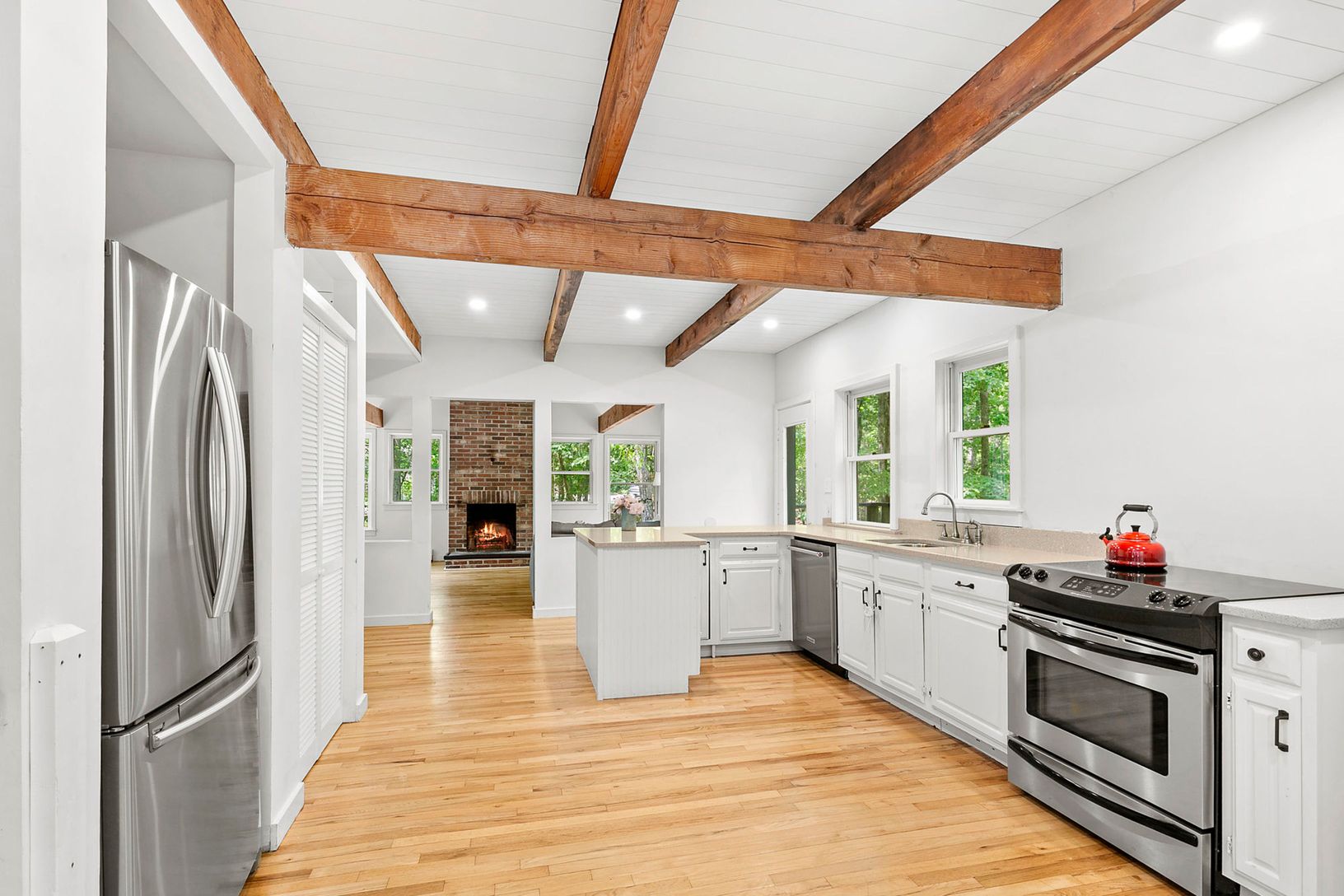 Fantastic opportunity under $1M! Timeless post and beam design with gorgeous structural support beaming throughout. Over 3,000 s/f of open living space. Features include open kitchen into vaulted great room with wood burning fireplace. Formal living room and separate dining room, easily convertible to a first floor en suite guest room. 4 bedrooms in place with room to expand, including vaulted master bedroom with en suite, two vaulted gue