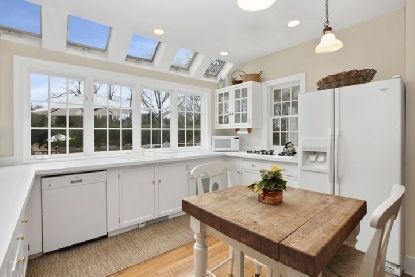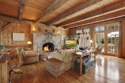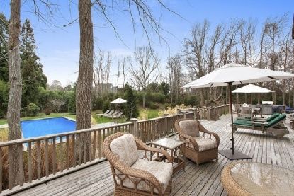 The main section of the house is of "Post and Beam" construction. There are fireplaces in both the living room as well as the master bedroom. There is a large deck on three sides, with a screened porch and teak furniture. The first floor features a large living room, dining room, foyer w
