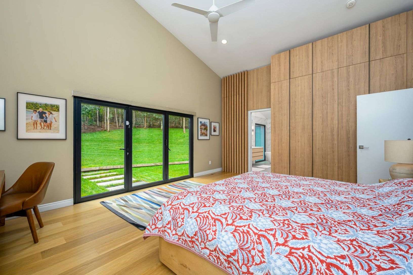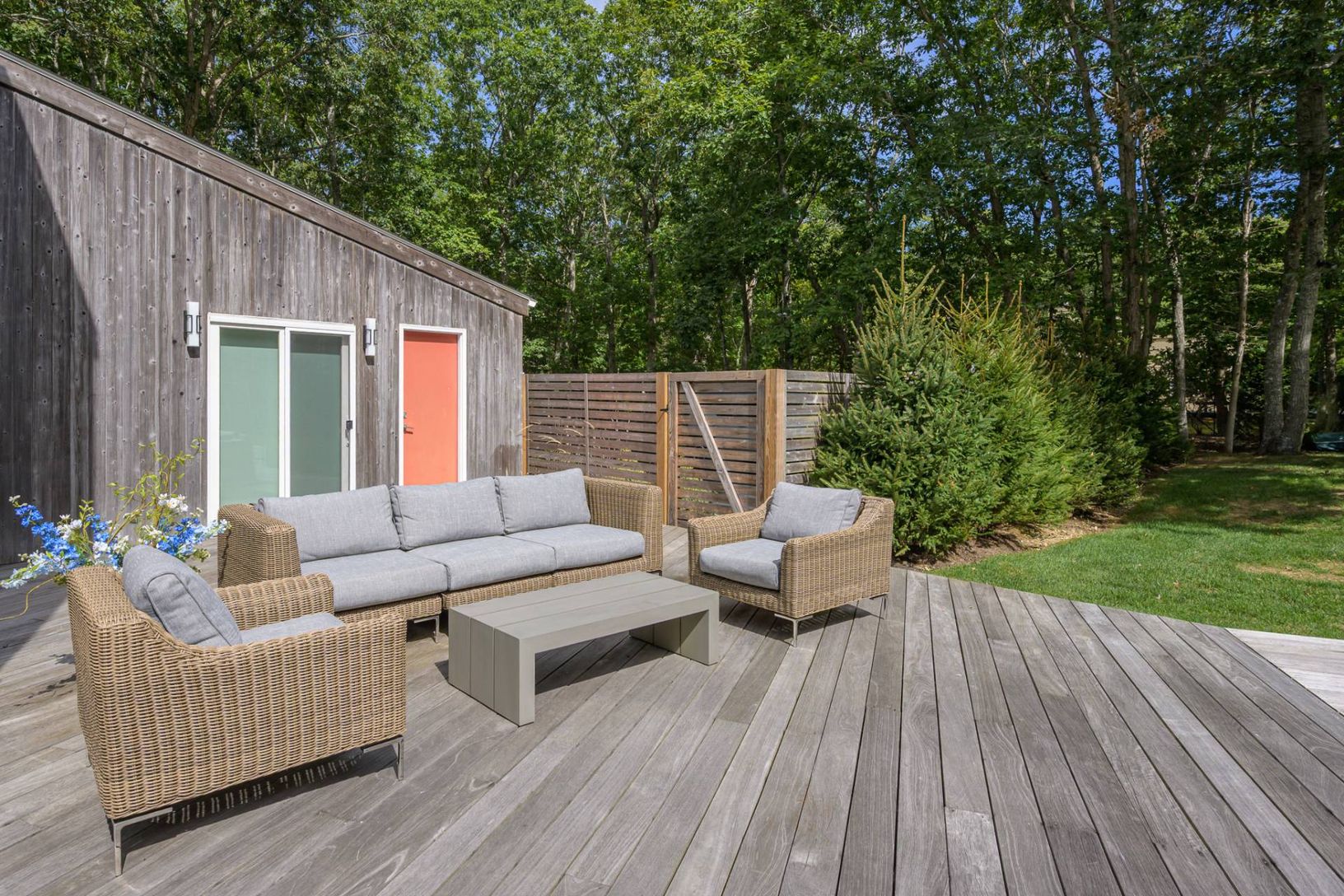 Private and quiet, set back approximately 340 feet off Noyack Road. Experience great summer living in this contemporary home bathed in sunlight, featuring an expansive lawn and a large deck surrounding an inground heated pool. This spacious home boasts four bedrooms, including a primary bedroom with an en suite and a guest bedroom with an en suite. Two additional bedrooms share a bath, perfect for family or guests. The open floor plan creates