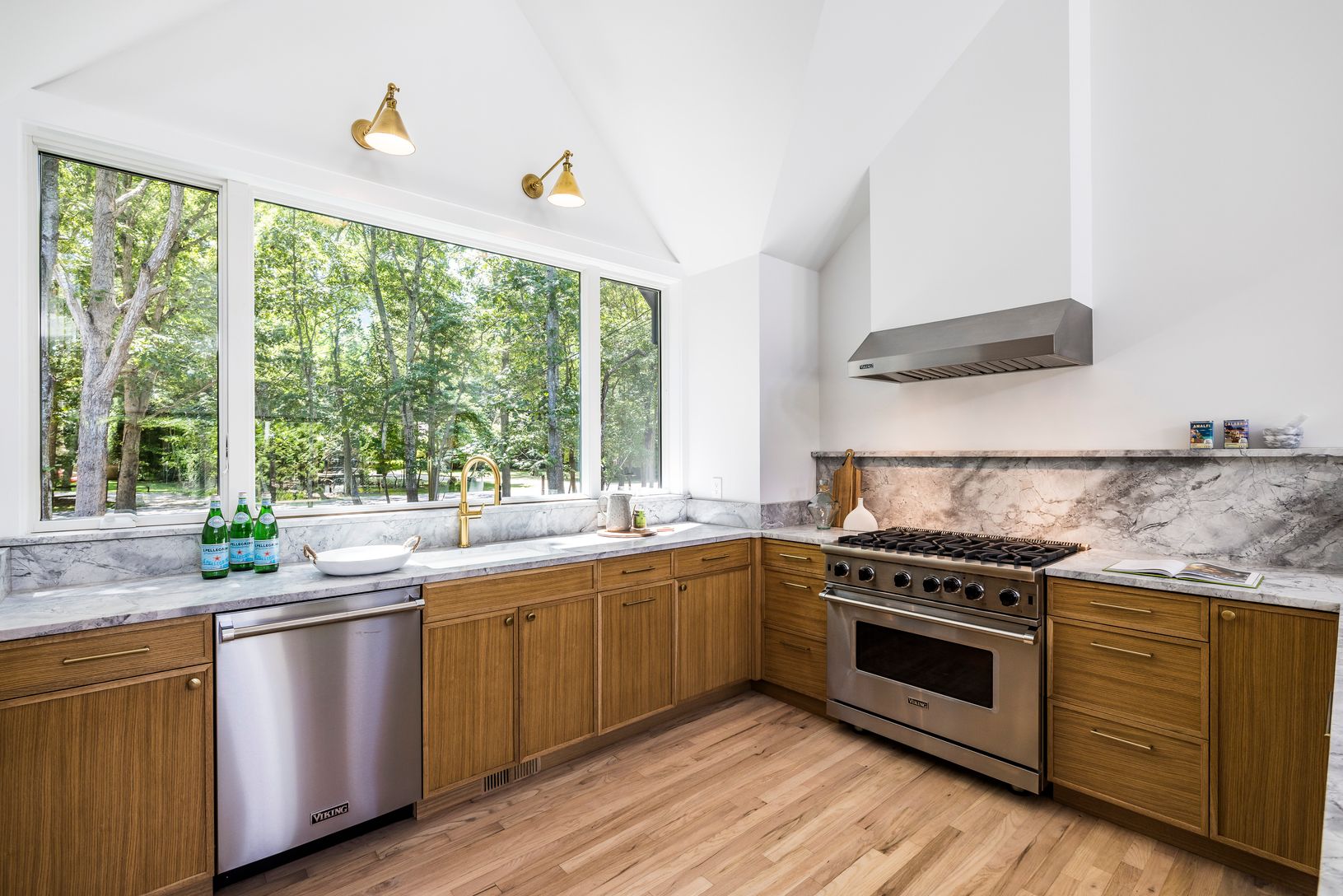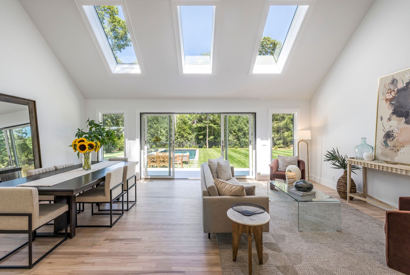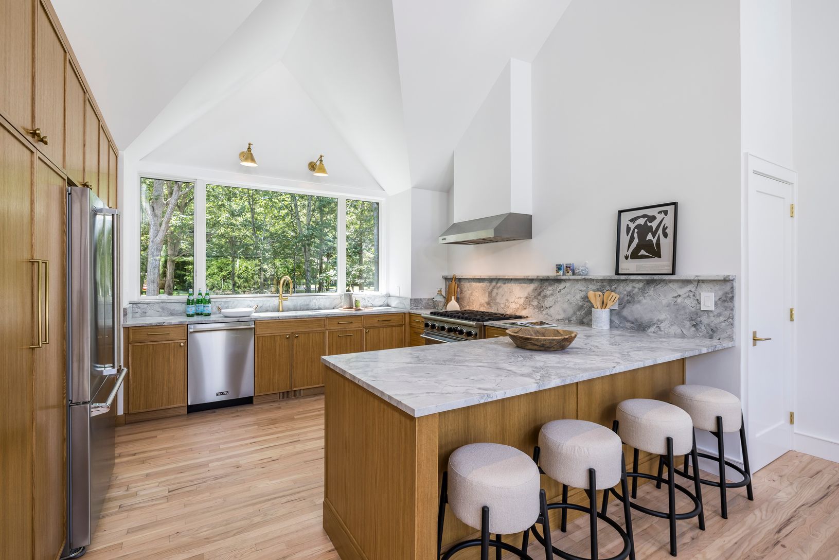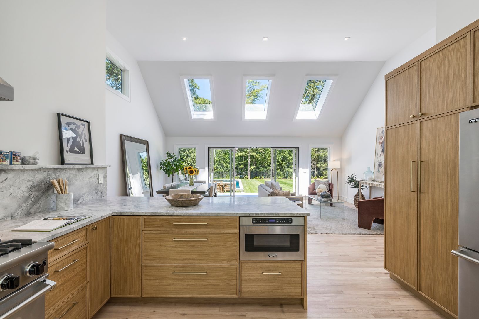 Natural light floods through the brand-new windows, highlighting the high-end finishes and open concept living area, complete with white oak cabinets, quartzite surfaces, and top-of-the-line Viking applia