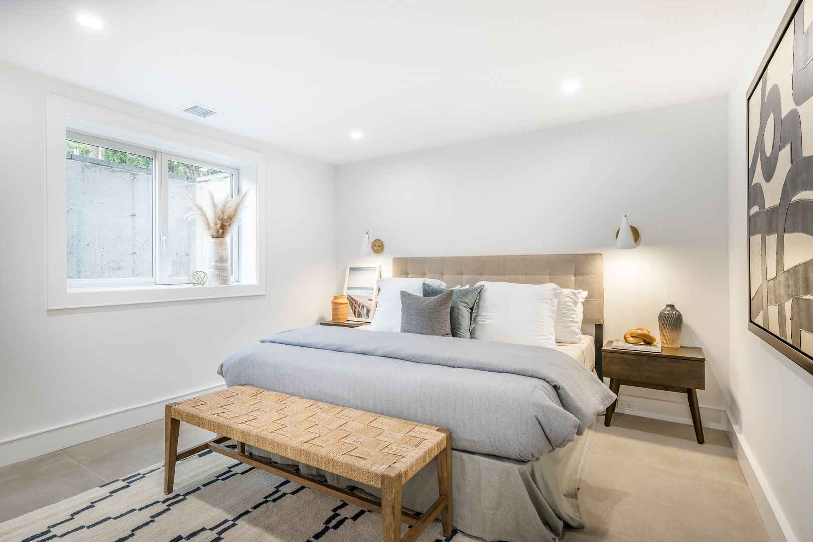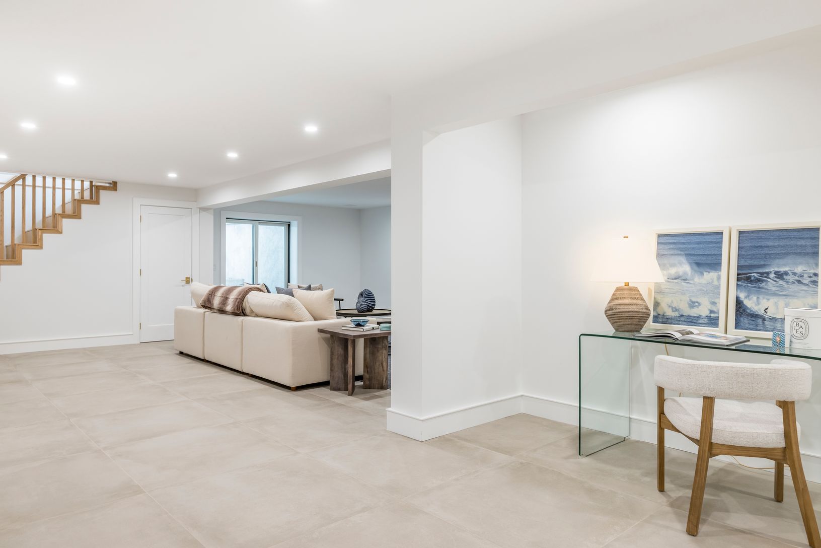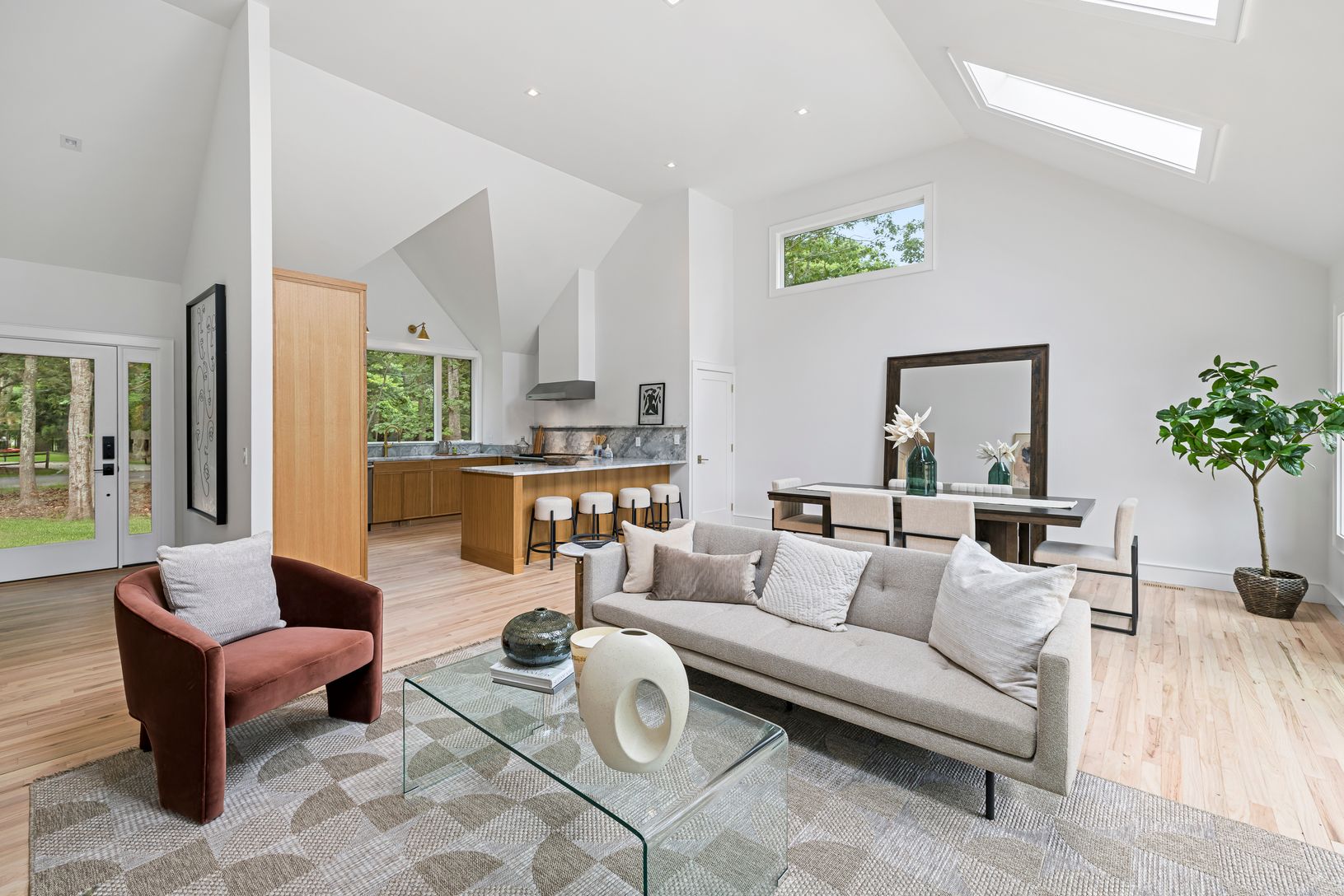 Natural light floods through the brand-new windows, highlighting the high-end finishes and open concept living area, complete with white oak cabinets, quartzite surfaces, and top-of-the-line Viking applia