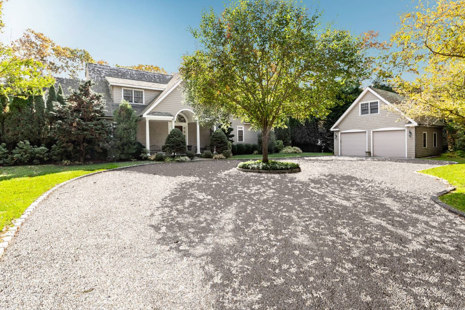 South of the highway in East Hampton, this gated traditional is situated on a very private 1.2 acres, with broad lawns and surrounded by mature trees. Set amid beautiful landscaping, the home includes five bedrooms and three and a half baths, with two bedrooms and a full bath on the first floor, and the master suite and two additional bedrooms sharing a bath on the second floor. The full basement is currently unfinished. Outdoors enjoy the hea