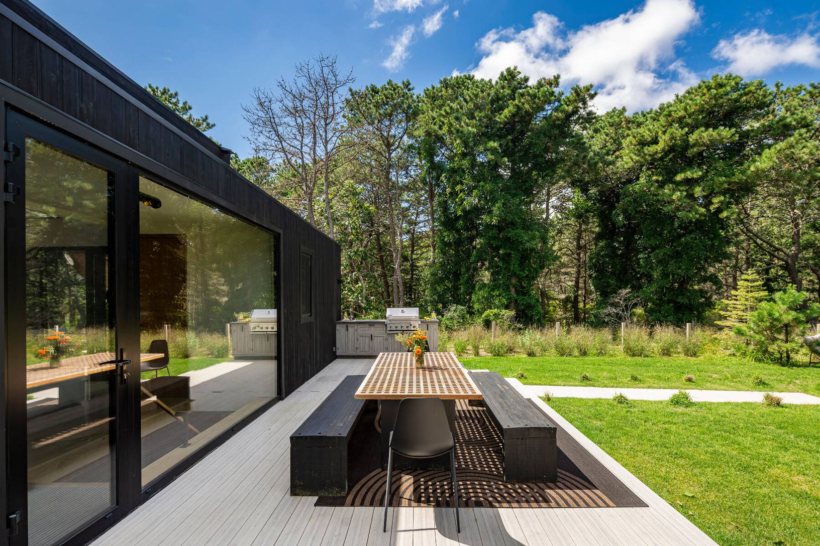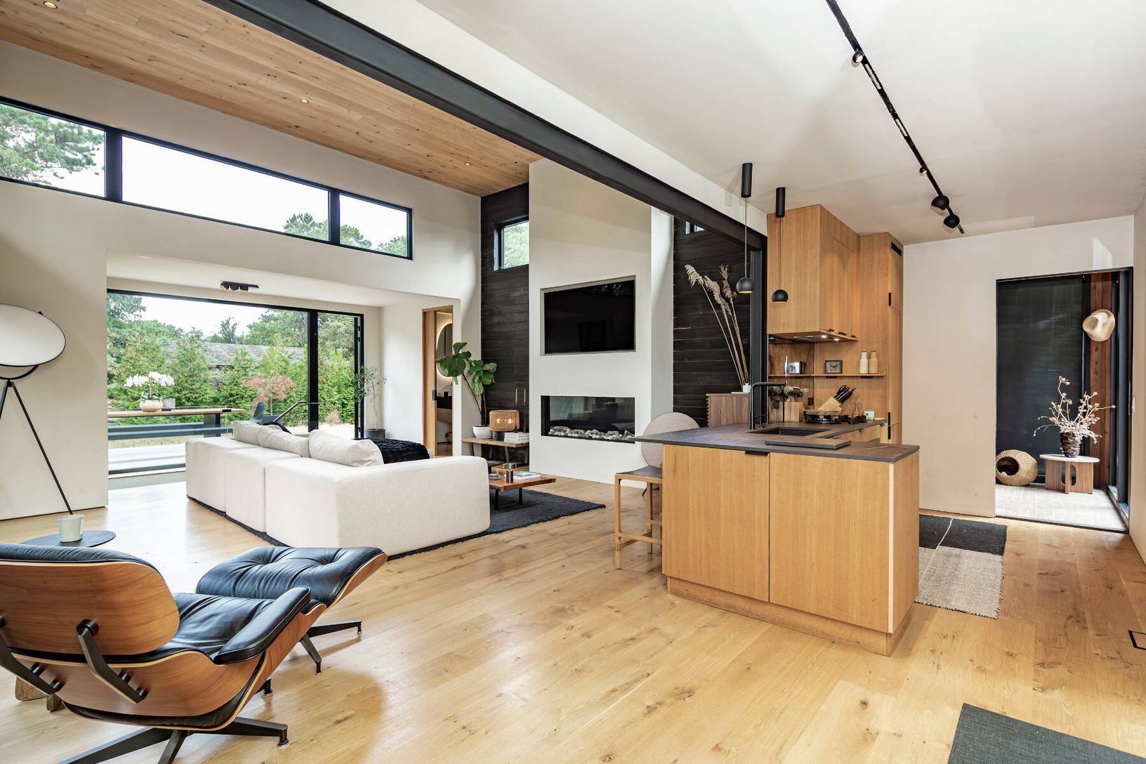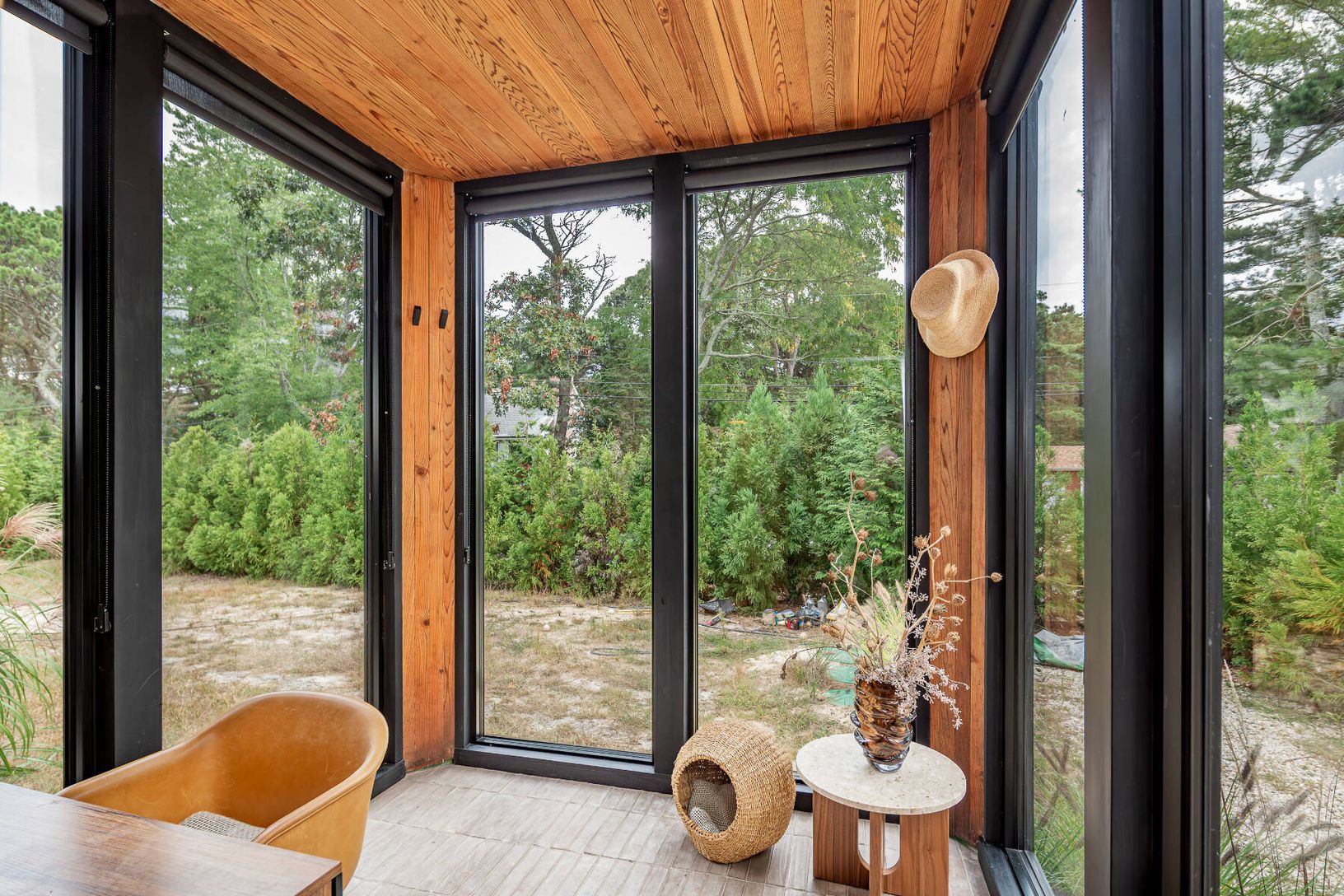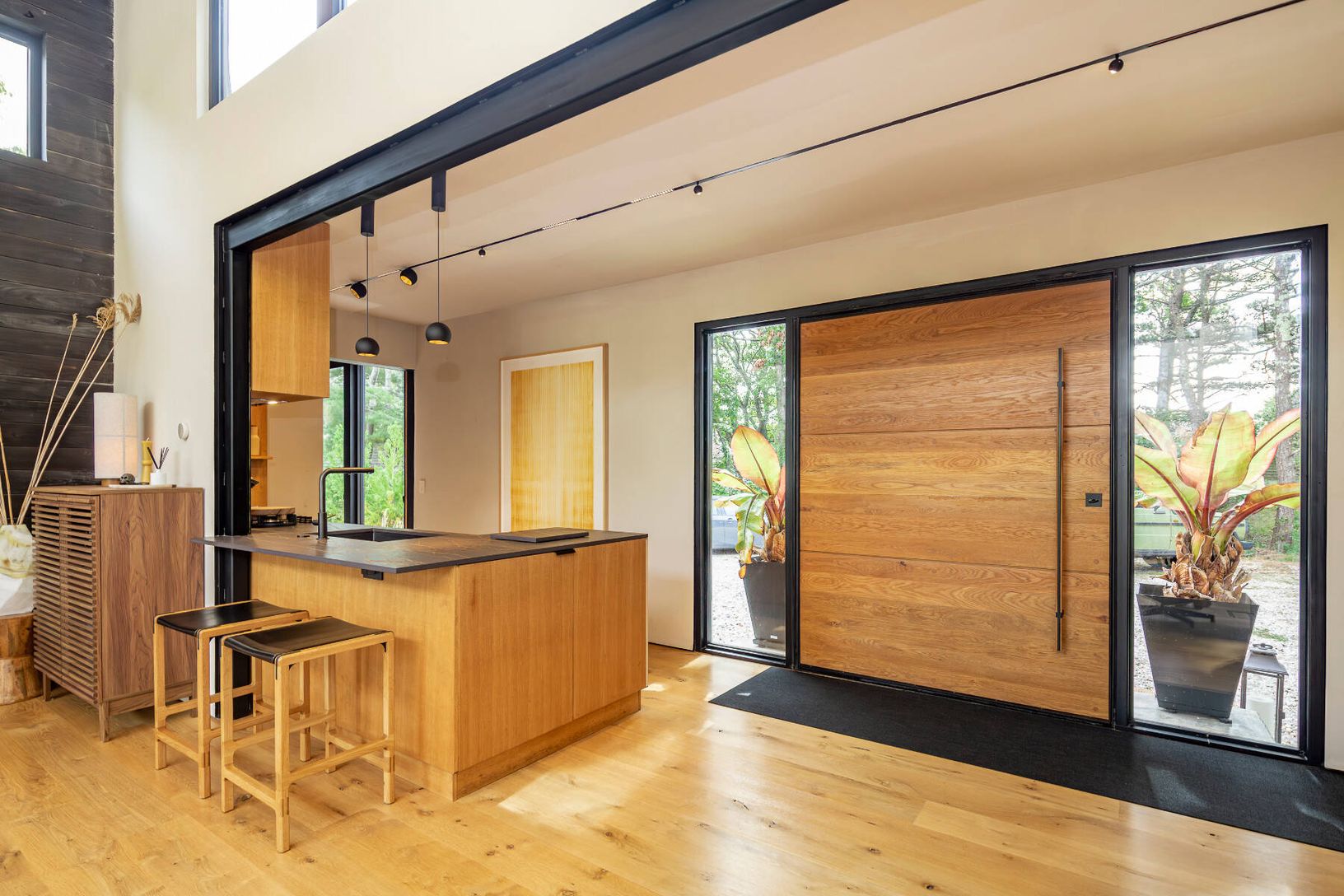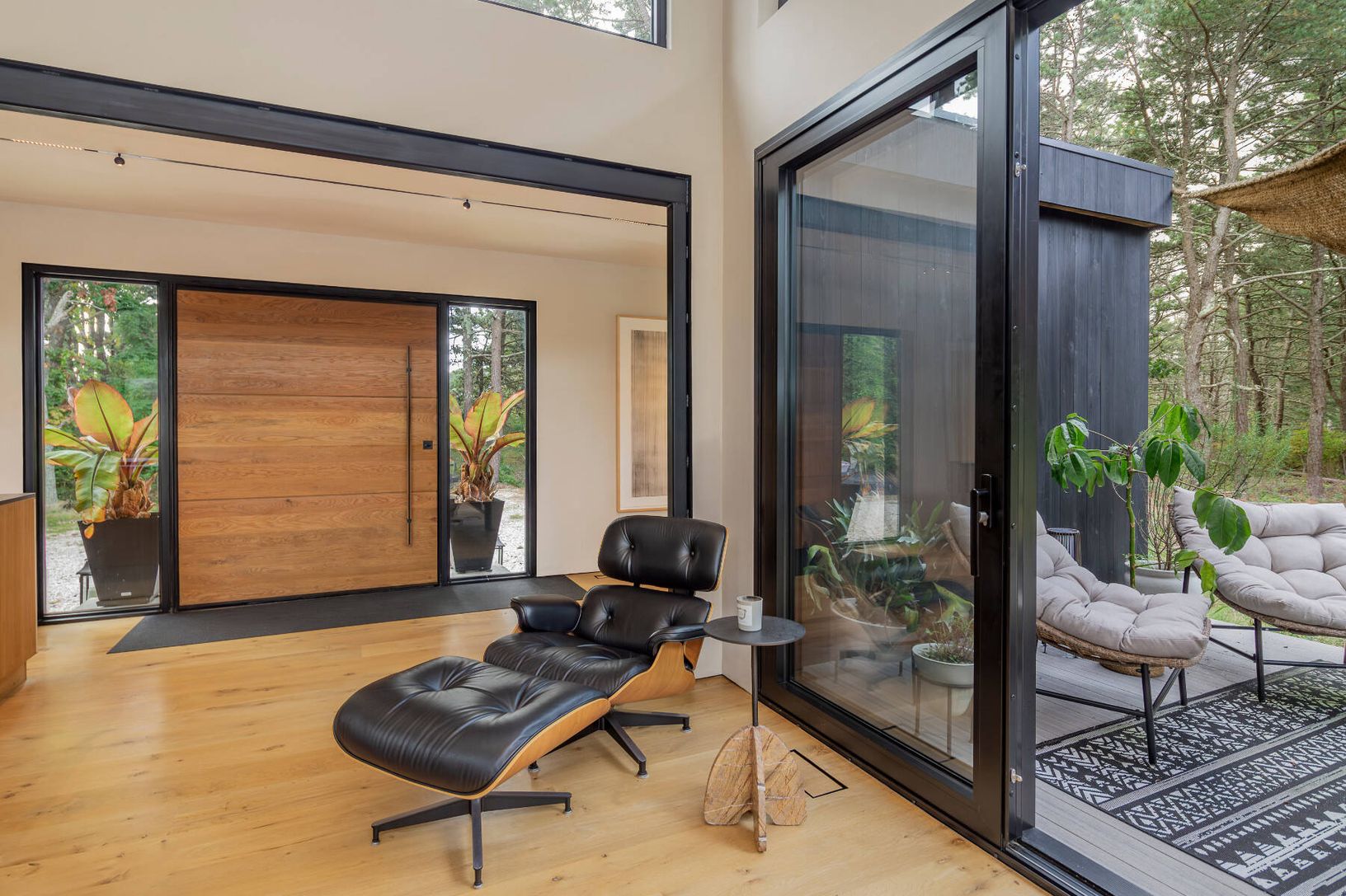 This tastefully designed, custom-built modern home in Amagansett epitomizes thoughtful architecture, blending nature with minimalist interiors and flooding the space with natural light. Expansive windows and a retractable sliding glass wall provide a seamless mix of privacy and openness, while custom woodworking and high-end finishes elevate every detail. Enter through a floor-to-ceiling teak door into a zen-like oasis. The main living area, w