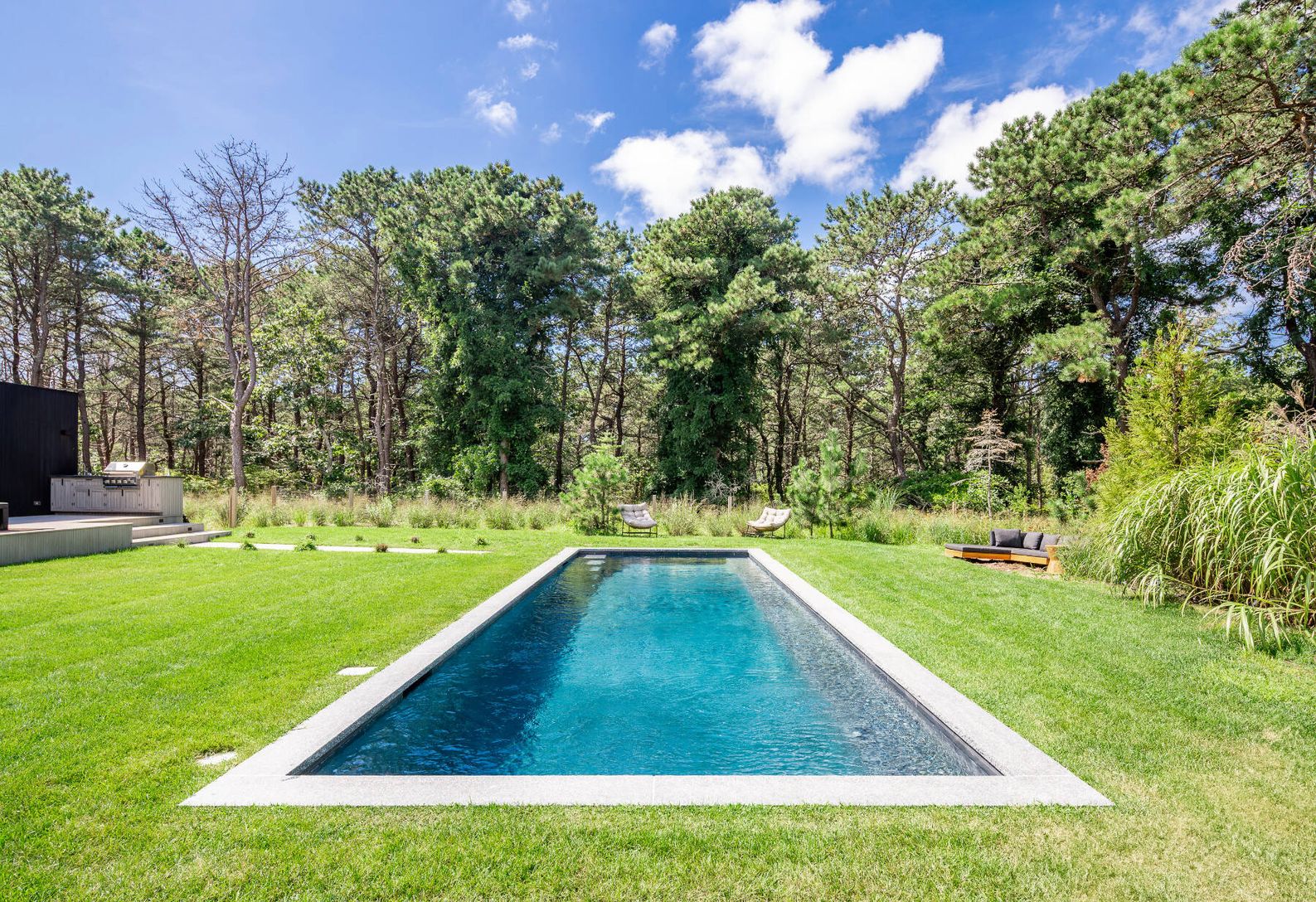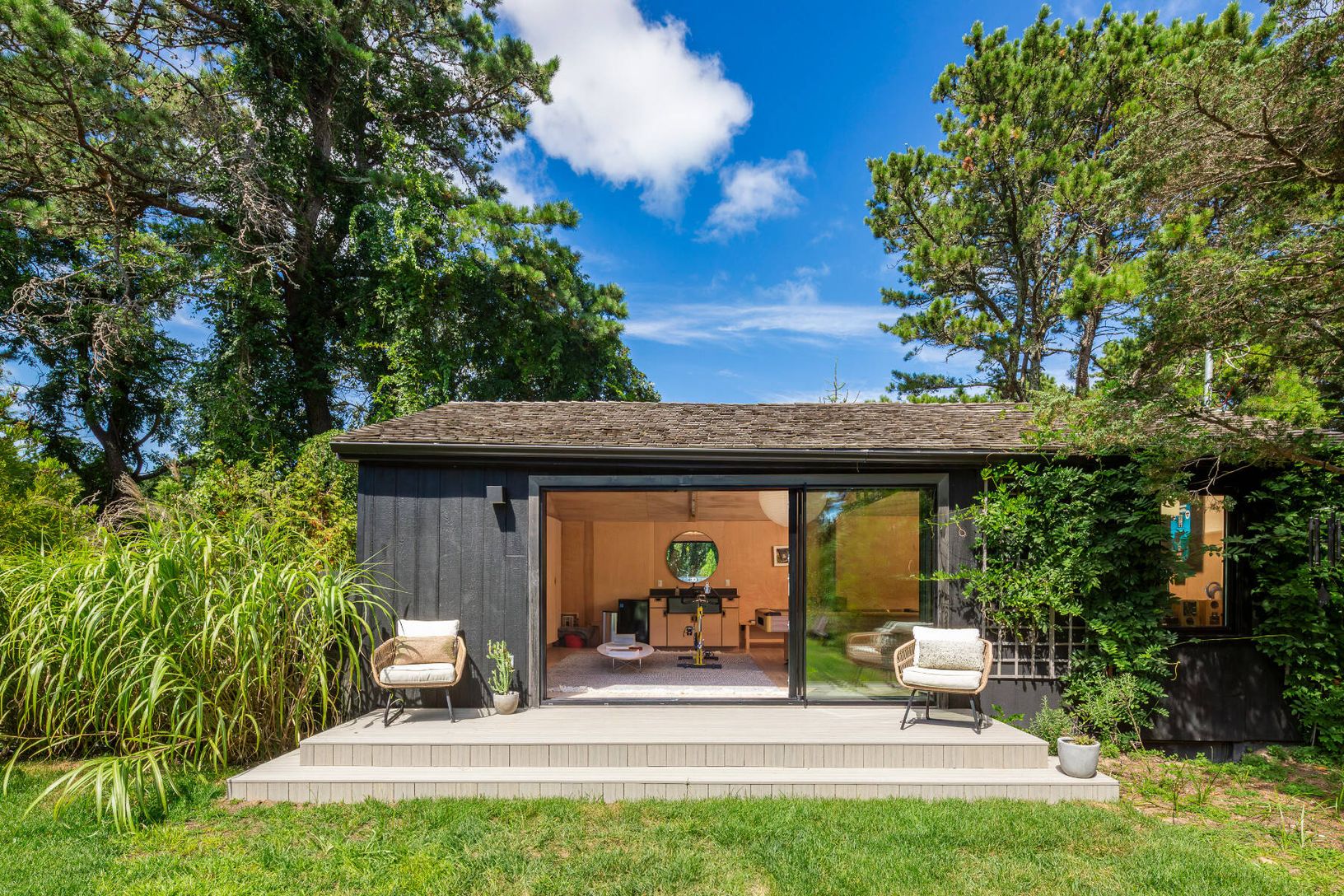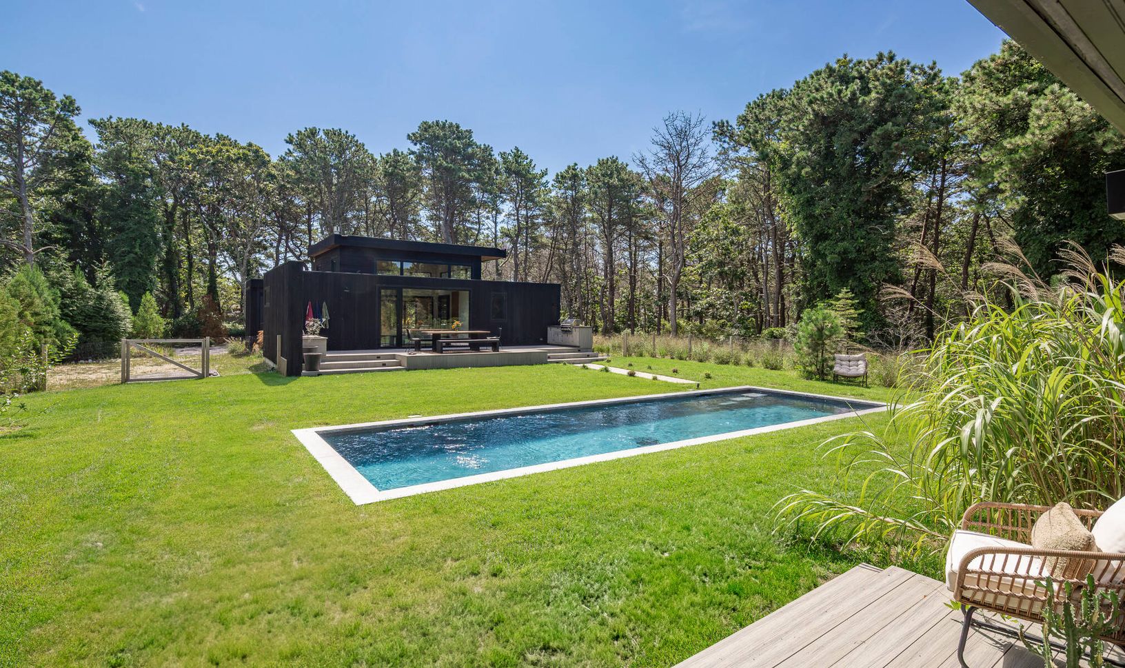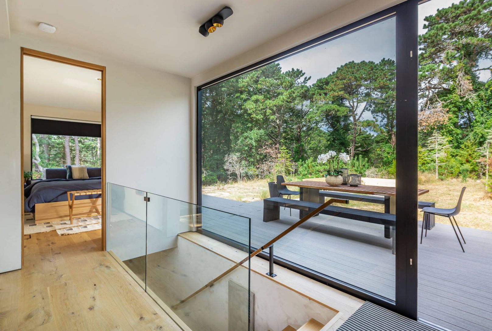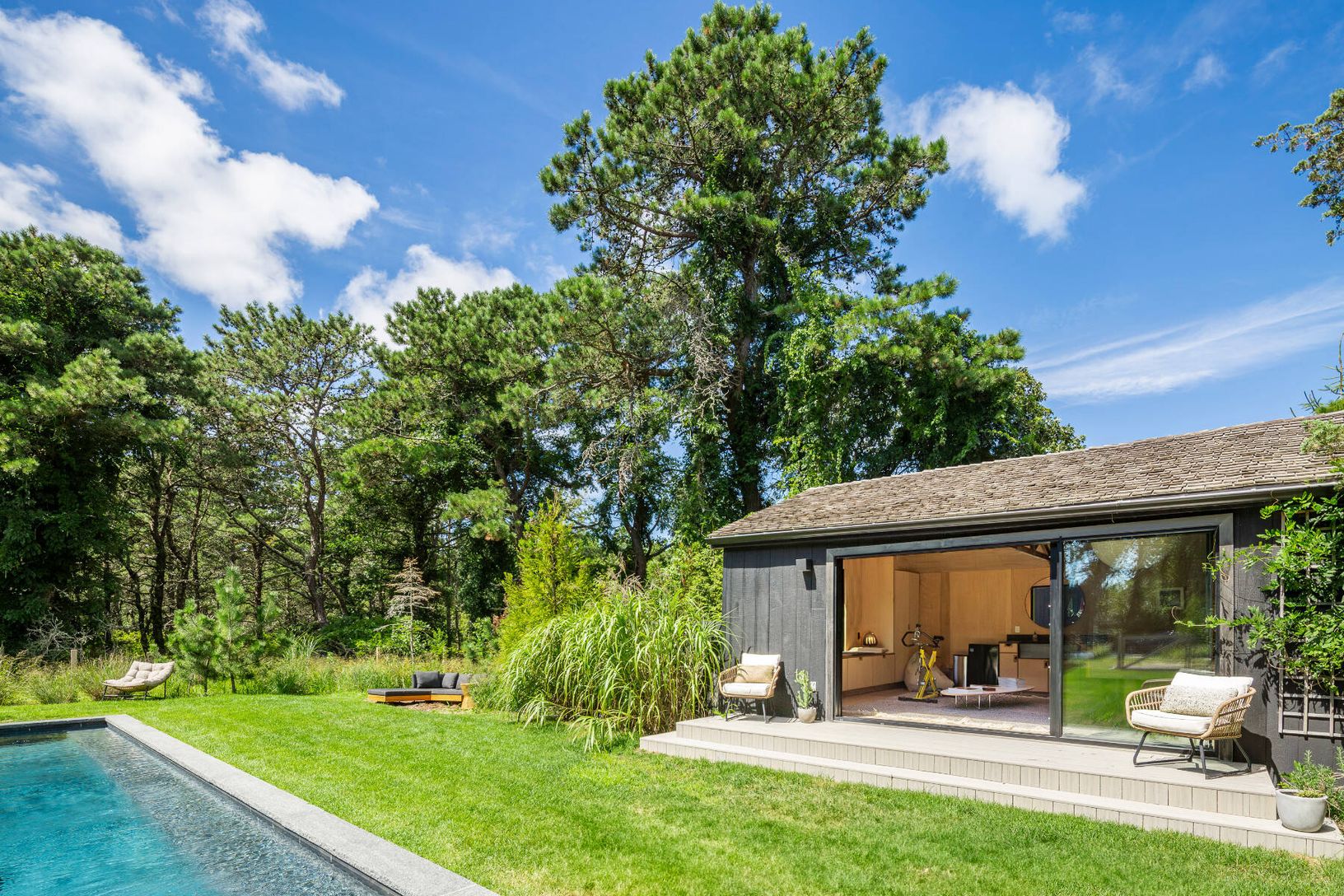 This tastefully designed, custom-built modern home in Amagansett epitomizes thoughtful architecture, blending nature with minimalist interiors and flooding the space with natural light. Expansive windows and a retractable sliding glass wall provide a seamless mix of privacy and openness, while custom woodworking and high-end finishes elevate every detail. Enter through a floor-to-ceiling teak door into a zen-like oasis. The main living area, w
