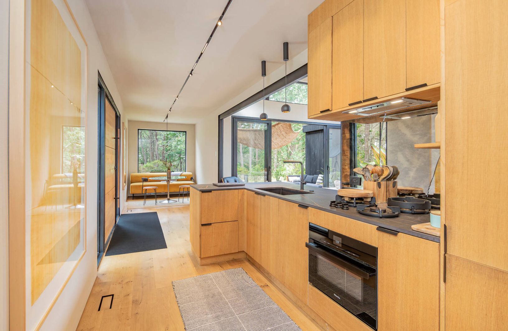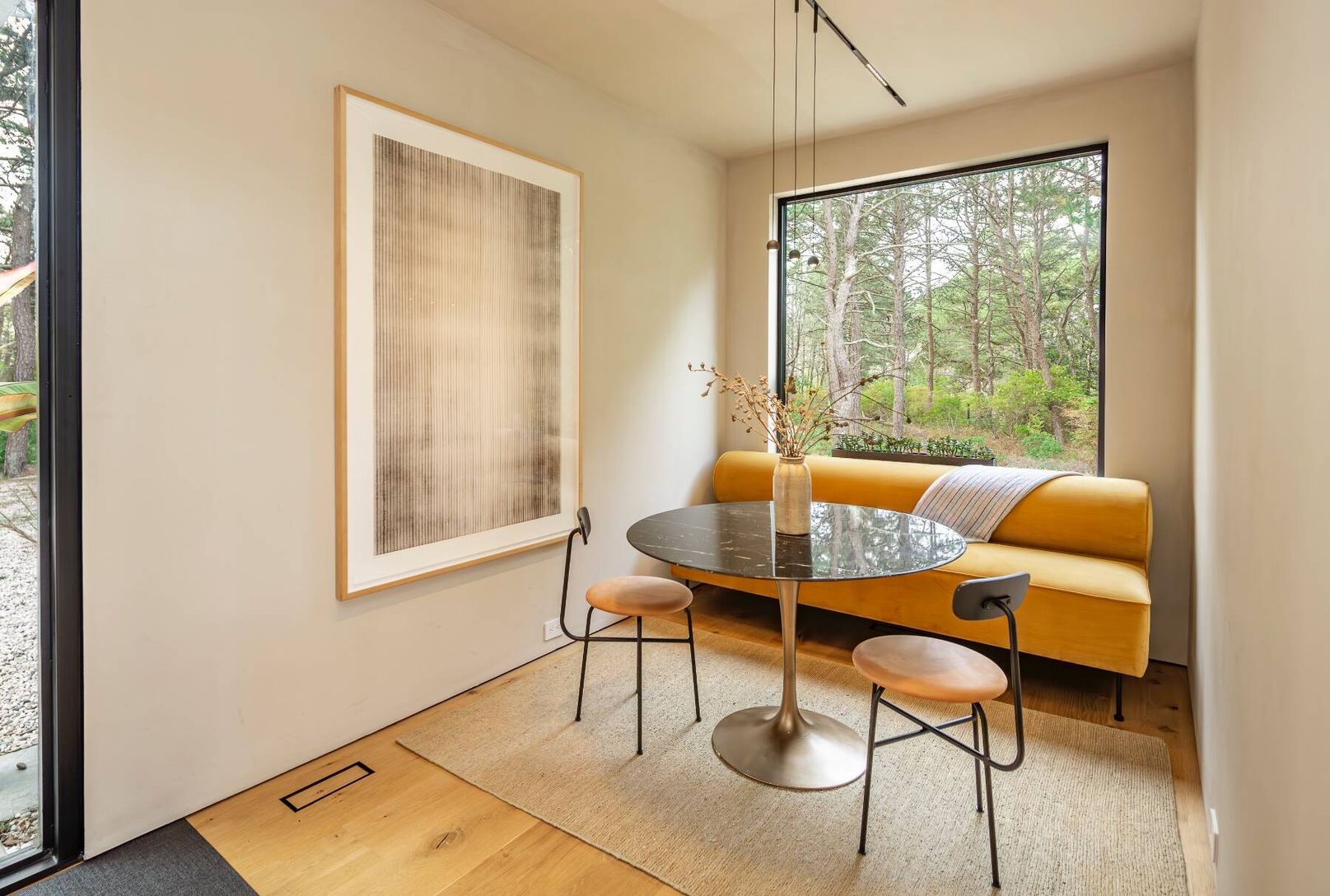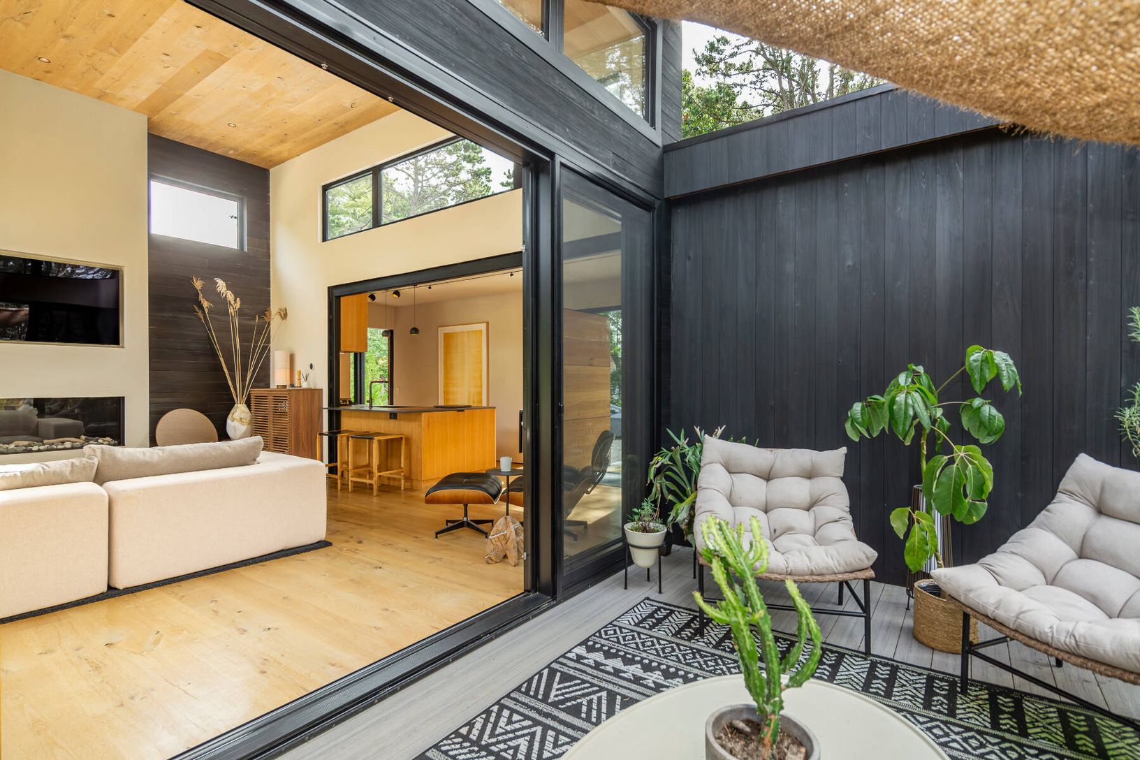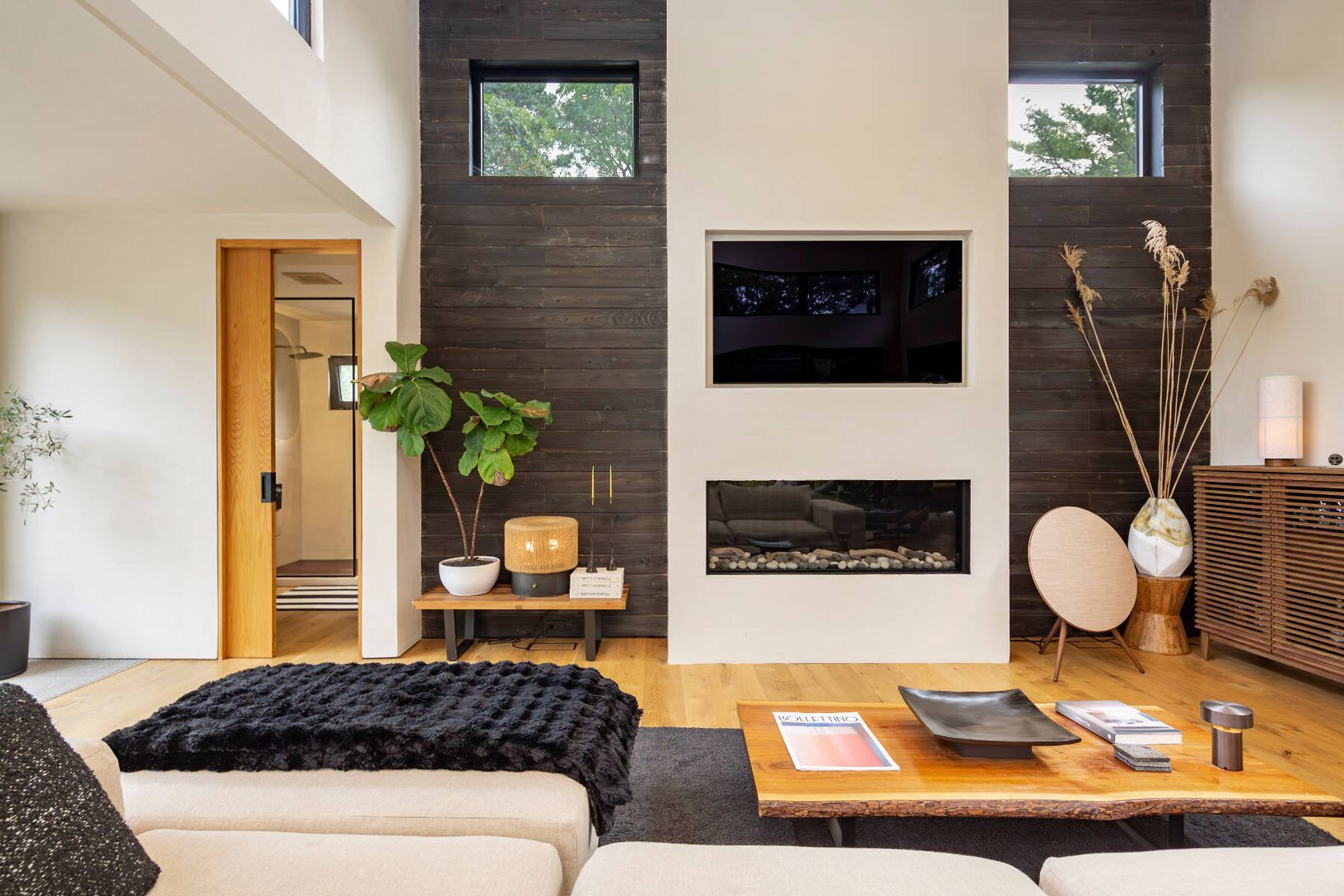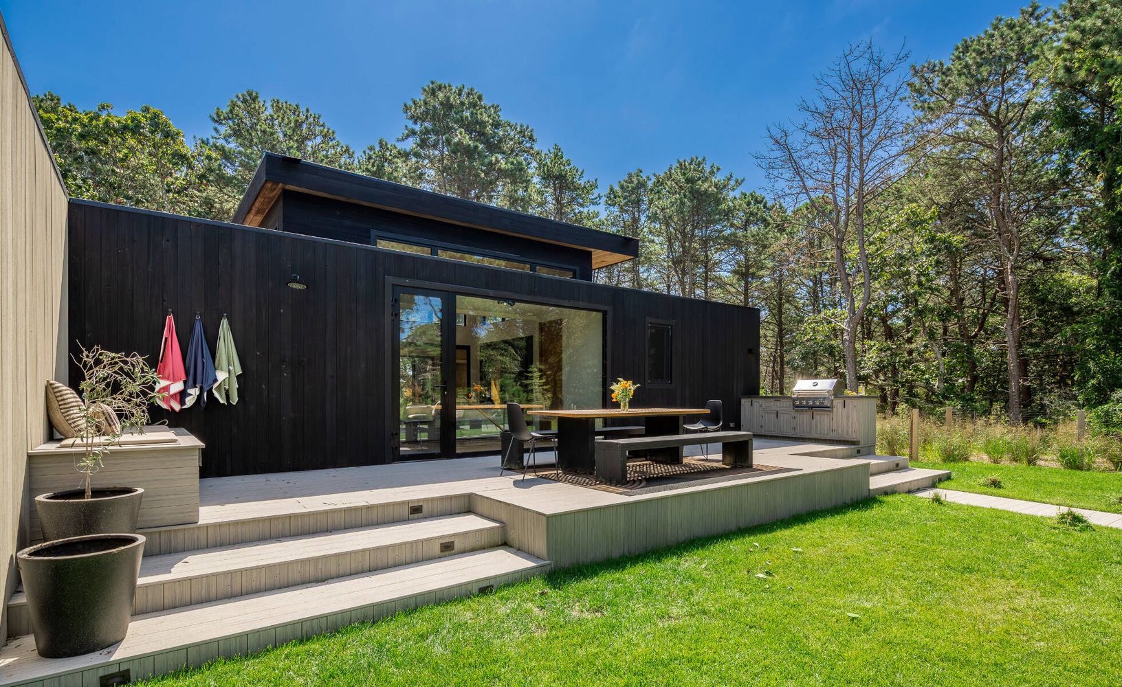 This tastefully designed, custom-built modern home in Amagansett epitomizes thoughtful architecture, blending nature with minimalist interiors and flooding the space with natural light. Expansive windows and a retractable sliding glass wall provide a seamless mix of privacy and openness, while custom woodworking and high-end finishes elevate every detail. Enter through a floor-to-ceiling teak door into a zen-like oasis. The main living area, w