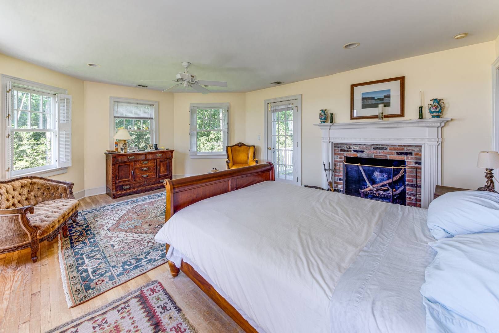 "Summer Breeze" is an elegant traditional Hamptons home. Enjoy sweeping southerly vistas across the neighboring equestrian farm and beyond to Mecox Bay from the covered front porch. A large, light filled foyer with a guest bath leads to the living room with an abundance of south facing windows and oversized wood burning fireplace. The den/office is located on the first floor as well as a junior en suite bedroom. The country kitchen has high ce