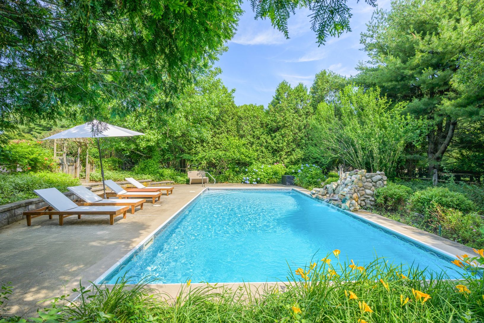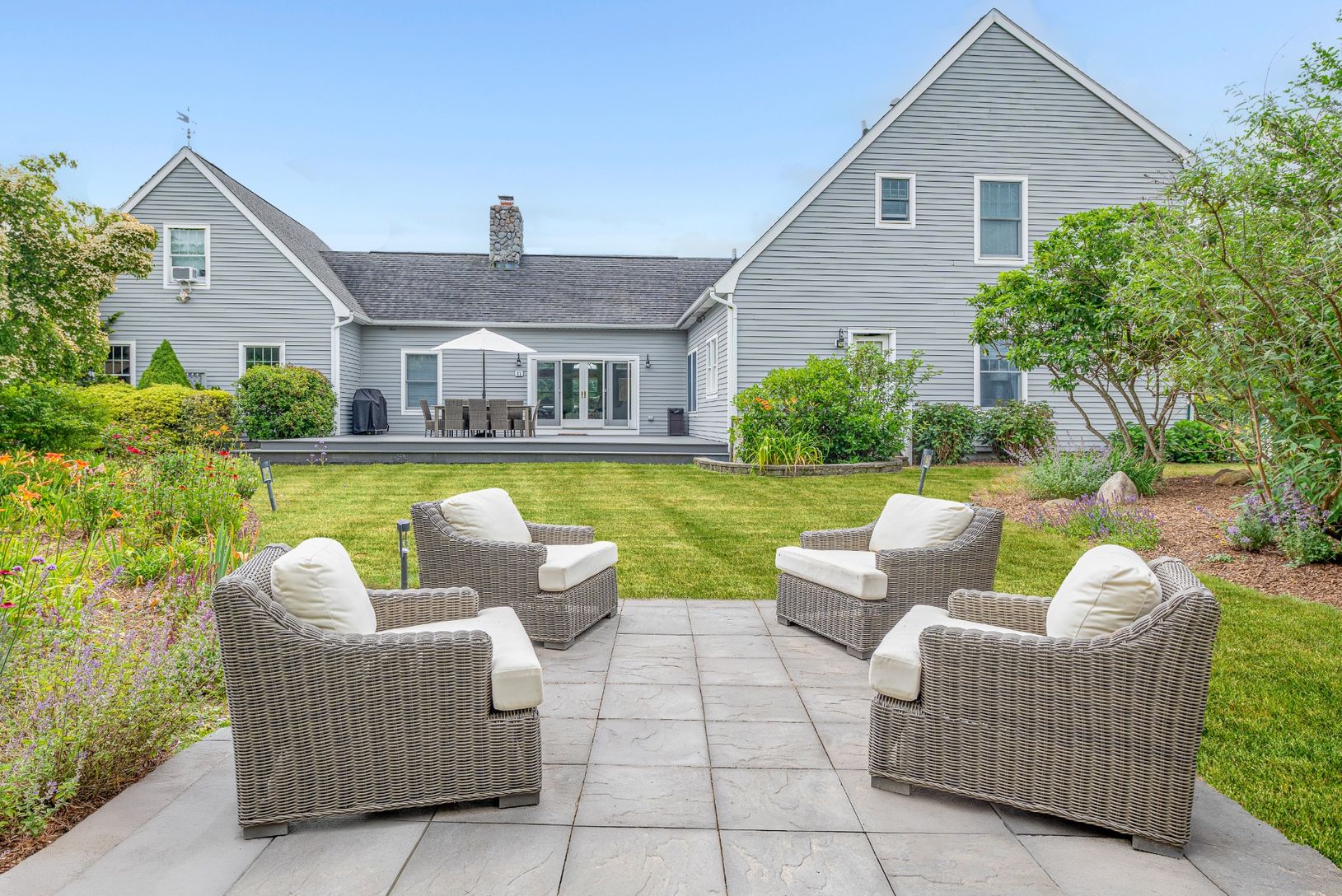 This 4,000+/- sq. ft. traditional is set on 1.4+/- acres, located on the Southampton Village fringe, minutes from the center of the village and ocean beaches. Many stunning perennial gardens surround all that this property offers: a heated pool with a waterfall and ample lounging space, a fire pit, a very large lawn area for entertaining and playing, two decks, and a stone patio sitting area set among the gardens. Recently refreshed along with