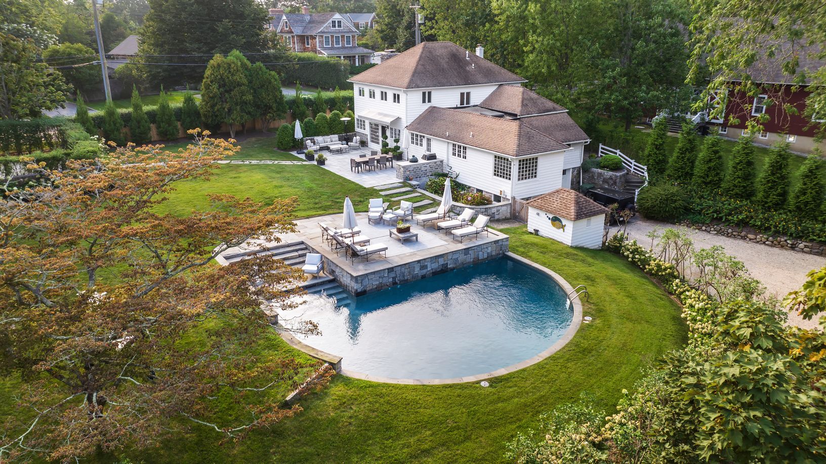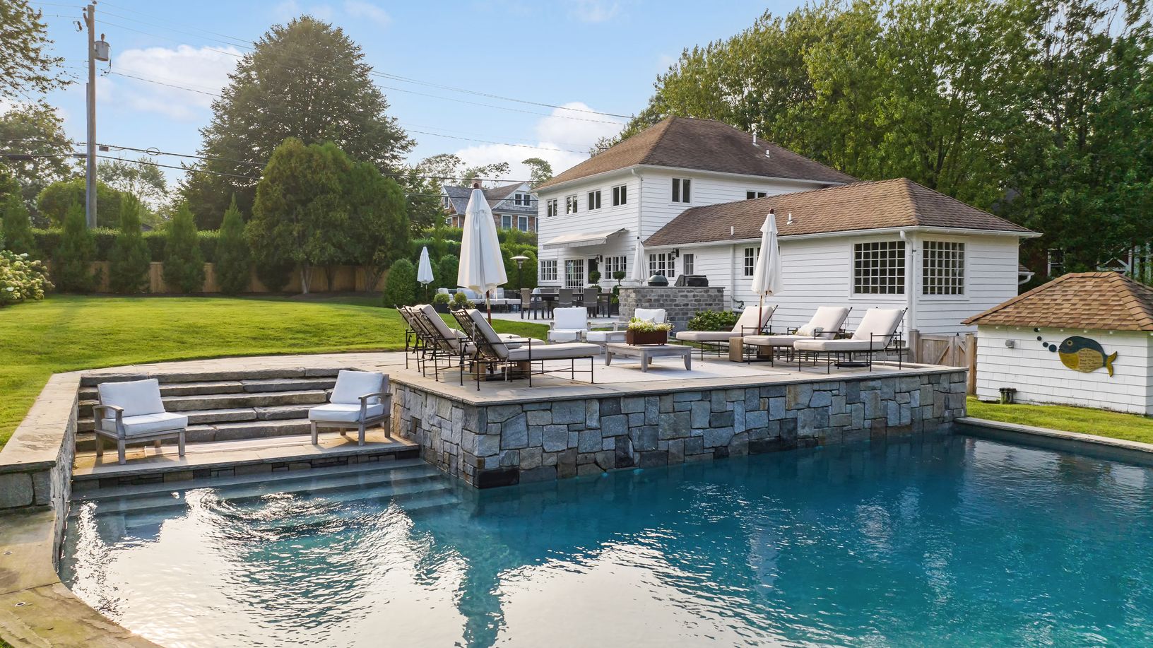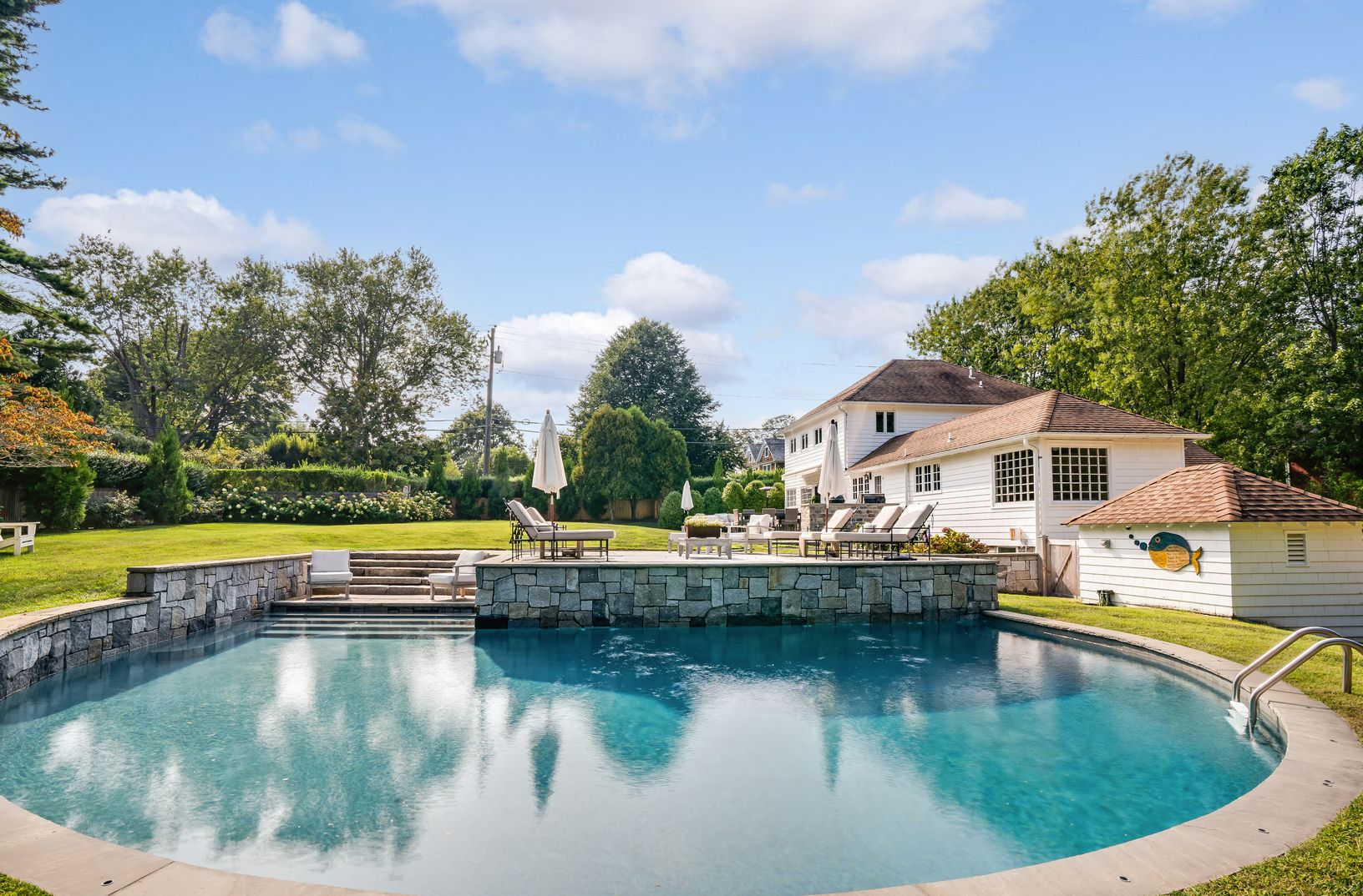 This tastefully renovated 1940s farmhouse, seamlessly blends the timeless charm of yesteryear with modern sophistication. A sweeping driveway gracefully winds its way along the perimeter of the grounds, offering ample parking for guests near the main entrance and leading to the convenient one-car attached garage. Pass through the gate and discover a captivating outdoor oasis, complete with two inviting bluestone patios, a heated gunite pool, a