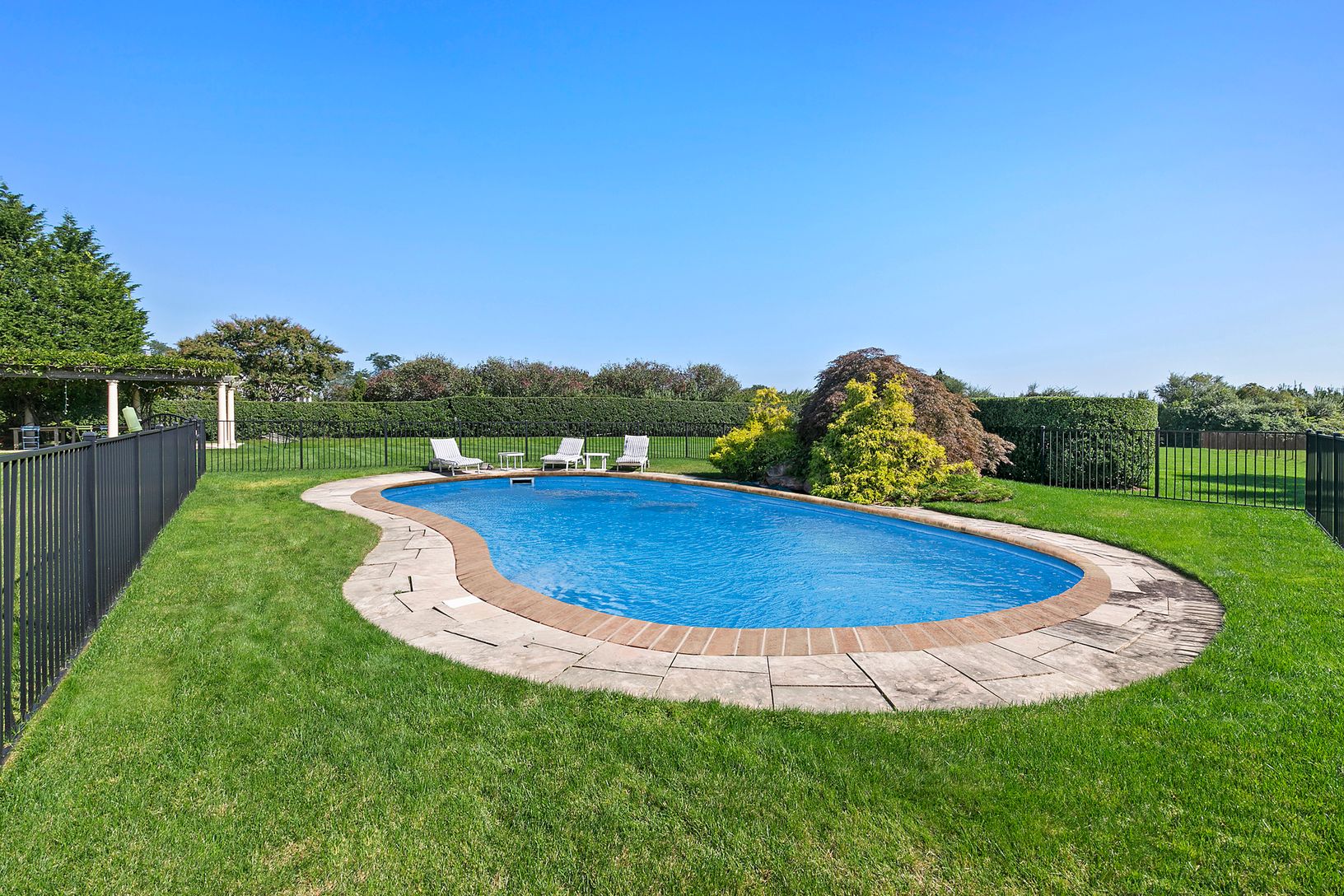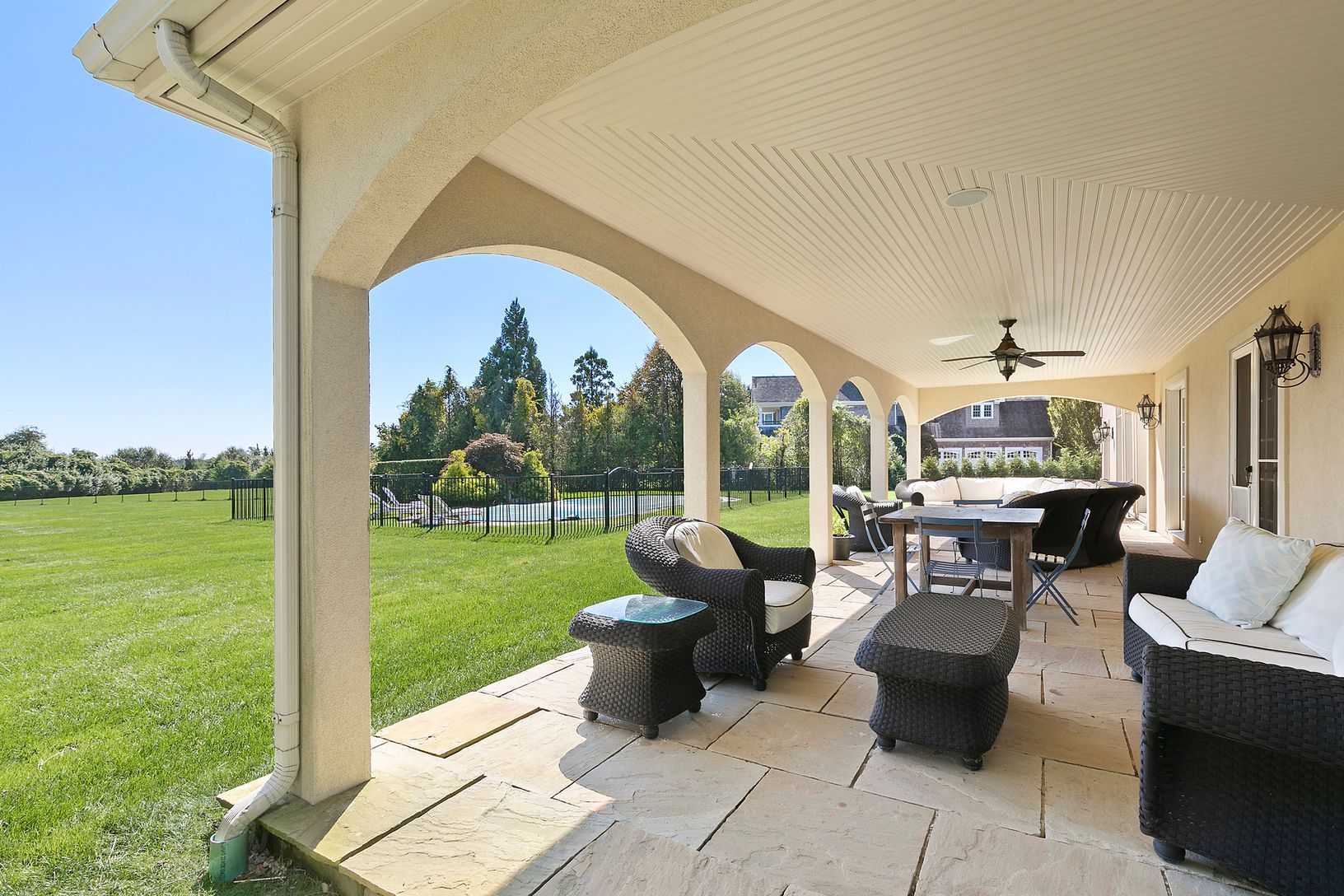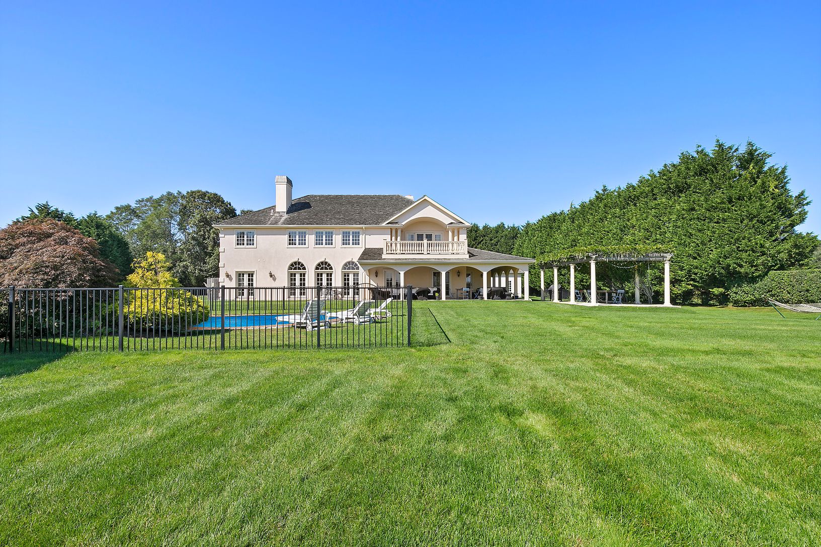 Situated at the end of a long driveway with gated entry sits this magnificent manor with 5 bedrooms, 3 full baths and 2 half baths, heated gunite pool on 1.68 +/- acres of privacy in a luxurious setting. Upon entering you are greeted by a spacious foyer with double height living room, wood burning fireplace with French doors leading to the expansive back yard. The main floor also includes a formal dining room with doors leading to the back c