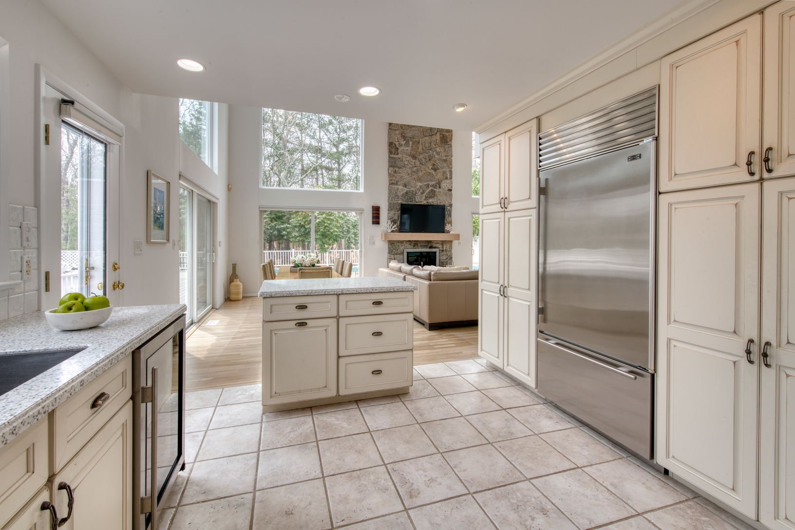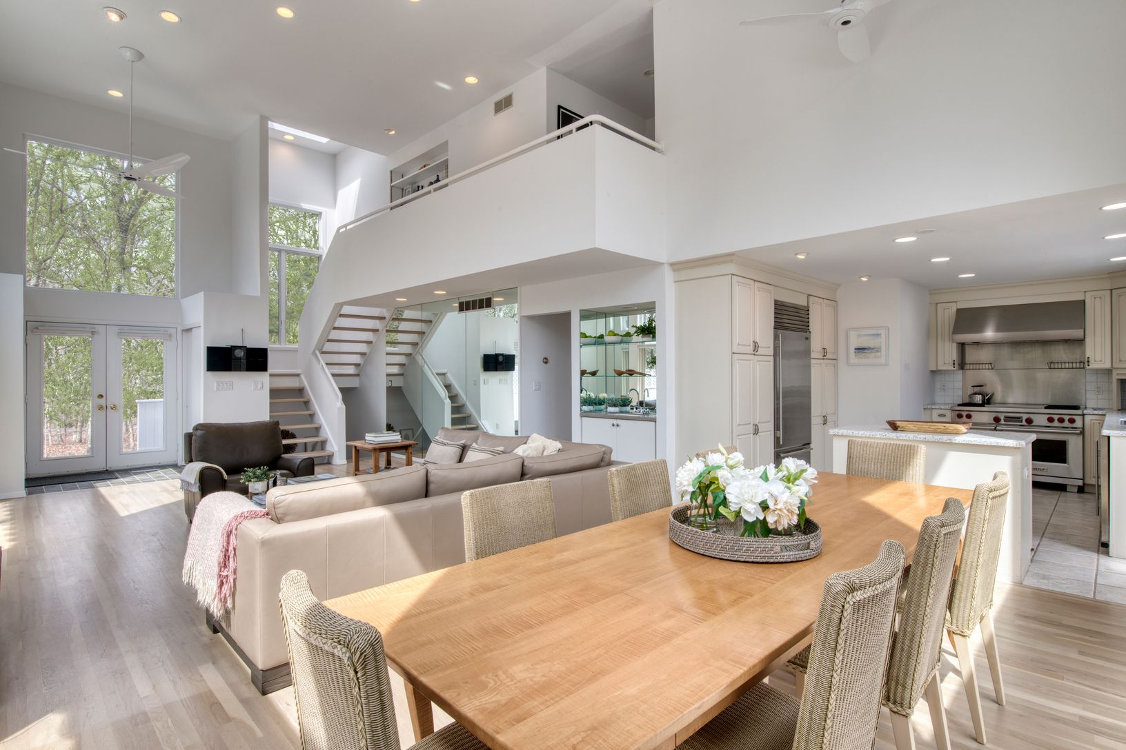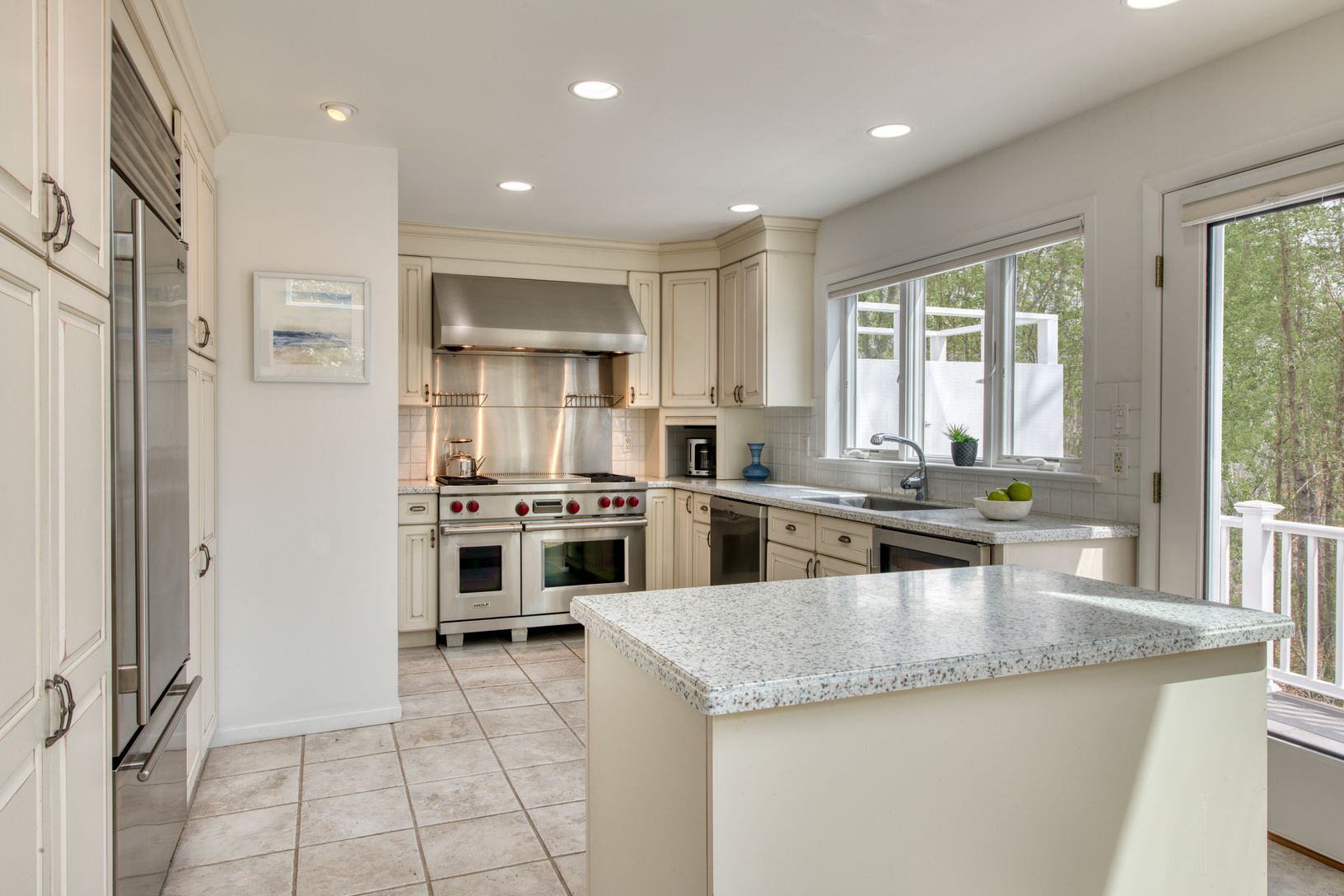 Dramatic light filled contemporary residence is well located at the end of a cul de sac only 7 minutes to Main Street and ocean. The open floor plan includes a grand living and dining area with floor to ceiling stone fireplace, lofted ceilings, and walls of glass overlooking .97 acres of privacy. The renovated chef's kitchen has custom cabinetry, granite countertops, Wolf stove and SubZero refrigerator. There is an updated powder room and wet