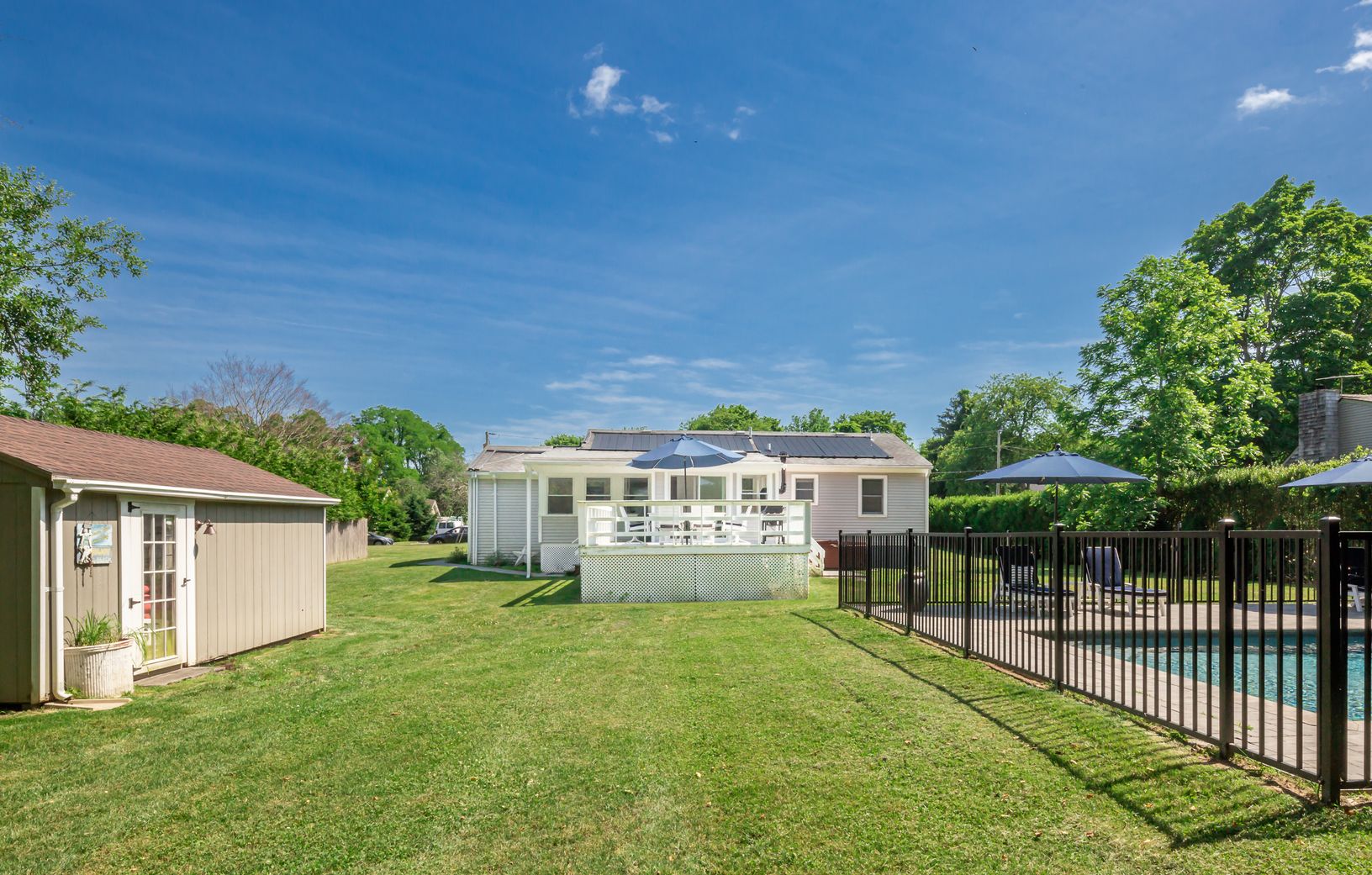 This lovely 3 bedroom and 2 bath home has been fully renovated, open living space with kitchen and dining area, sun room which leads out to deck, three bedrooms and two baths, large finished basement level with TV area, office space, full bathroom, laundry room and stairs out to pool area with new solar heated pool. A great place to spend your summer!