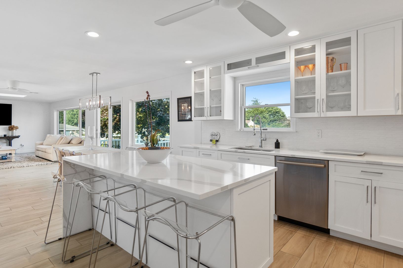 Get ready to be blown away! Picturesque water views encompassing your own 50 ft of bulkhead. Newly renovated throughout. Prof. eat-in-kitchen with center island and separate dining area overlook the perennial gardens. The pool house will set your imagination wild. Three very well-proportioned bedrooms and two newly renovated bathrooms. Sunroom off primary bedroom is a show stopper.