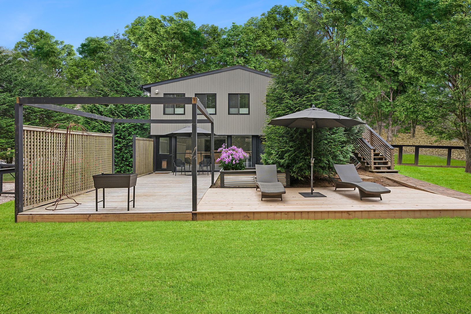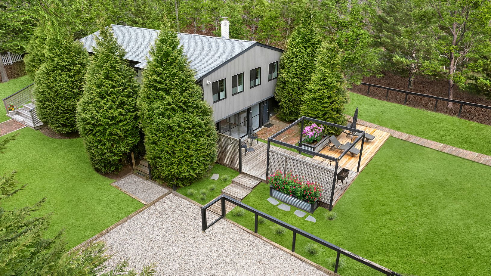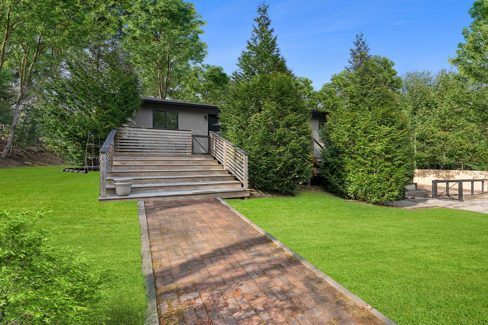 Away from major through streets, 17 Mulford is its own little oasis while maintaining convenient access to EH village and bay beaches. A private owners suite offers a separate entrance and private deck while two guest bedrooms share a bath. The finished basement is configured as gym/recreation area with a 3rd bath, office and wet bar. This lower level opens onto a partially covered deck with sliding glass doors capturing South/Eastern exposure