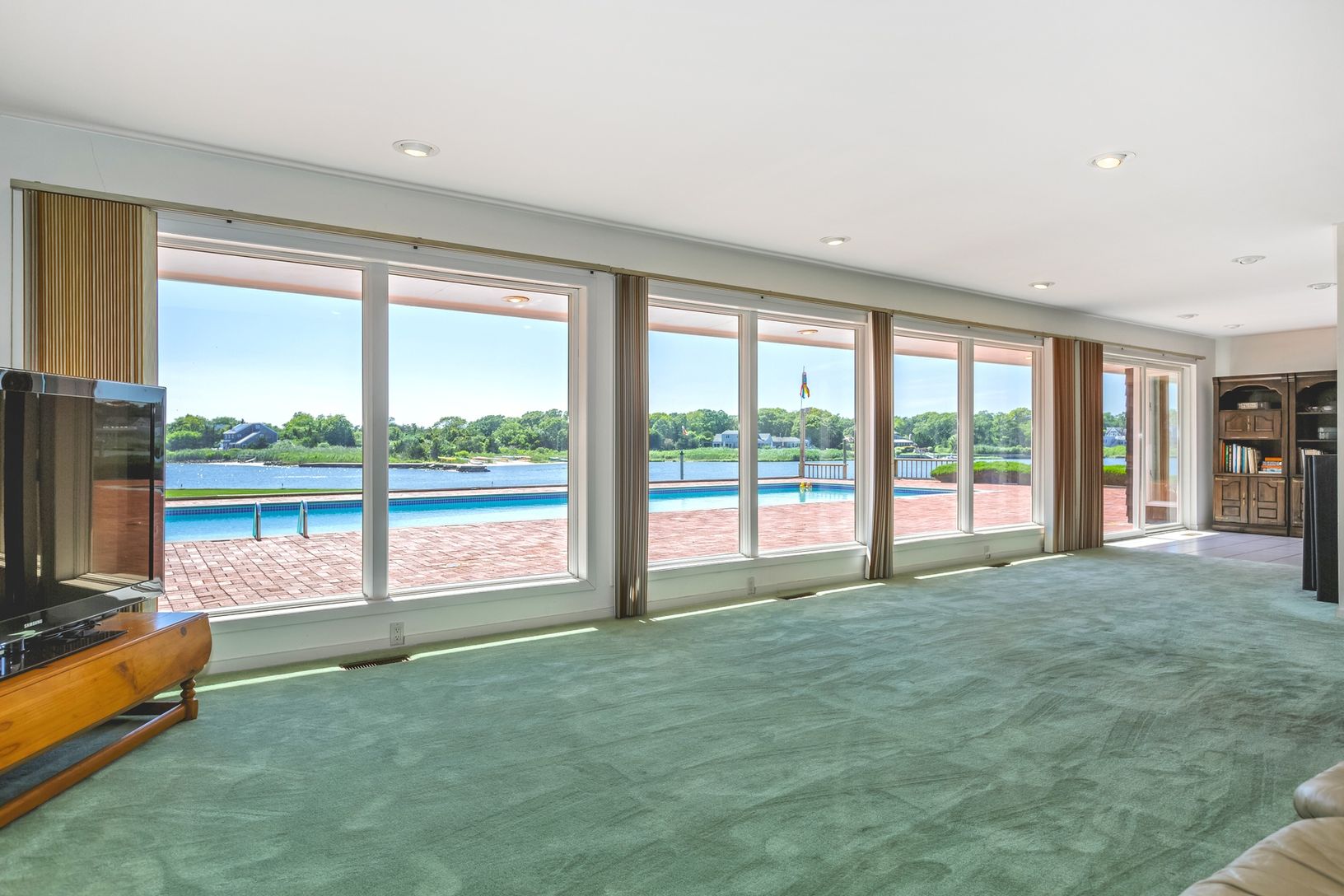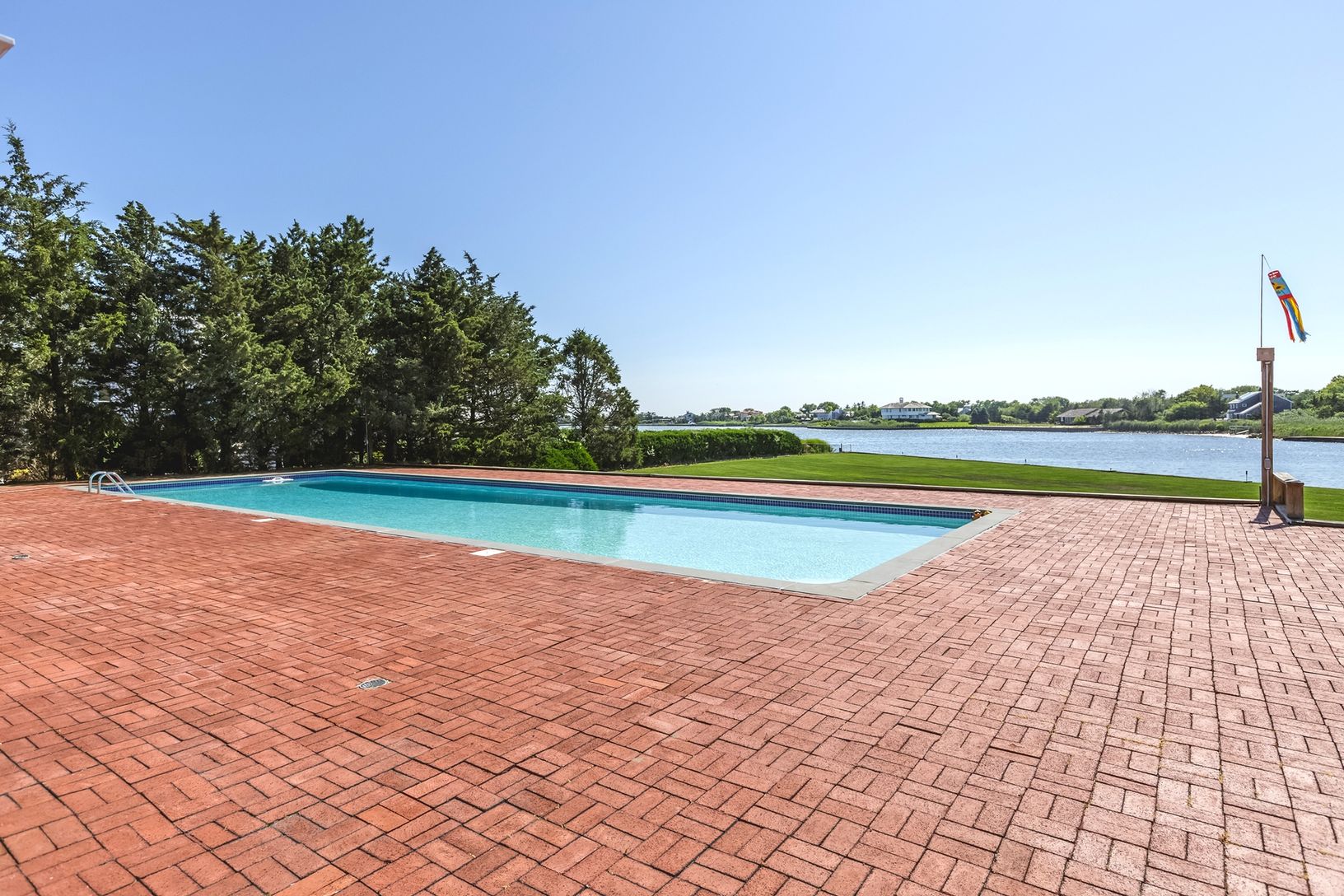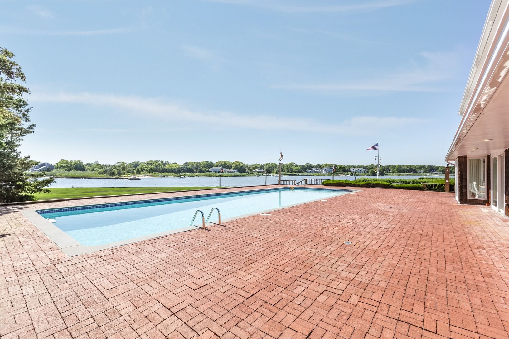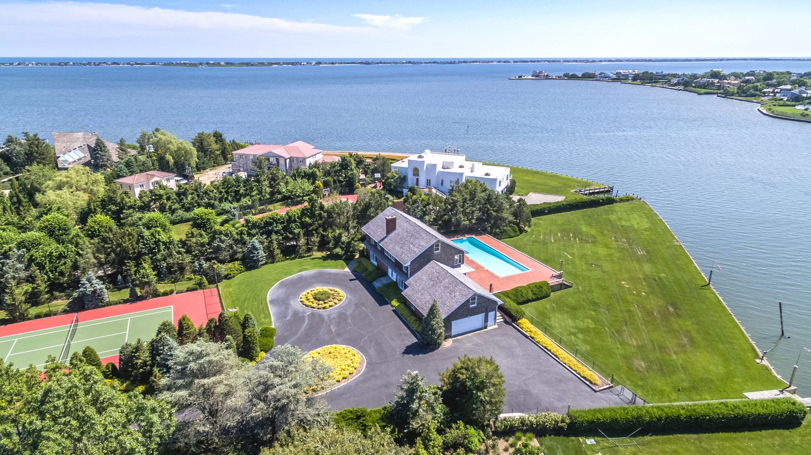 Stunning views provided from this four bedroom, four and one-half bath 4500sf home with eat-in-kitchen, formal dining room and large living room for entertaining. Set on 1.60 gorgeous and well-manicured acres featuring all-weather tennis court, Olympic-size gunite pool and 268 running feet of bulk heading situated on open bay.