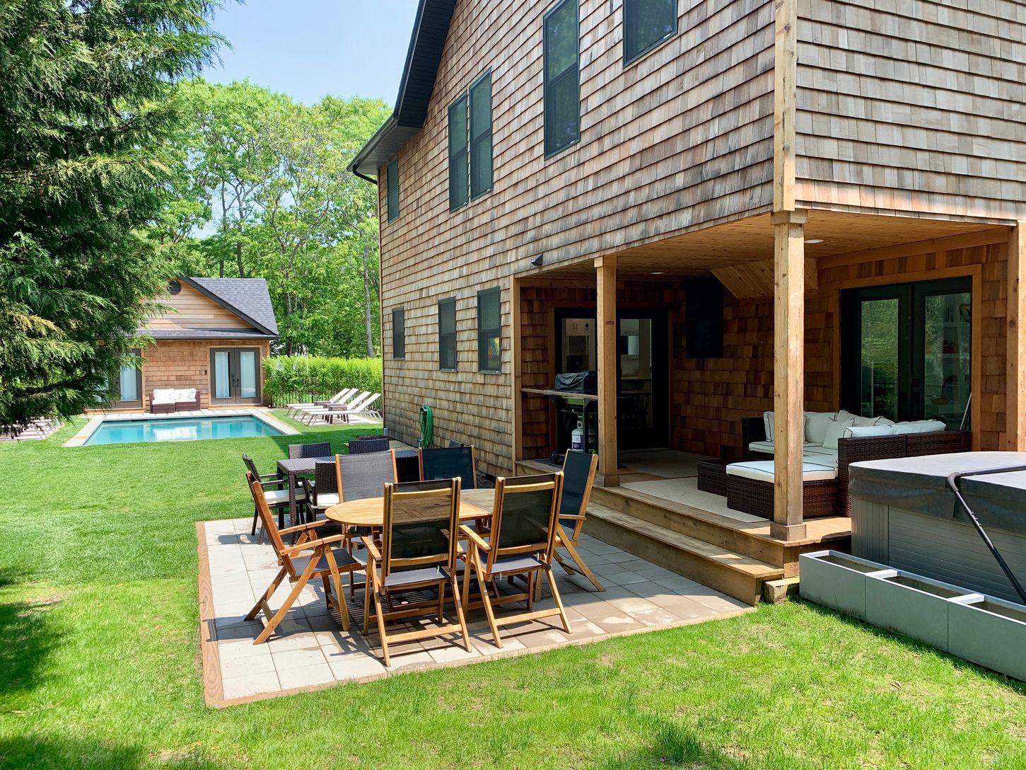 Sited on one half acre, this five bedroom, four bath, two story traditional with a 16x30 gunite pool, detached two car garage, 400+/- sq. foot pool house, 22' long front porch as well as a finished basement is the perfect Hamptons home. The first floor features an open floor plan that includes a large living room, a dining room and eat-in kitchen as well as den/fourth bedroom and a full bath. On the second floor is the spacious master suite w
