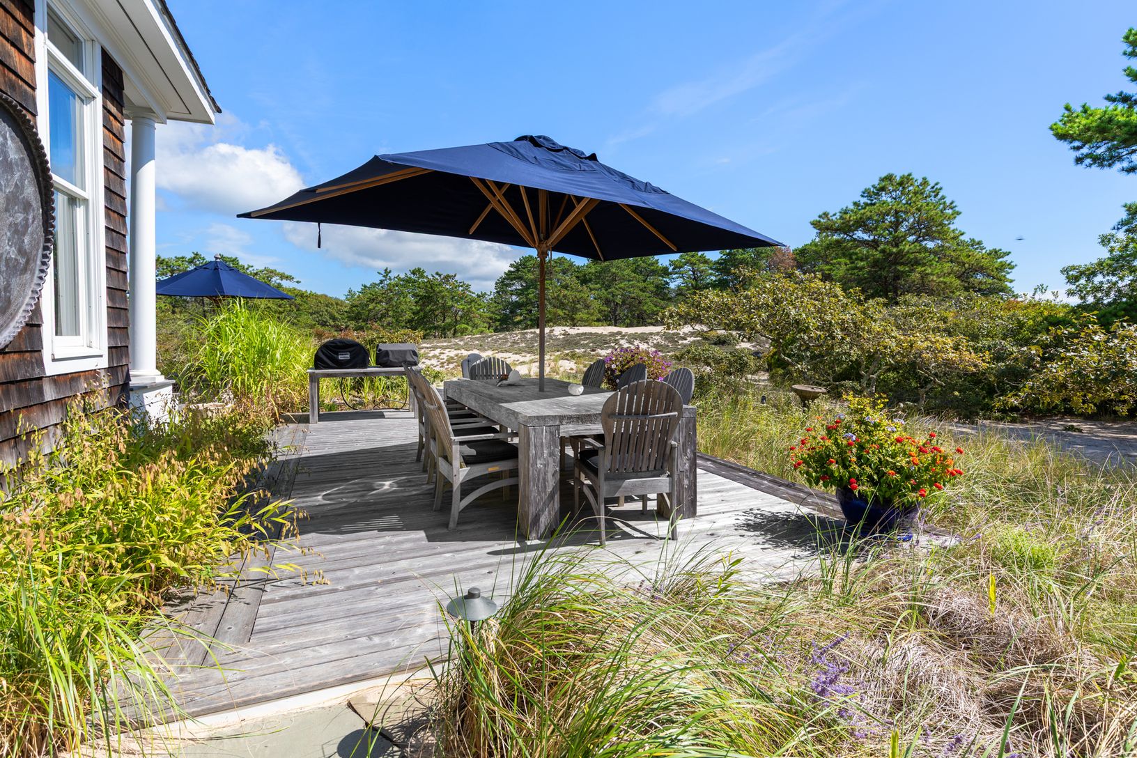 ***Exclusive Broker*** Perfectly situated home nestled on .75 acre in the Dunes that is a quick walk on a private path to the ocean. The first floor has a open kitchen with a large island, a dining area that overlooks the meticulous organically landscaped dunes, a large living area with a wood burning fireplace and a den/office area an a half bath. Upstairs has 3 large bedrooms with the primary having an ensuite bath including steam shower. Th