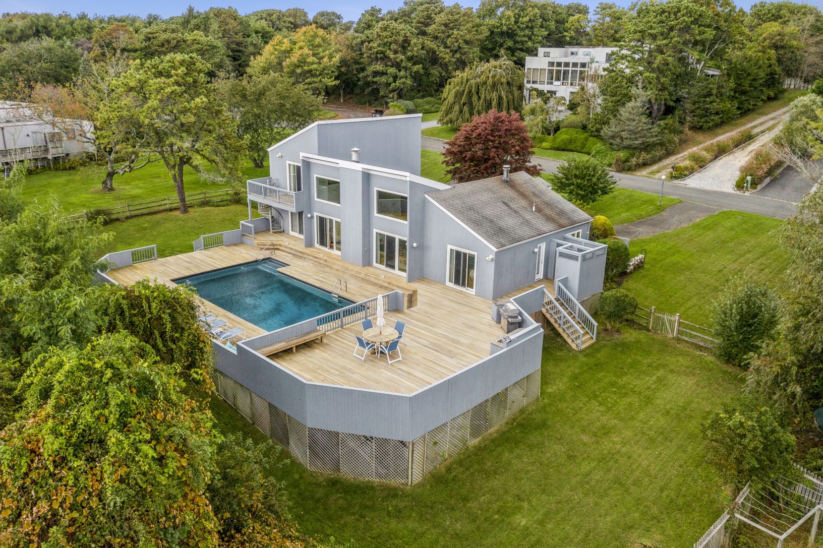 You will love the curb appeal of this retro-modern designed beach house on an acre of property. Drive-up the semi-circular driveway dressed with well-manicured landscaping right to the front door. Then come into the foyer that opens to the light and bright living room/dining area with lots of new Anderson windows and doors. The open kitchen has new stainless stain appliances. The upper level principal suite has a large bathroom with soaking tu