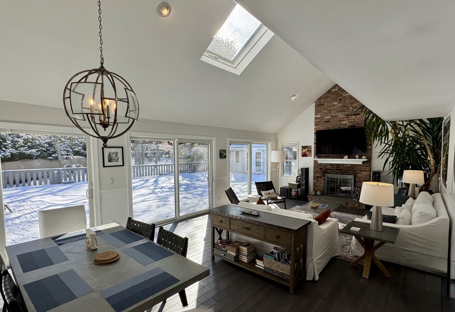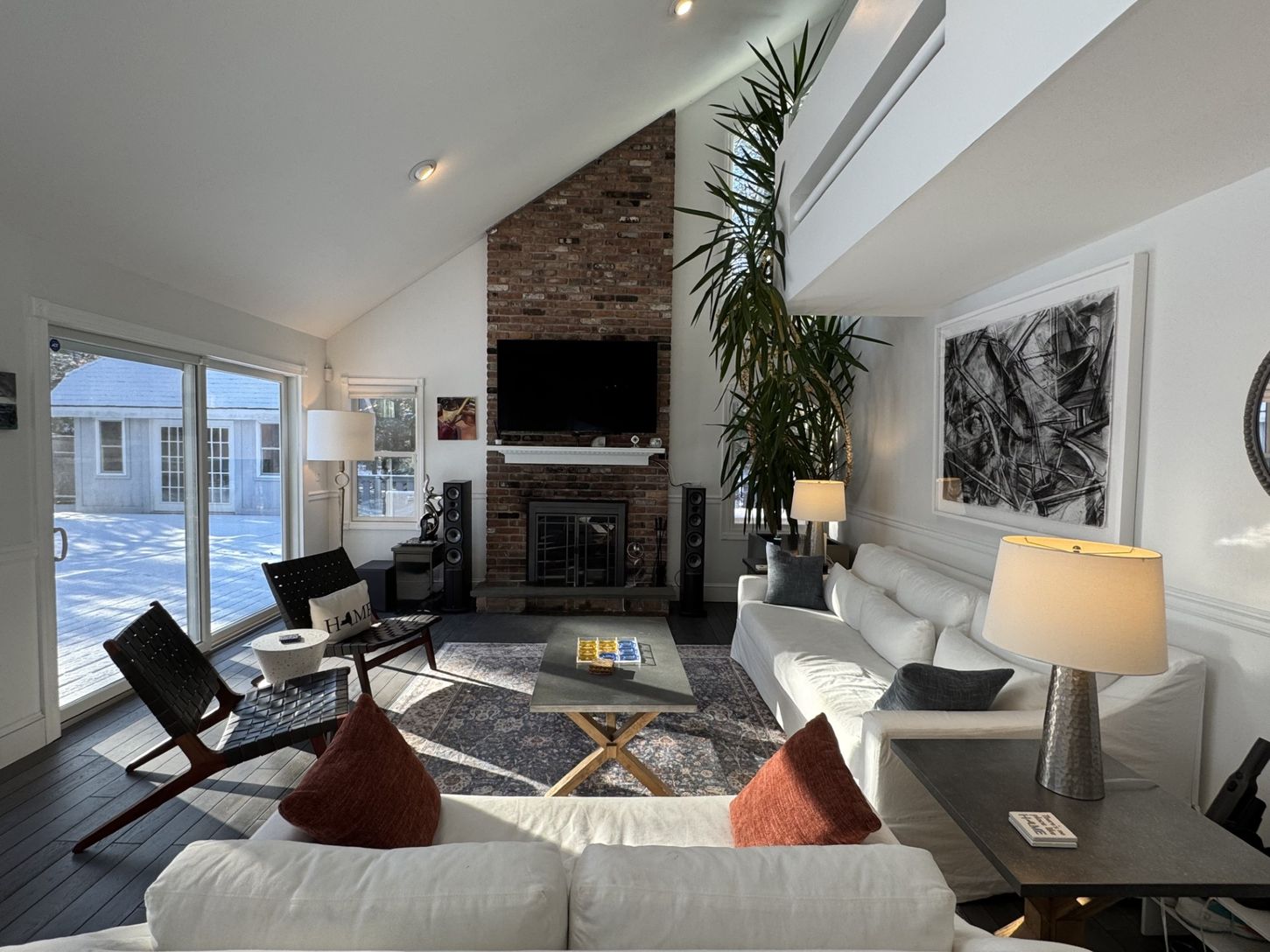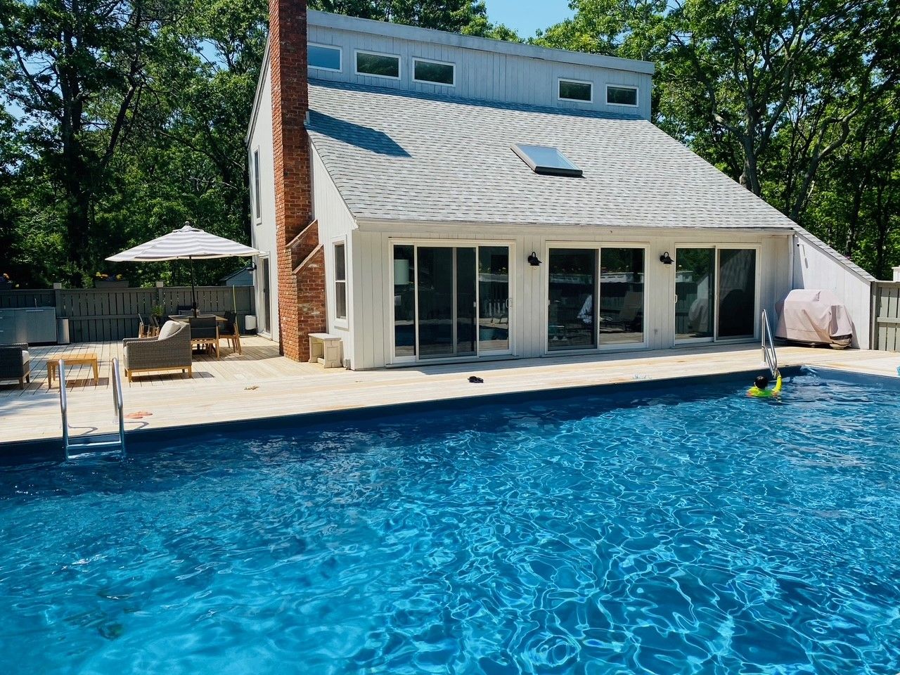 Beautifully renovated, fully furnished contemporary saltbox, offering a perfect blend of style and comfort. With four spacious bedrooms and three full baths, this home features an open-concept living room with a cozy fireplace, an eat-in kitchen, and a bright dining area. Enjoy modern amenities like central air-conditioning, an eight-zone sonos sound system, and a saltwater heated pool for ultimate relaxation. The expansive outdoor decking is