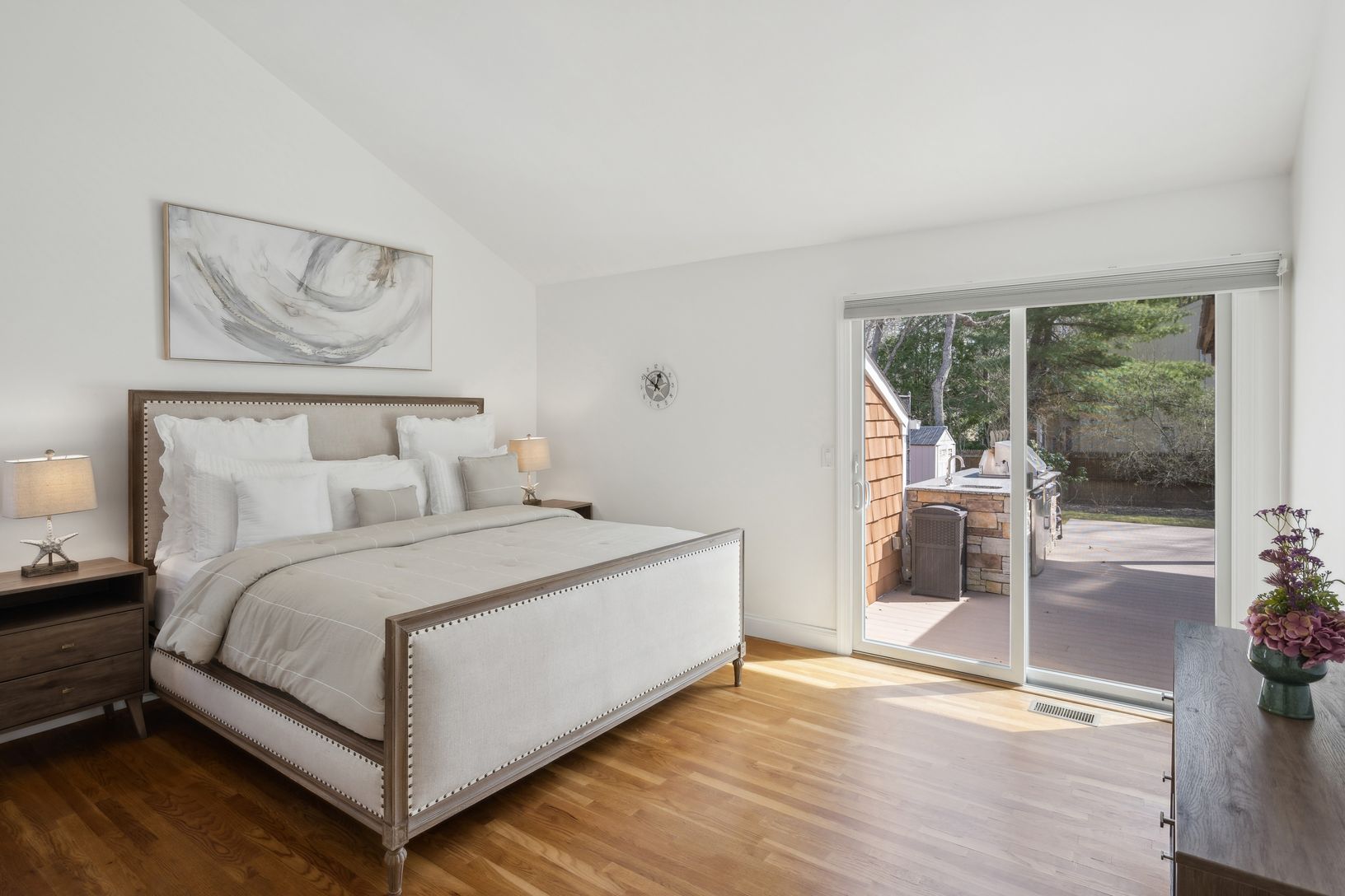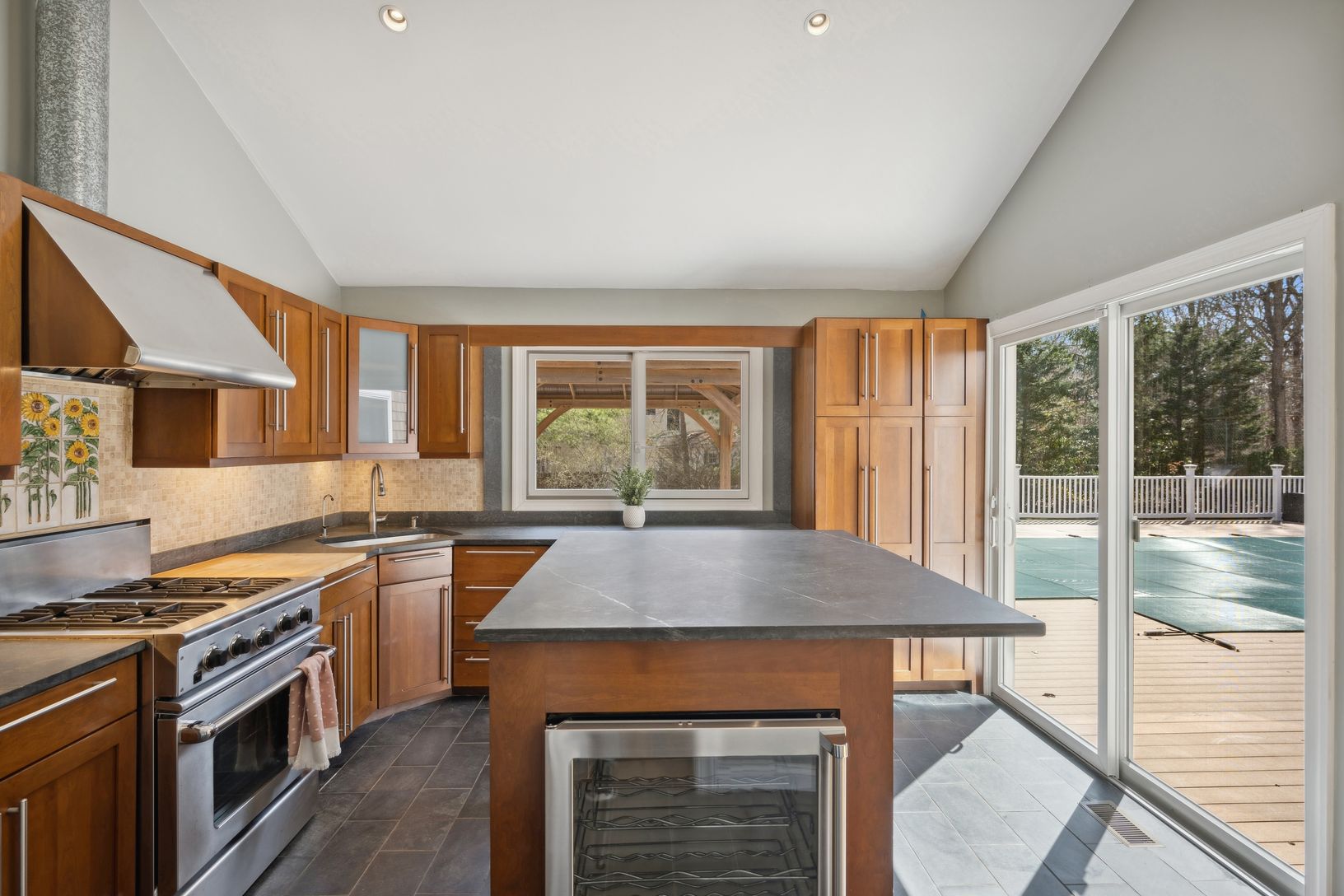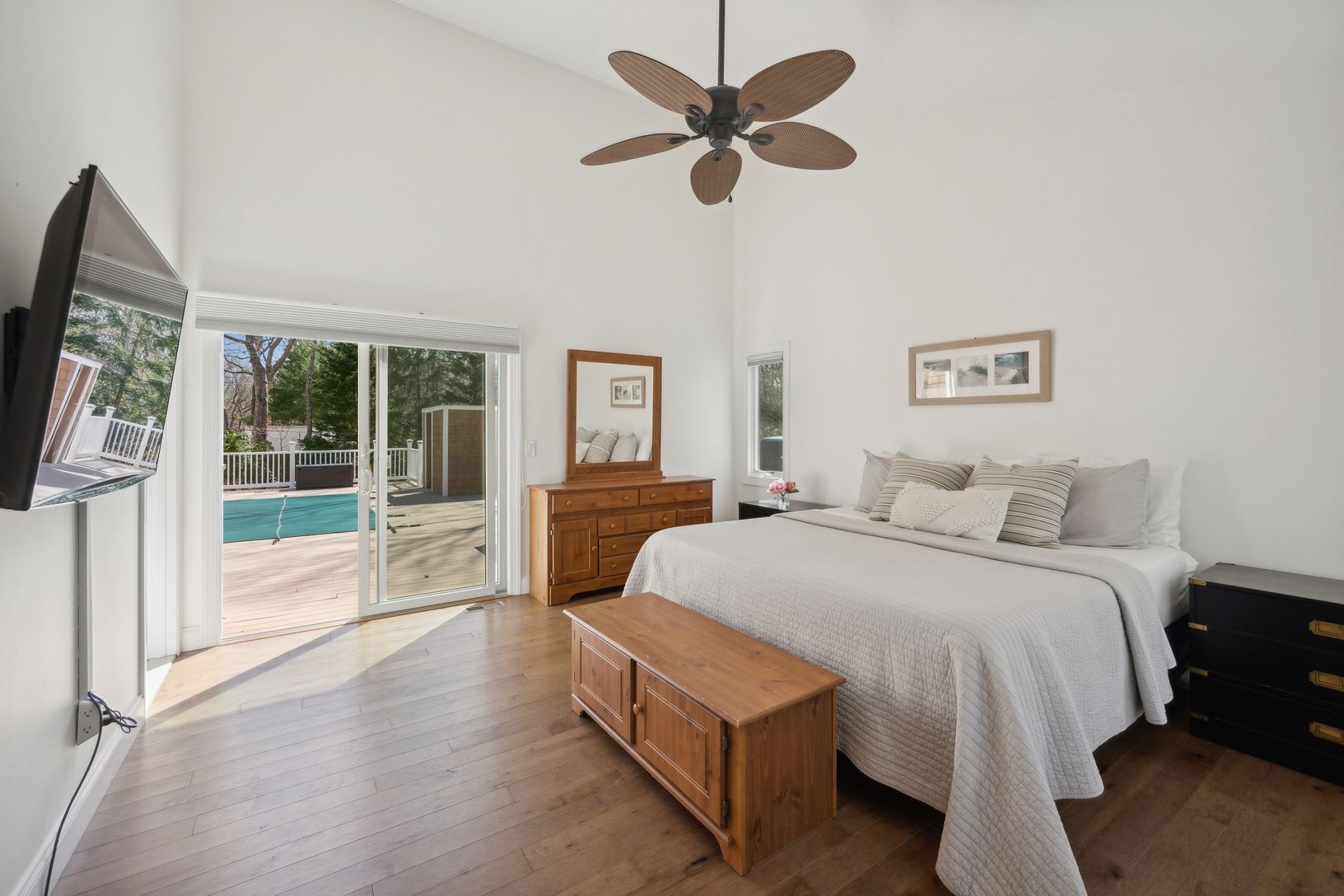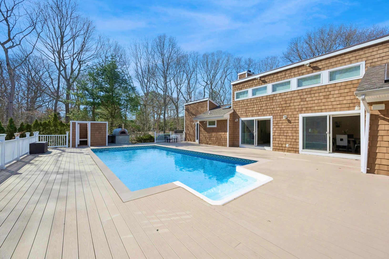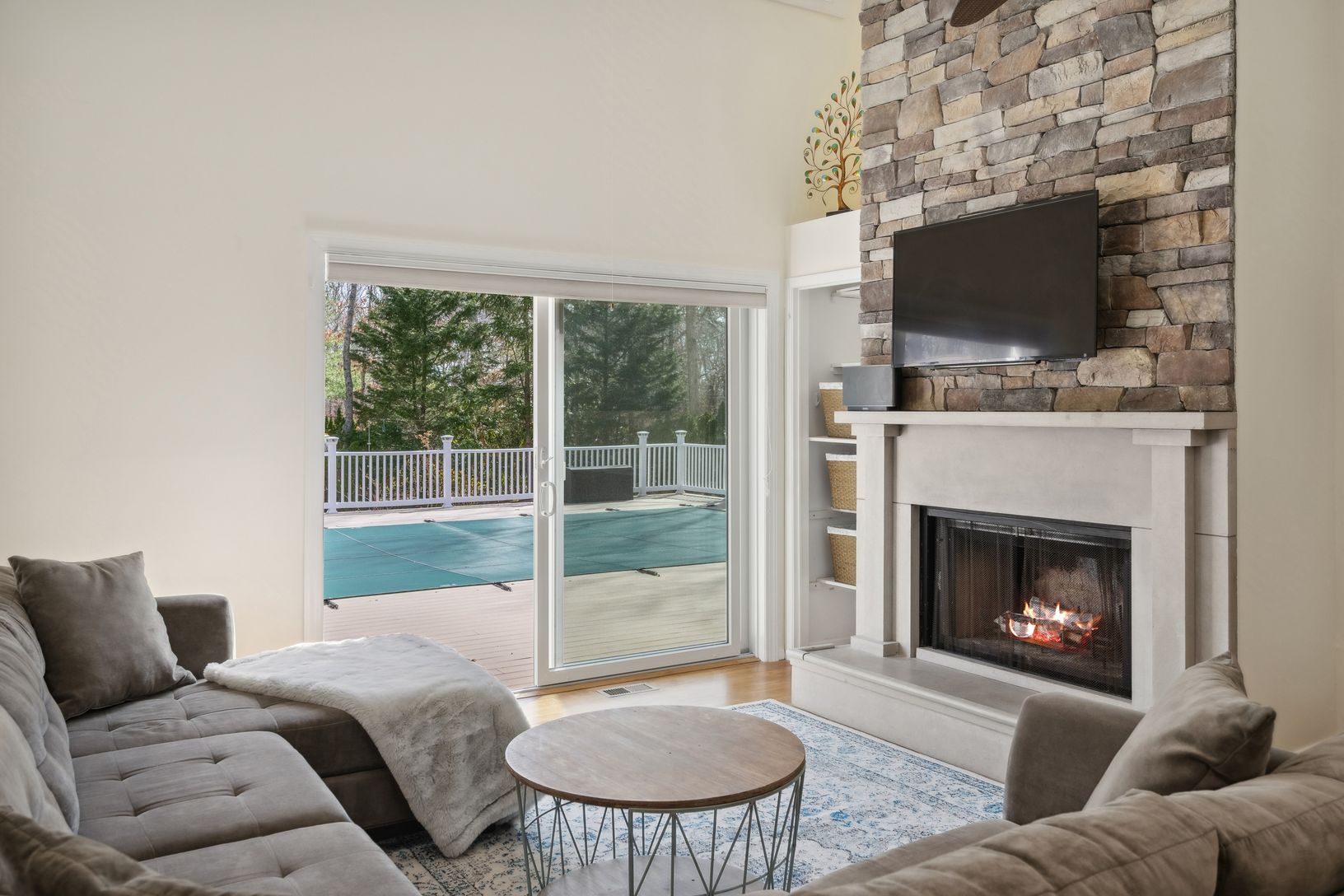 This beautiful, open floor plan, post modern 5 bedroom, 4 bath home is set on a private wooded parcel in "The Registry" development. As you enter the foyer, you are greeted by a spacious great room with high vaulted ceilings, clear story windows and several glass sliders overlooking the outdoor pool and deck entertaining area. The spacious great room, complete with a wood burning fireplace, is open to the eat in kitchen complete with an island