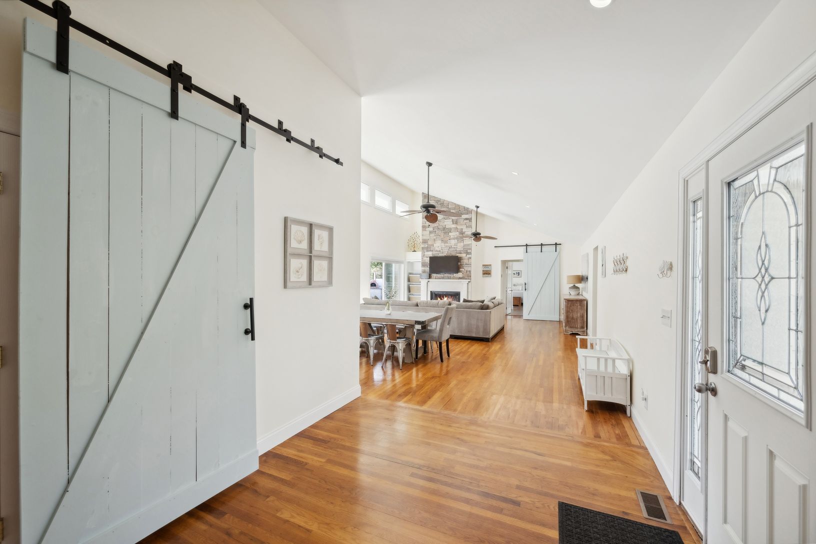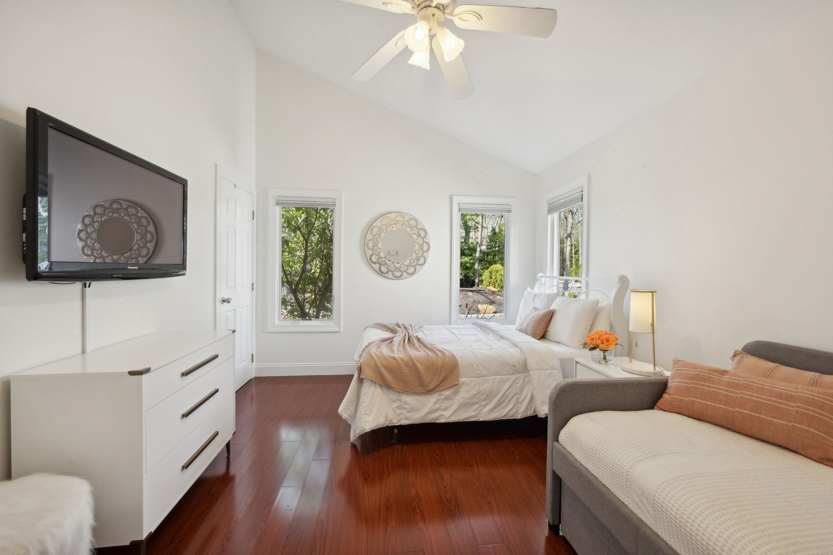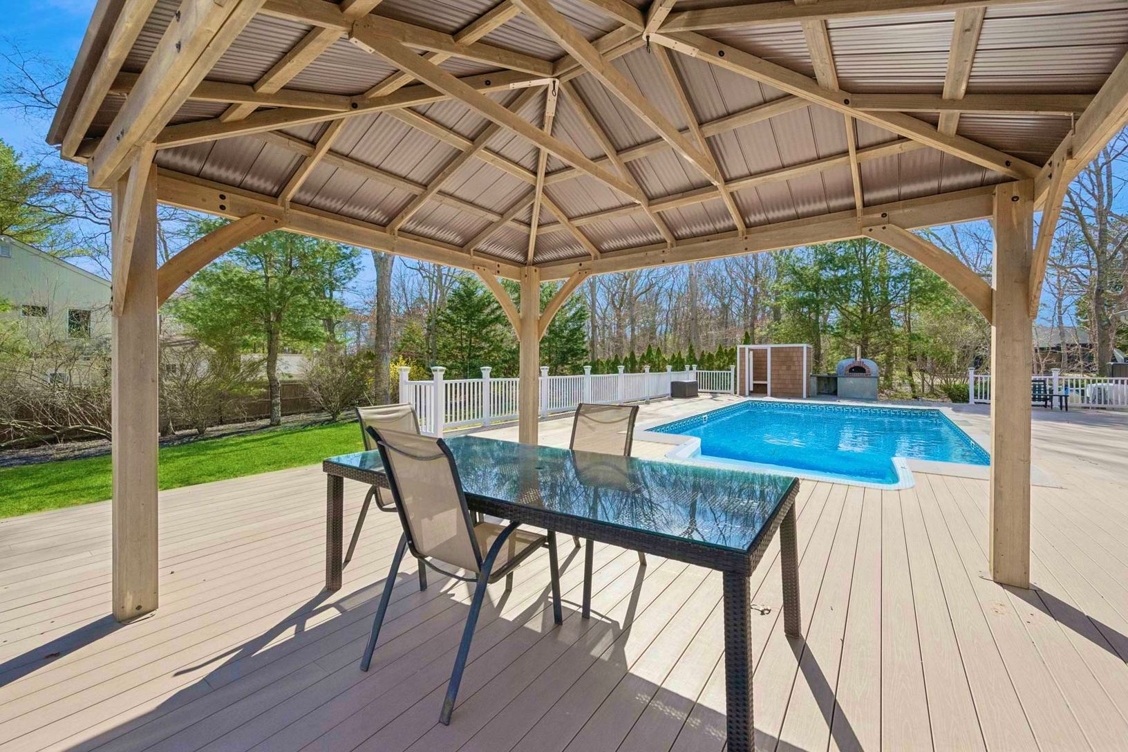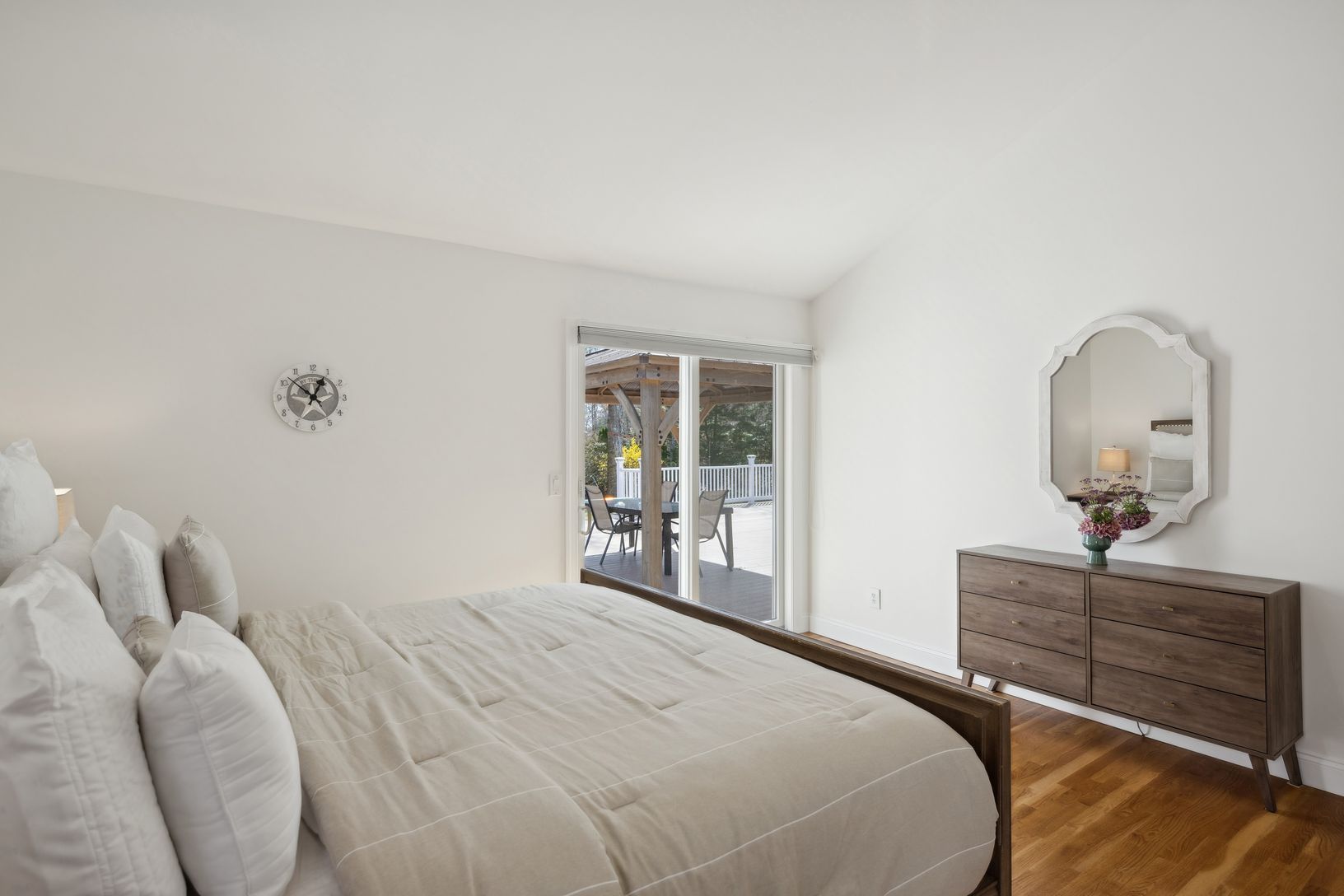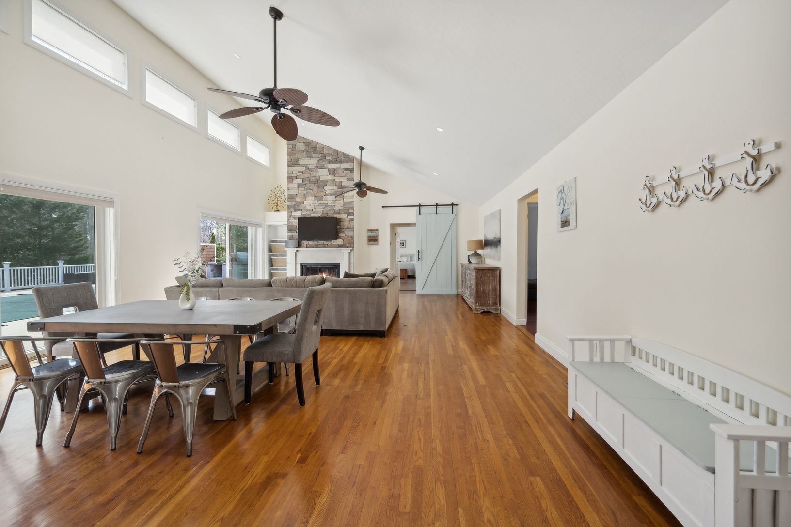 This beautiful, open floor plan, post modern 5 bedroom, 4 bath home is set on a private wooded parcel in "The Registry" development. As you enter the foyer, you are greeted by a spacious great room with high vaulted ceilings, clear story windows and several glass sliders overlooking the outdoor pool and deck entertaining area. The spacious great room, complete with a wood burning fireplace, is open to the eat in kitchen complete with an island