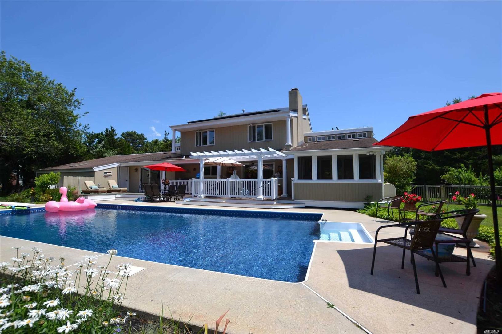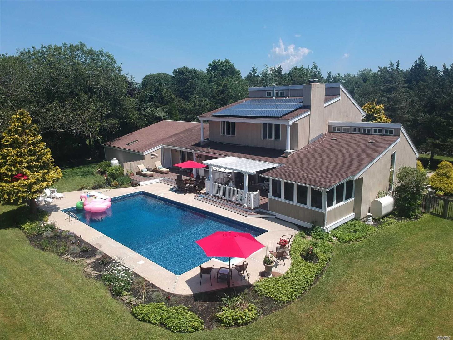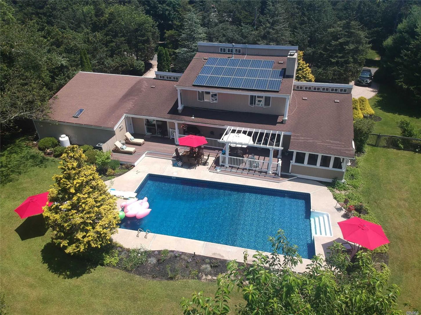 Sun-drenched and spacious South of South Country Road just down the street from the open bay on one of the most desirable lanes in Remsenburg. Extra large 2 car garage (28x28), solar panels leased, $152/month with $10/month electric bill. New enclosed sunroom on back deck overlooking pool area. Master BR on first floor with private sliders out to back deck/pool area. Open kitchen/dining area. LR with vaulted ceiling and double-sided fireplace.