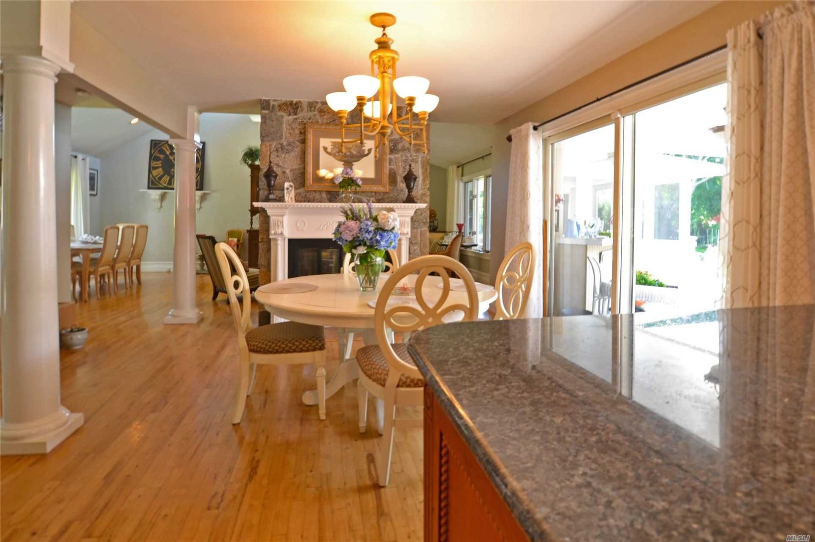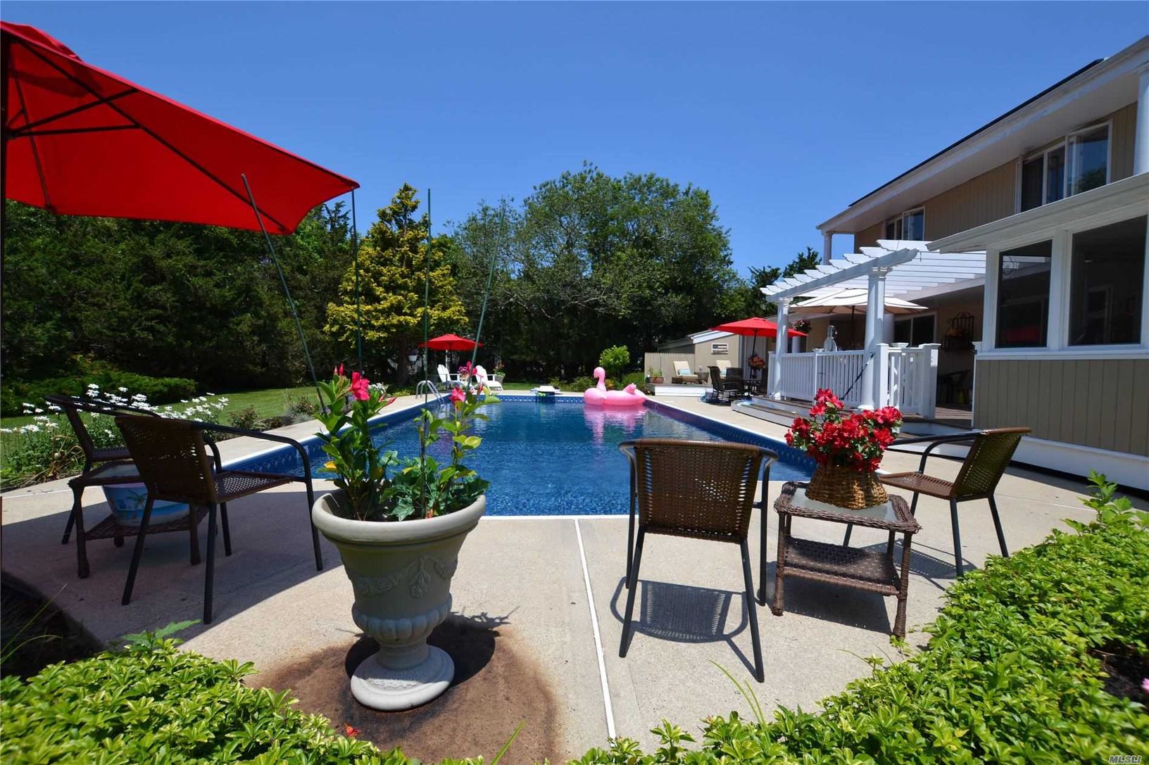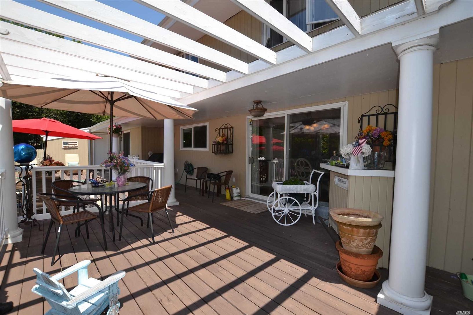 Sun-drenched and spacious South of South Country Road just down the street from the open bay on one of the most desirable lanes in Remsenburg. Extra large 2 car garage (28x28), solar panels leased, $152/month with $10/month electric bill. New enclosed sunroom on back deck overlooking pool area. Master BR on first floor with private sliders out to back deck/pool area. Open kitchen/dining area. LR with vaulted ceiling and double-sided fireplace.