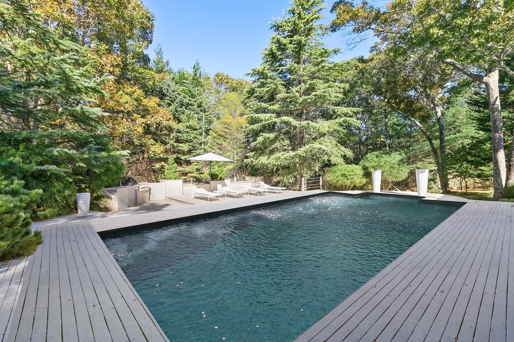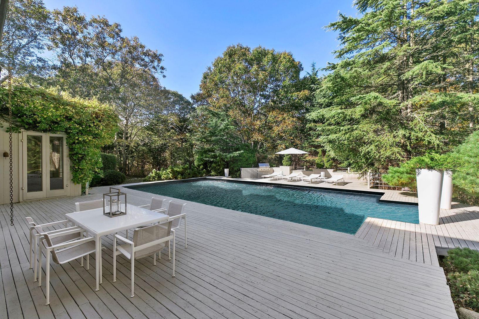 Welcome to "Chez Bamboo", a magical oasis located in the Northwest Woods of East Hampton. Sited on over 1.6 professionally landscaped acres, this sexy, chic and light-filled Contemporary home features 3 bedrooms (including a master suite with its own screened-in covered porch), 2.5 bathrooms, double height living room with wood burning fireplace, separate sitting area, stylish dining room with concrete radiant heated floors and custom wood ce