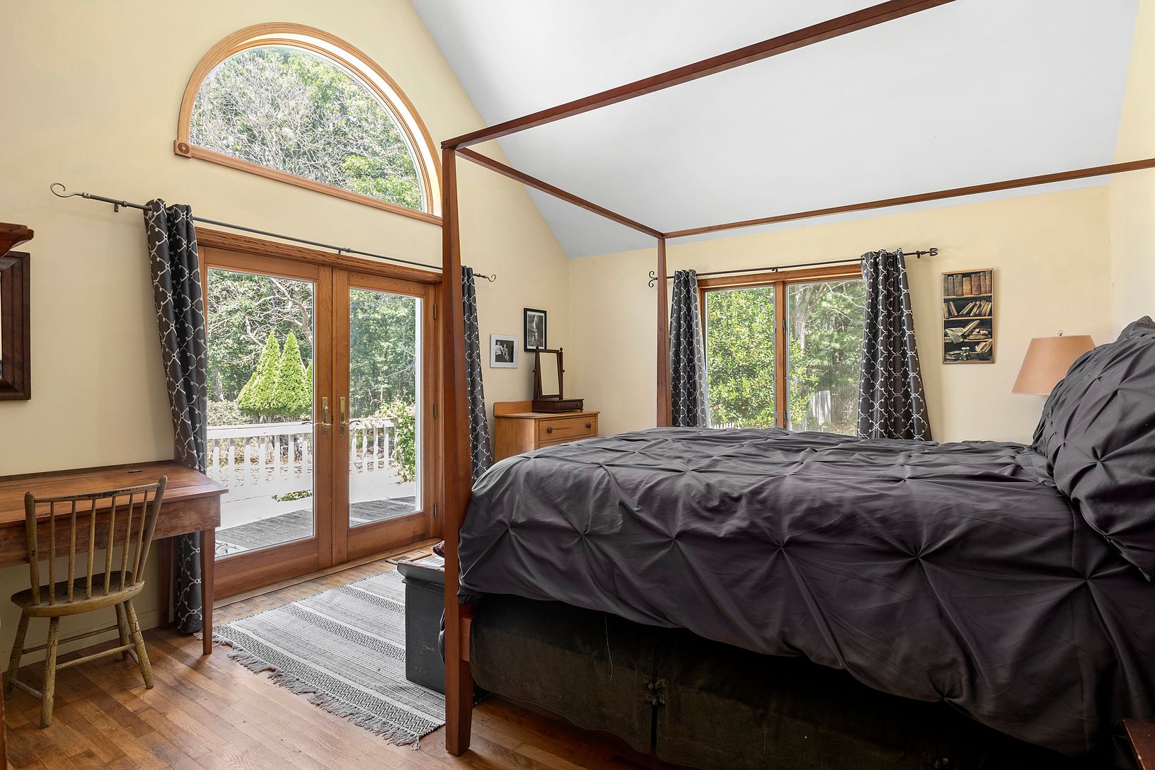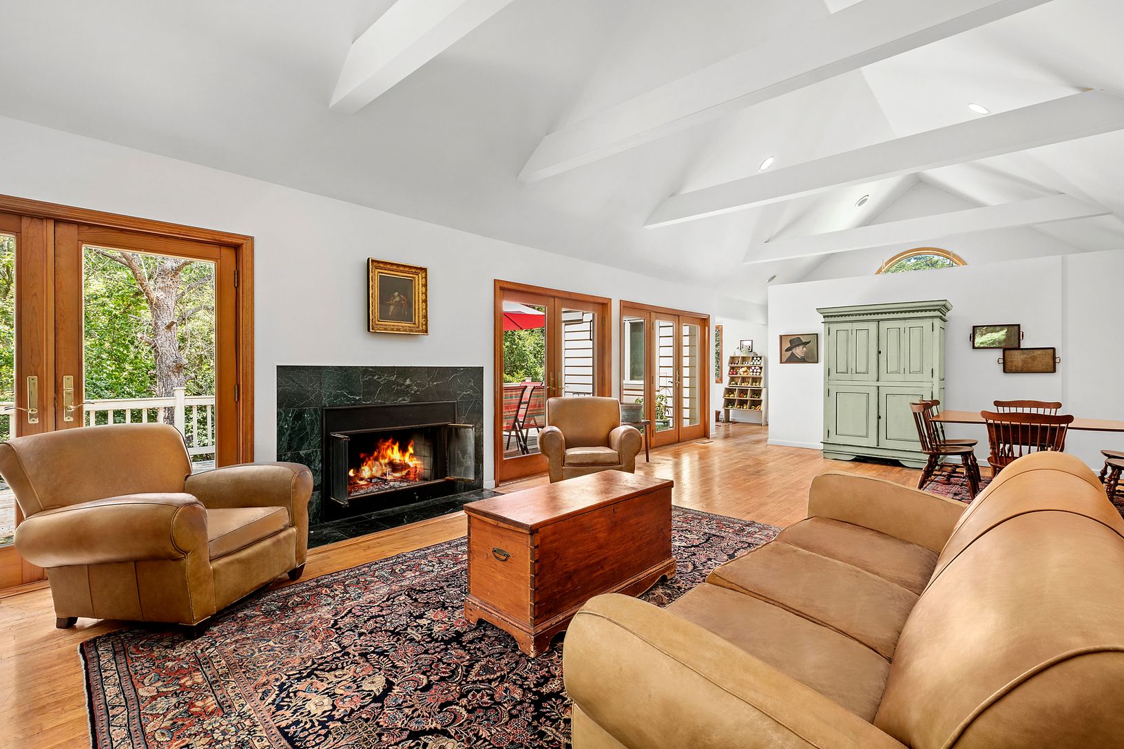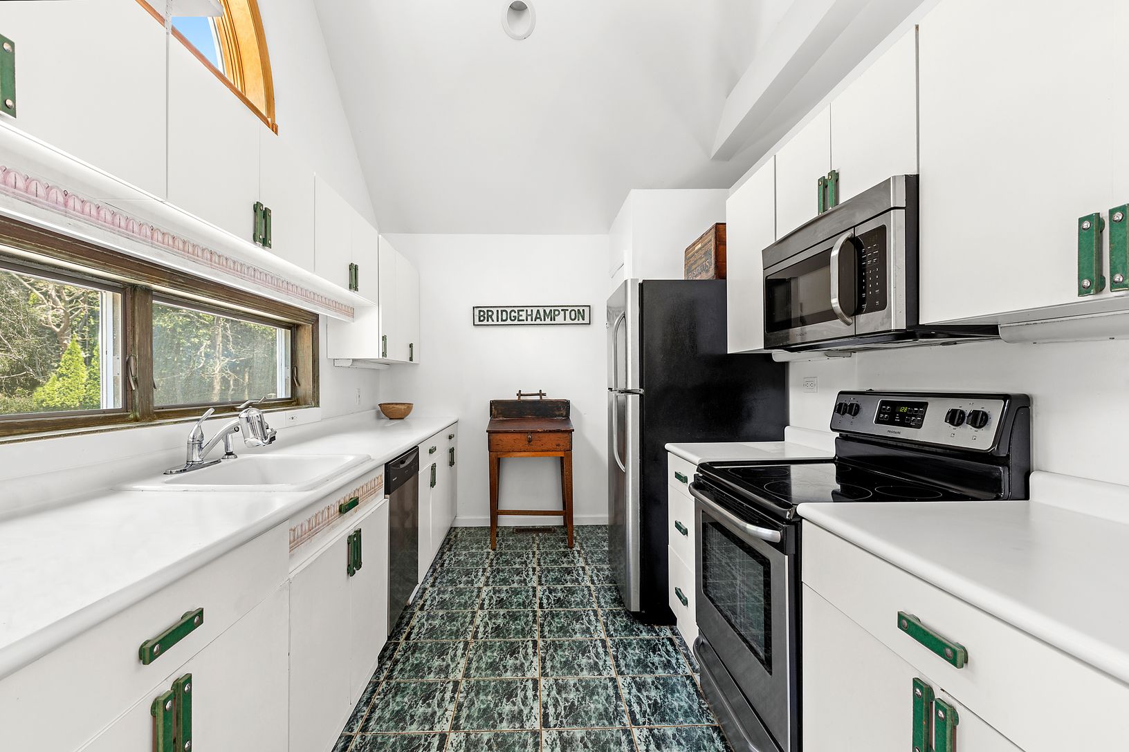 Situated at the end of a quiet cul-de-sac, in the highly regarded hamlet of Bridgehampton, you will find this bright contemporary home. Upon entering, you will notice the open floor plan. The living room has a cathedral ceiling and wood-burning fireplace - which opens to a dining area, breakfast nook, and galley kitchen. On the right side of the house, you have the primary bedroom with an ensuite bathroom and walk-in closet, as well as, two gu