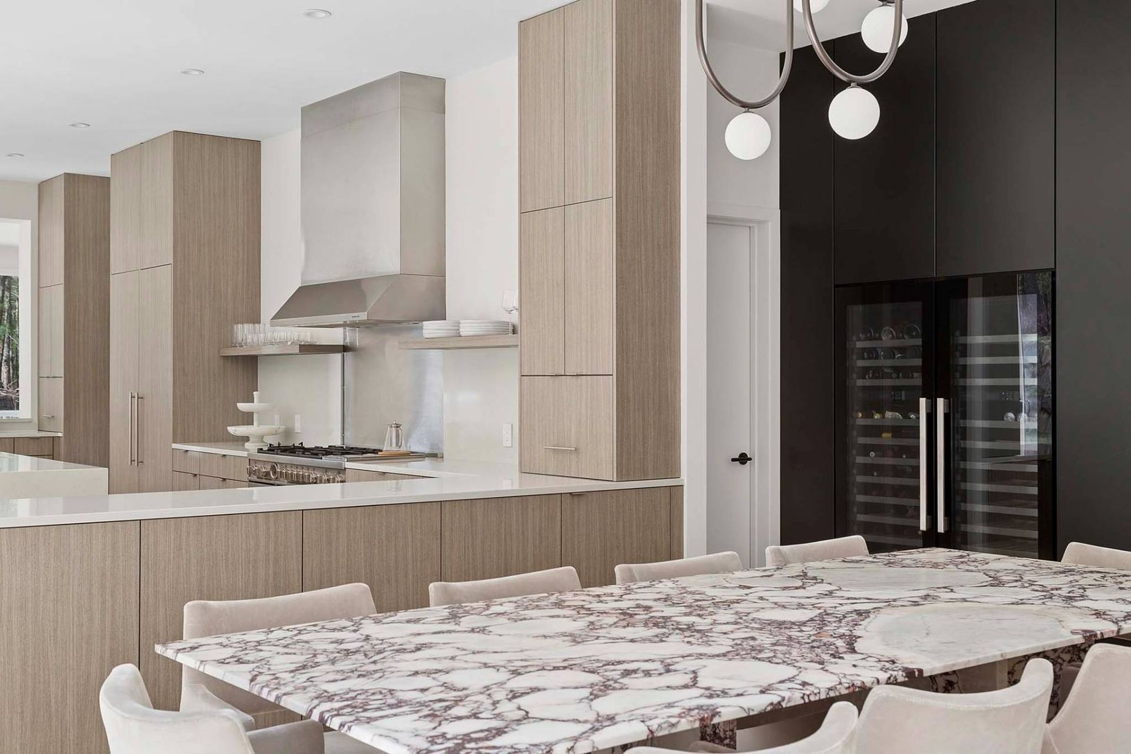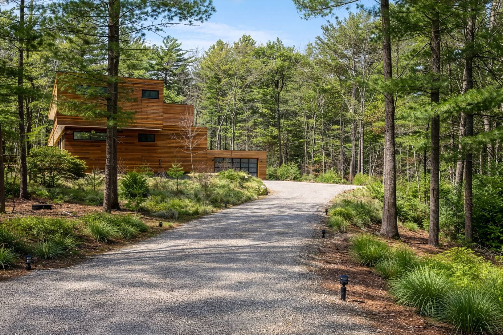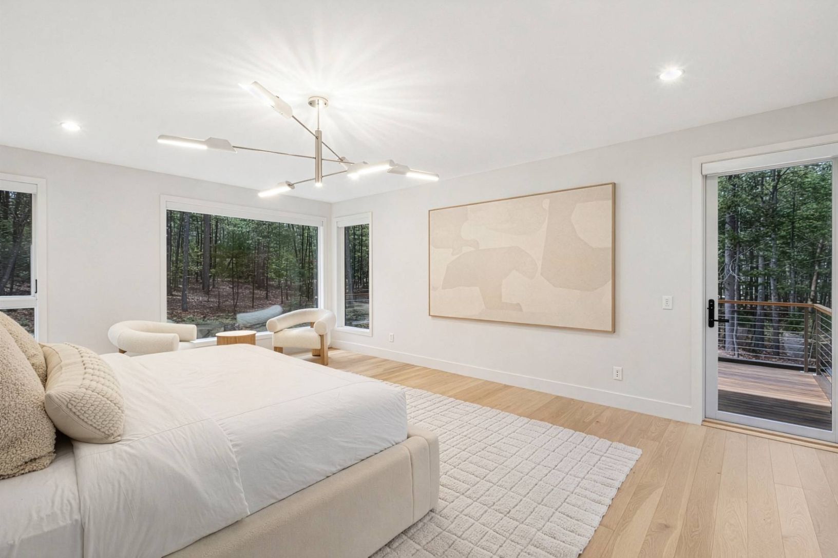 Luxury, sustainability, and elegance are yours in this 7400 +/- sq ft modern residence tucked away on nearly 3 acres of serenity. Cutting edge design by Modern NetZero capitalize on the cascading natural light, expanding the connection between the open floor plan and the outdoors. A dramatic entry with custom, floating steel staircase welcomes you to the chic living area accented with a double sided fireplace adjoining the dining room. The gou
