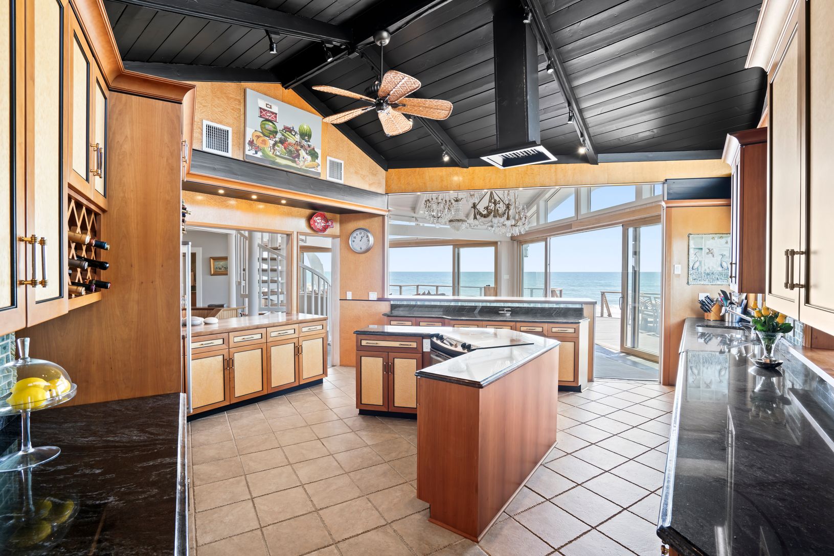 Set along the sandy shores of Quogue Beach, 174 Dune Road is a rare oceanfront offering with sweeping Atlantic views and easy access to everything the Hamptons has to offer. The main level has an open, airy layout with oversized windows that bring in natural light and frame the water views. The kitchen flows into the dining area and living room, where a sunken fireplace nook creates a cozy spot for gathering. The home’s octagonal design adds a