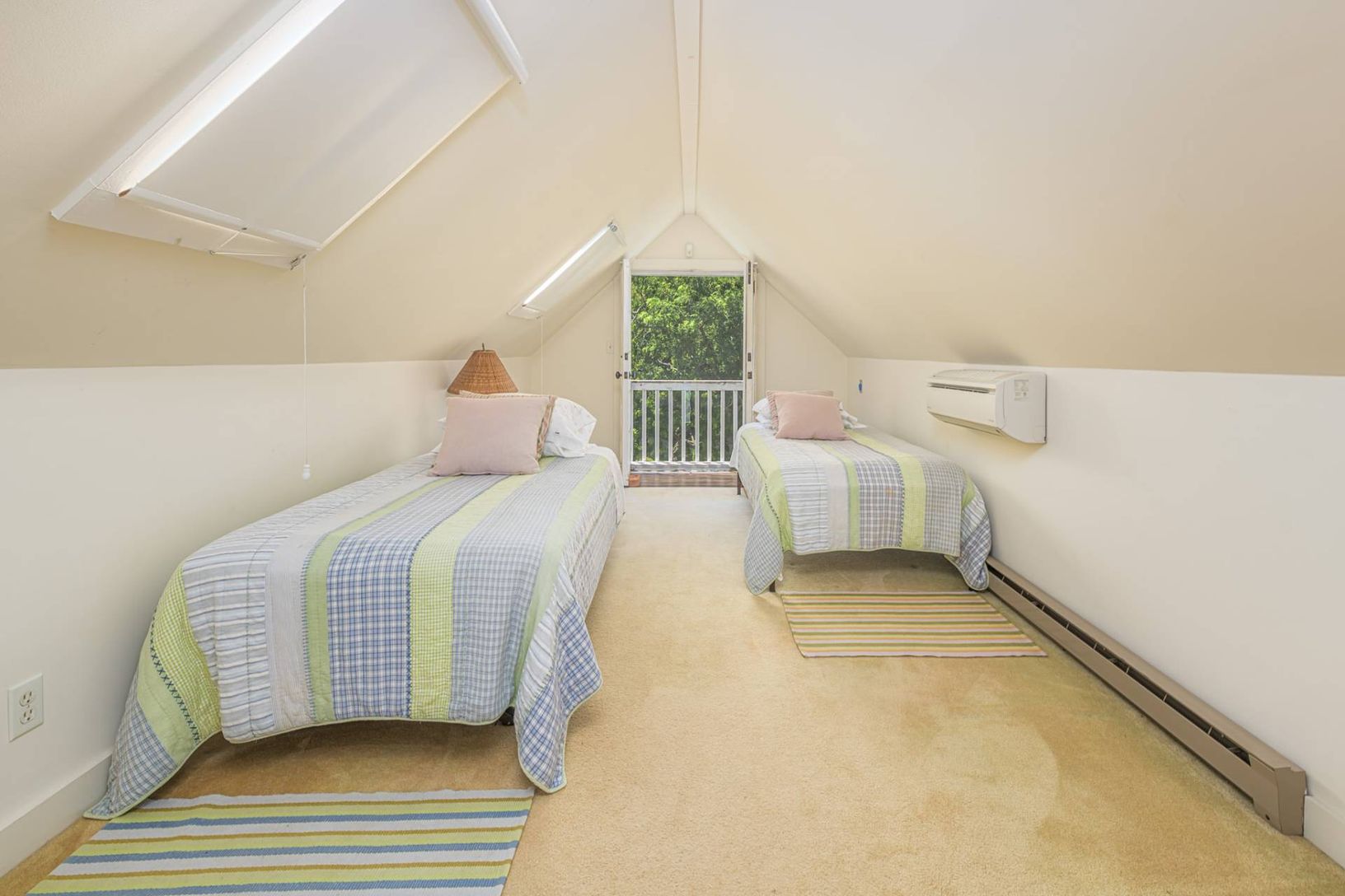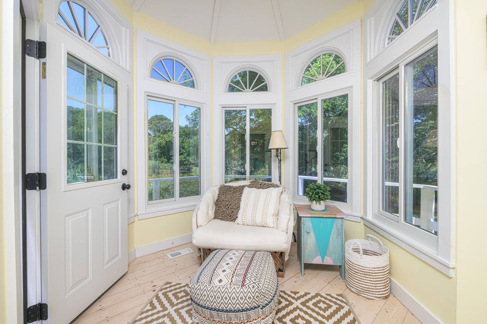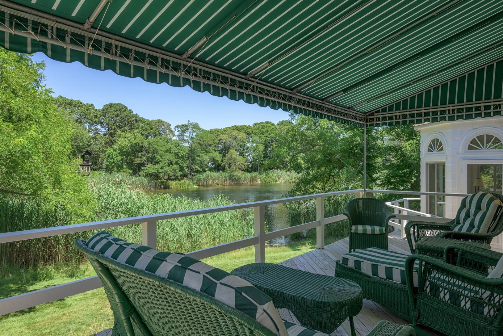Retreat to this private carriage house, set on 6 acres and adjacent to preserved land - enjoy pond views and nature abound! The new tennis court on the property can be included if desired. Enjoy bay breezes from the nearby Peconic Bay, as well as shade and covered porches during the summer heat. Cool off inside with AC and other amenities like smart TVs and luxurious Hamptons-style decor. This three bedroom, 1.5 bath with outdoor shower, is pe