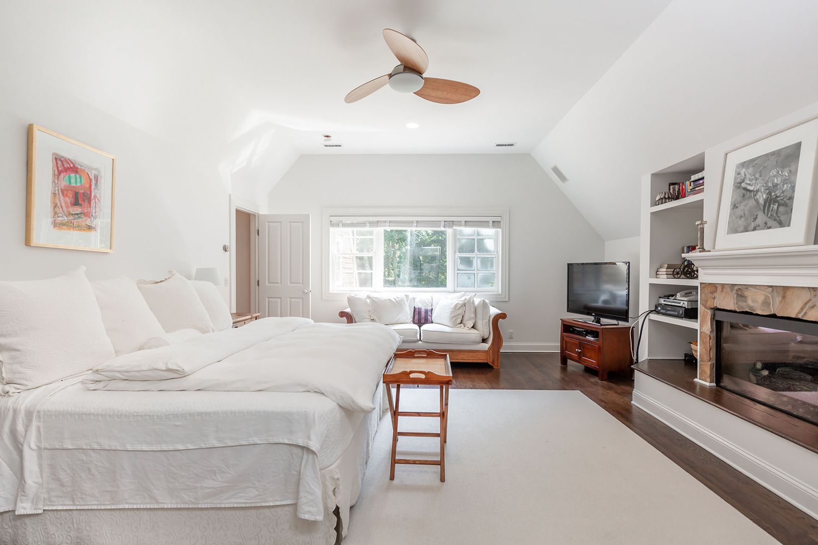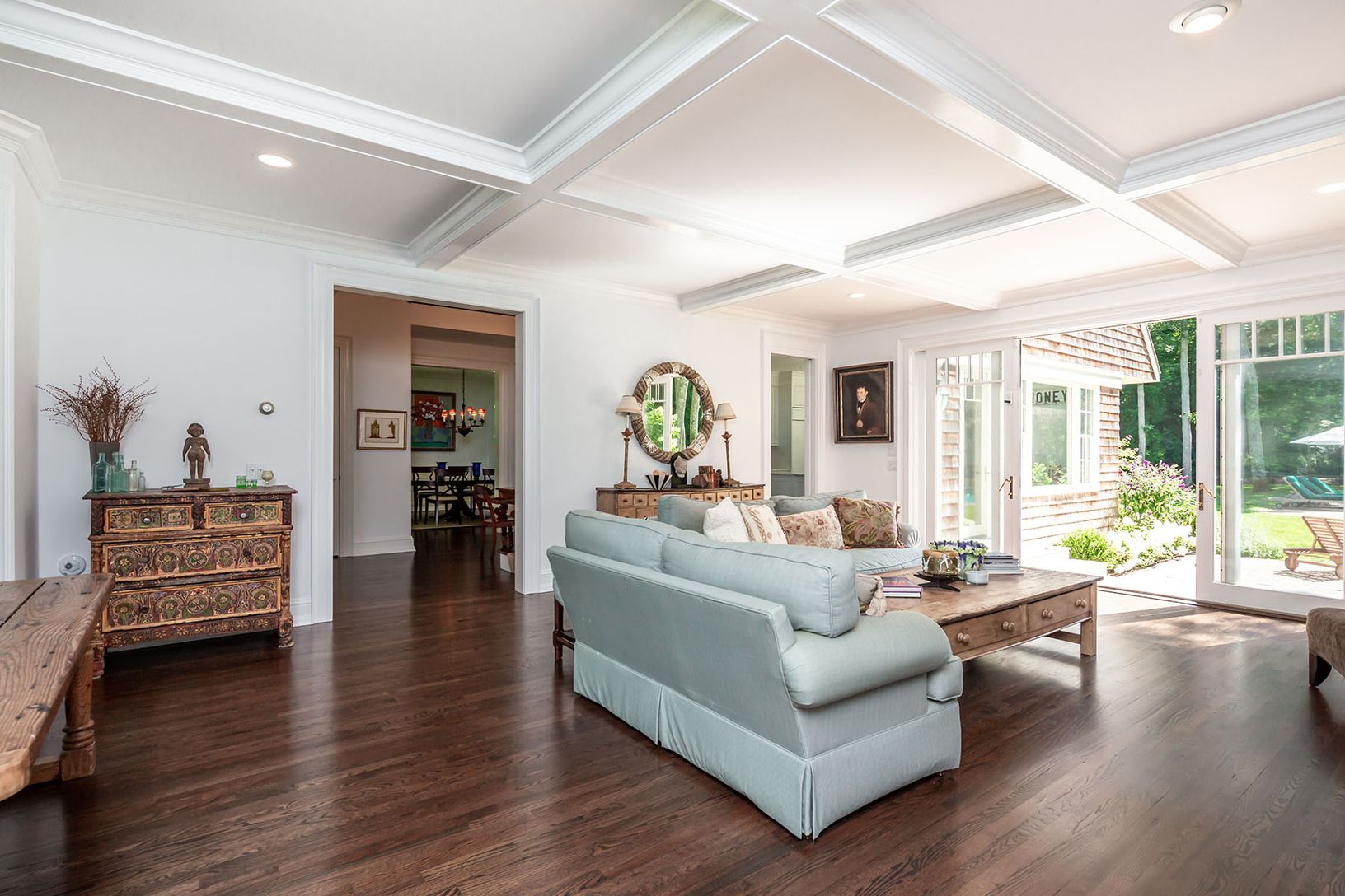A perfectly coiffed acre in the coveted Georgica section of East Hampton Village is home to a wonderfully articulated 4,000 SF residence awaiting its next owner. With recent renovations completed in 2019, a 5 bedroom, 6 bath home welcomes all through a formal entry that fans out over dark stained oak floors to find a living room and nearby den, both under coffered ceilings and warmed by separate fireplaces, formal dining room and a large kitch