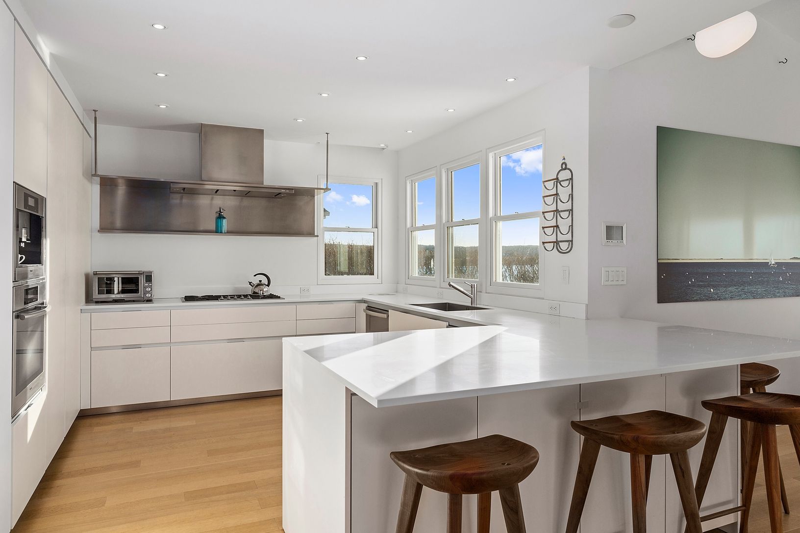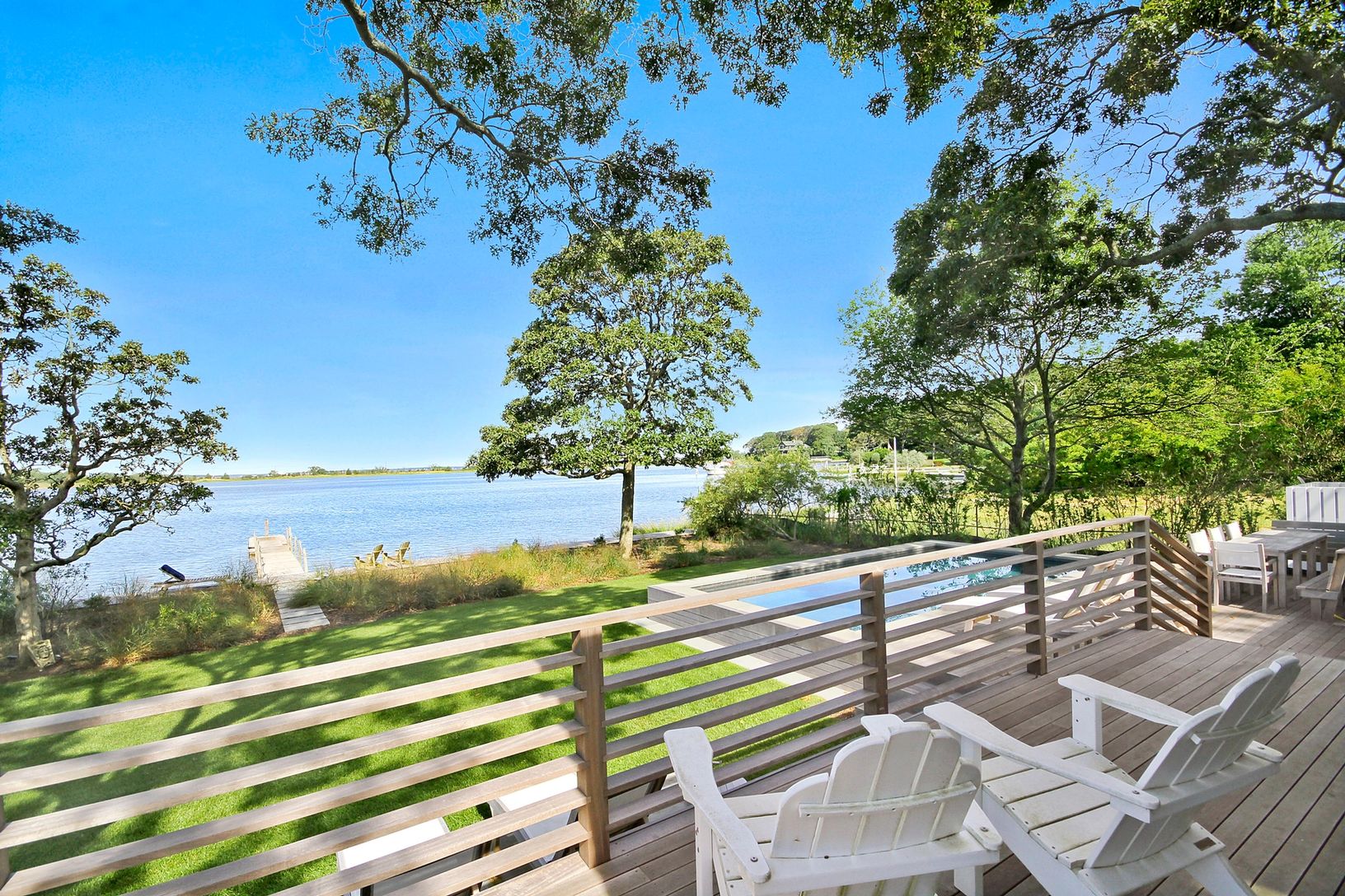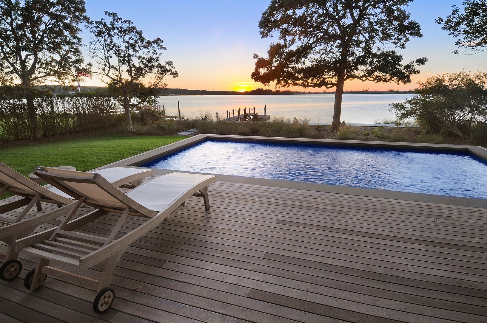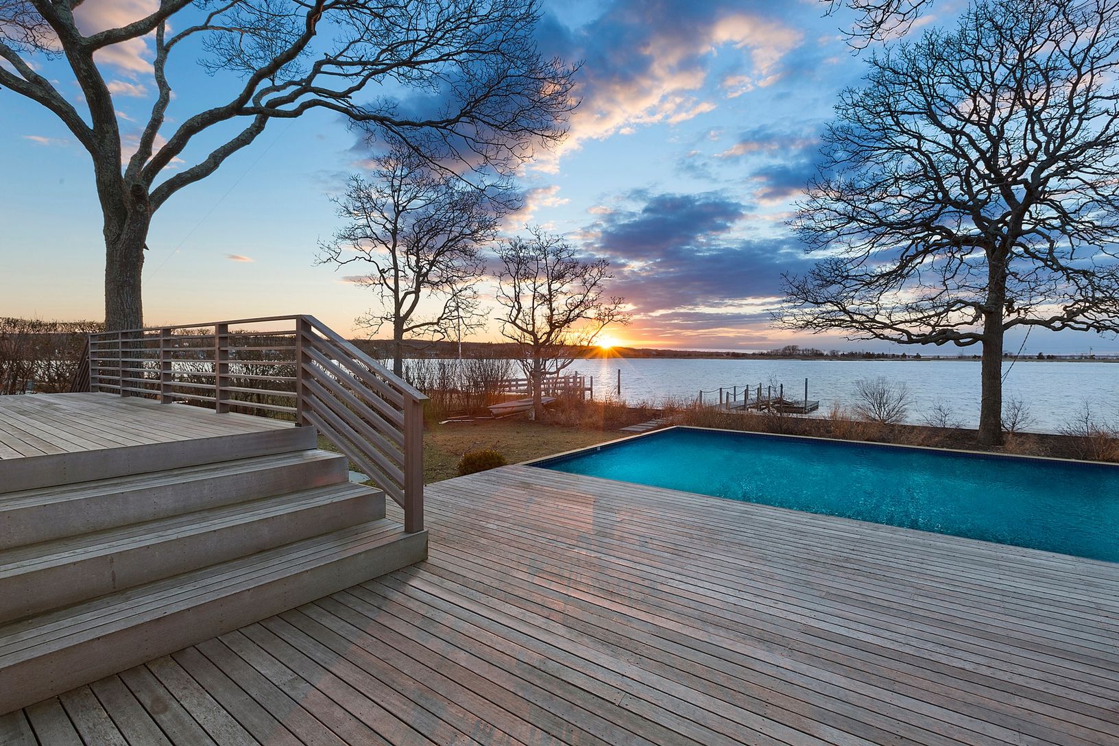 Facing west on Sag Harbor Cove, 176 Redwood Road has panoramic views, deep water dock, waterside gunite pool and outdoor shower. Serene water views can be seen throughout this cutting edge Modern Green Home, which combines environmentally conscious building techniques with high-end construction and finishes. The 3-bedroom home has a lovely open flow, showroom-quality kitchen and baths (Boffi cabinetry, Gaggeneau appliances, Dornbracht bathroom
