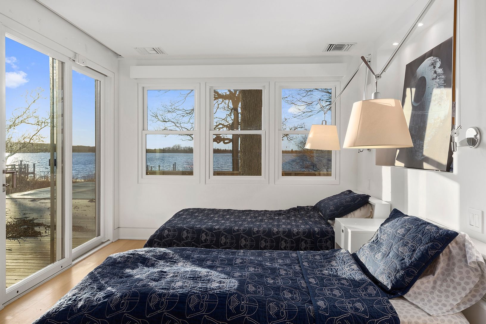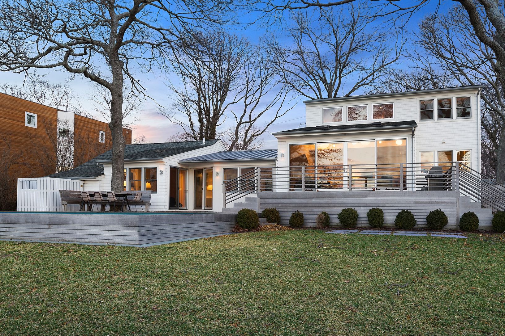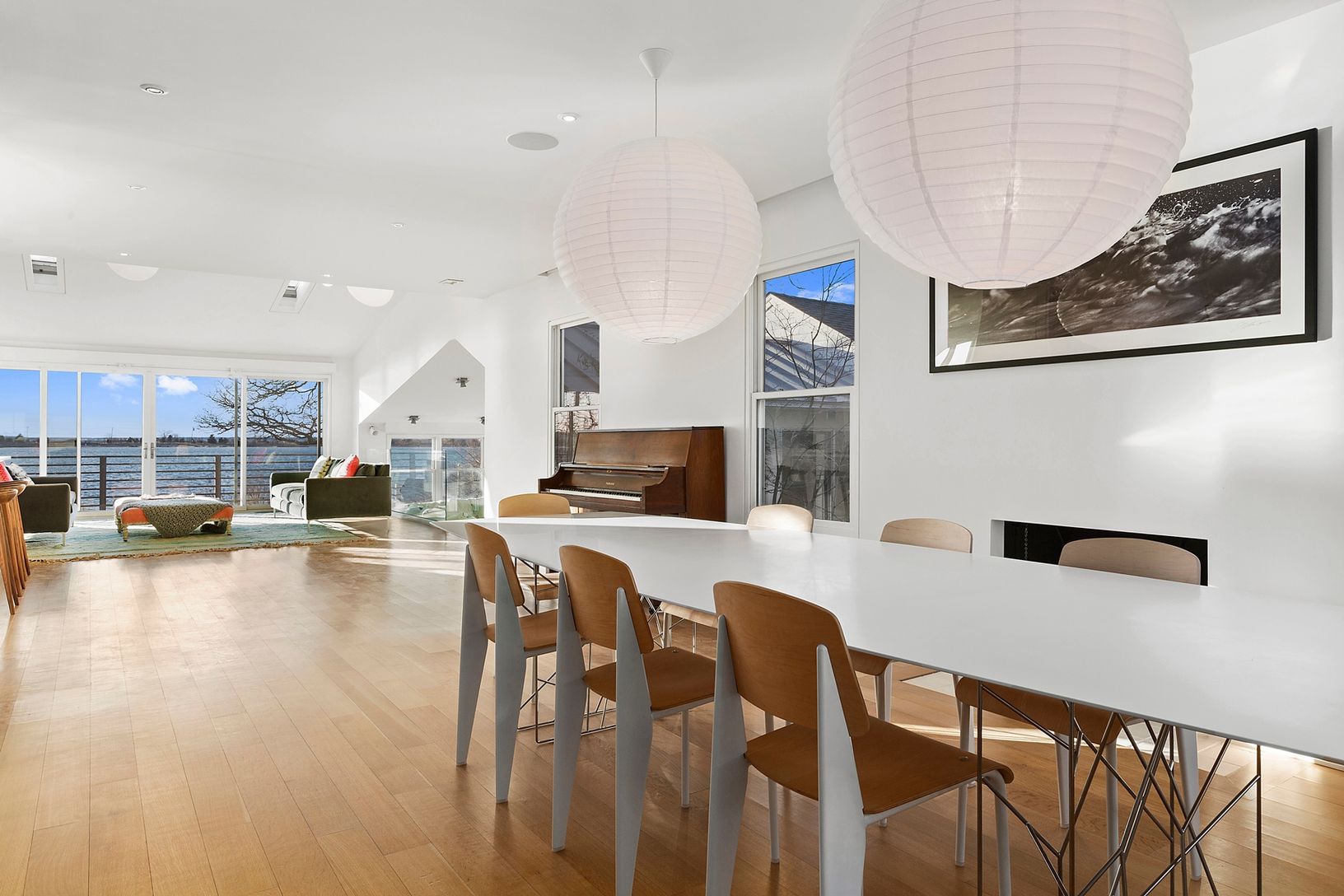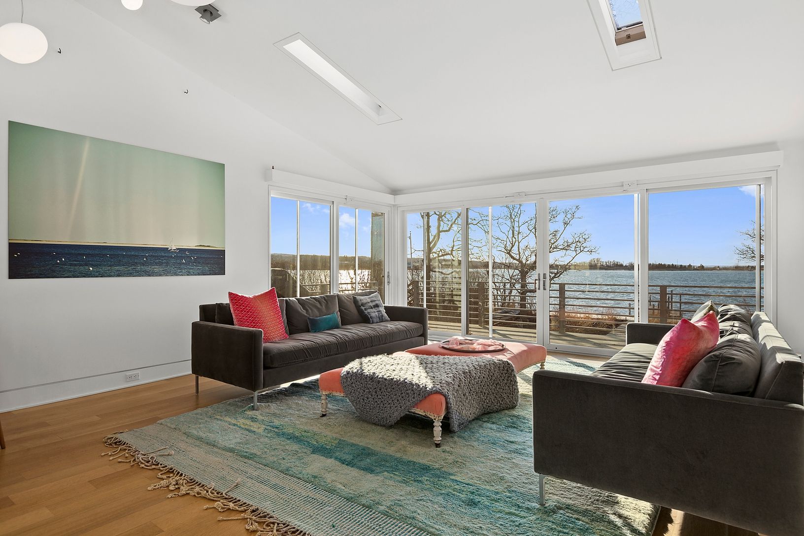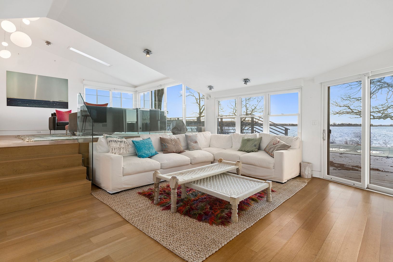 Facing west on Sag Harbor Cove, 176 Redwood Road has panoramic views, deep water dock, waterside gunite pool and outdoor shower. Serene water views can be seen throughout this cutting edge Modern Green Home, which combines environmentally conscious building techniques with high-end construction and finishes. The 3-bedroom home has a lovely open flow, showroom-quality kitchen and baths (Boffi cabinetry, Gaggeneau appliances, Dornbracht bathroom