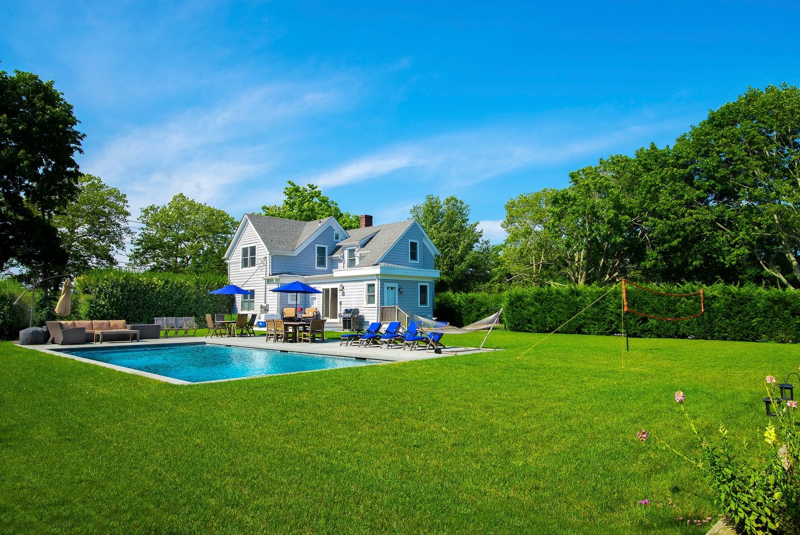 This beautiful village home is available for August Rental . There are five bedrooms , 2 1/2 baths with a great location to the train station, village and ocean beaches . This property offers several living spaces on the first and second floor. The salt water heated gunite pool completes this picture.