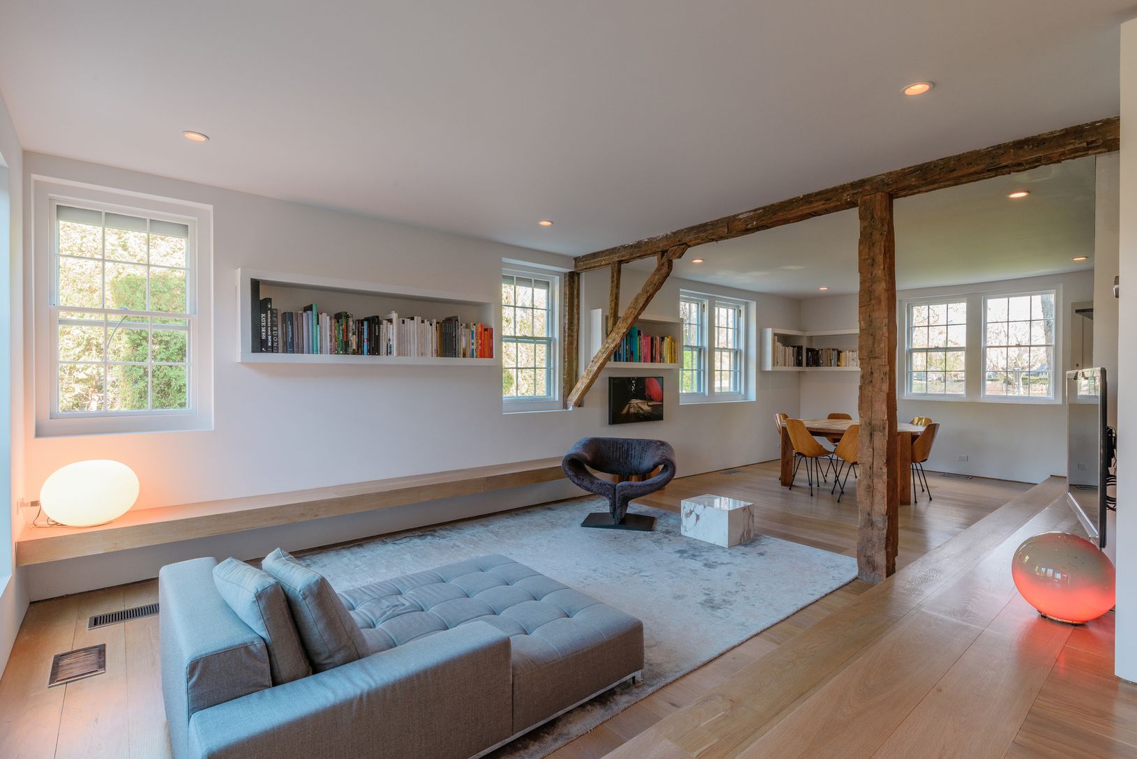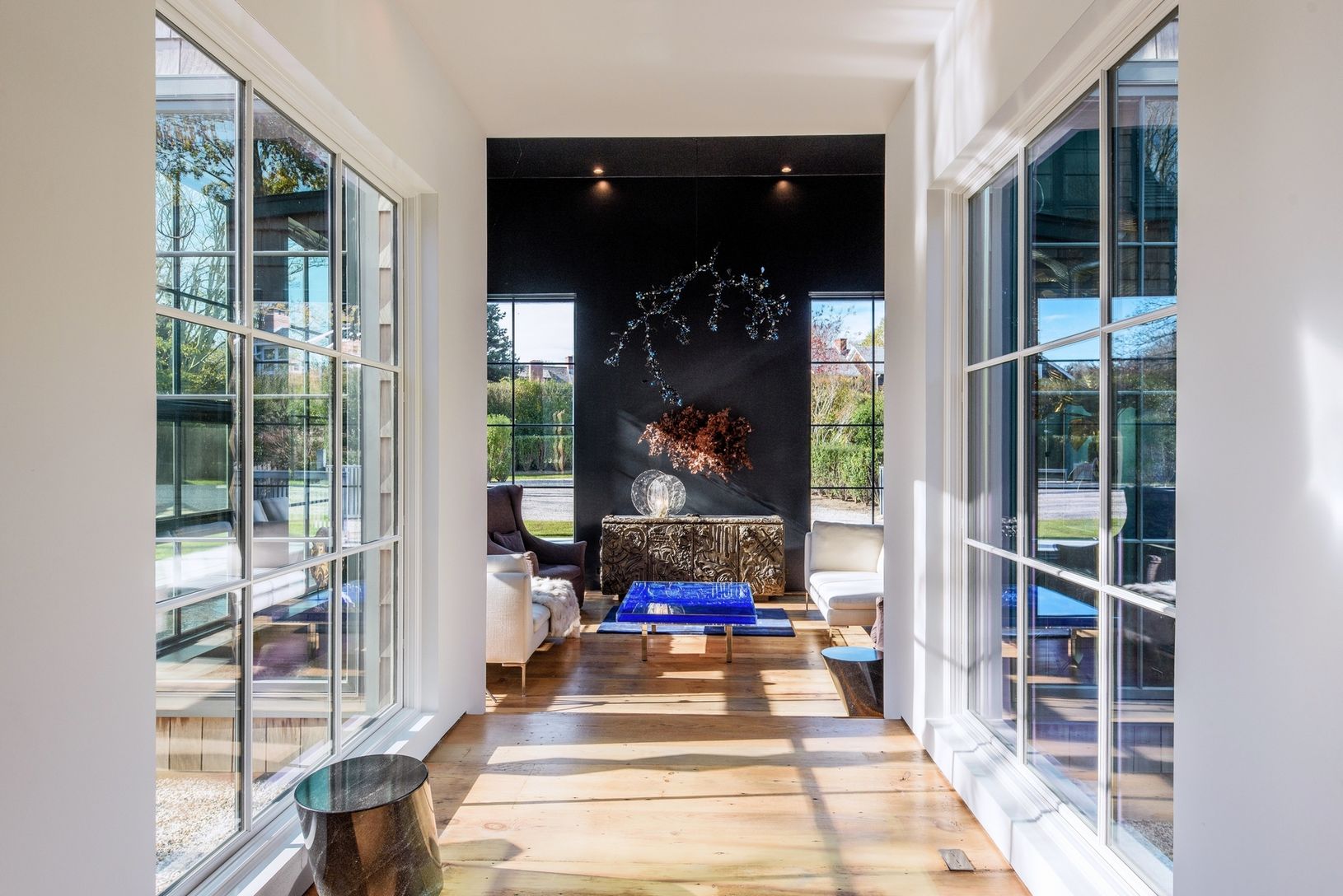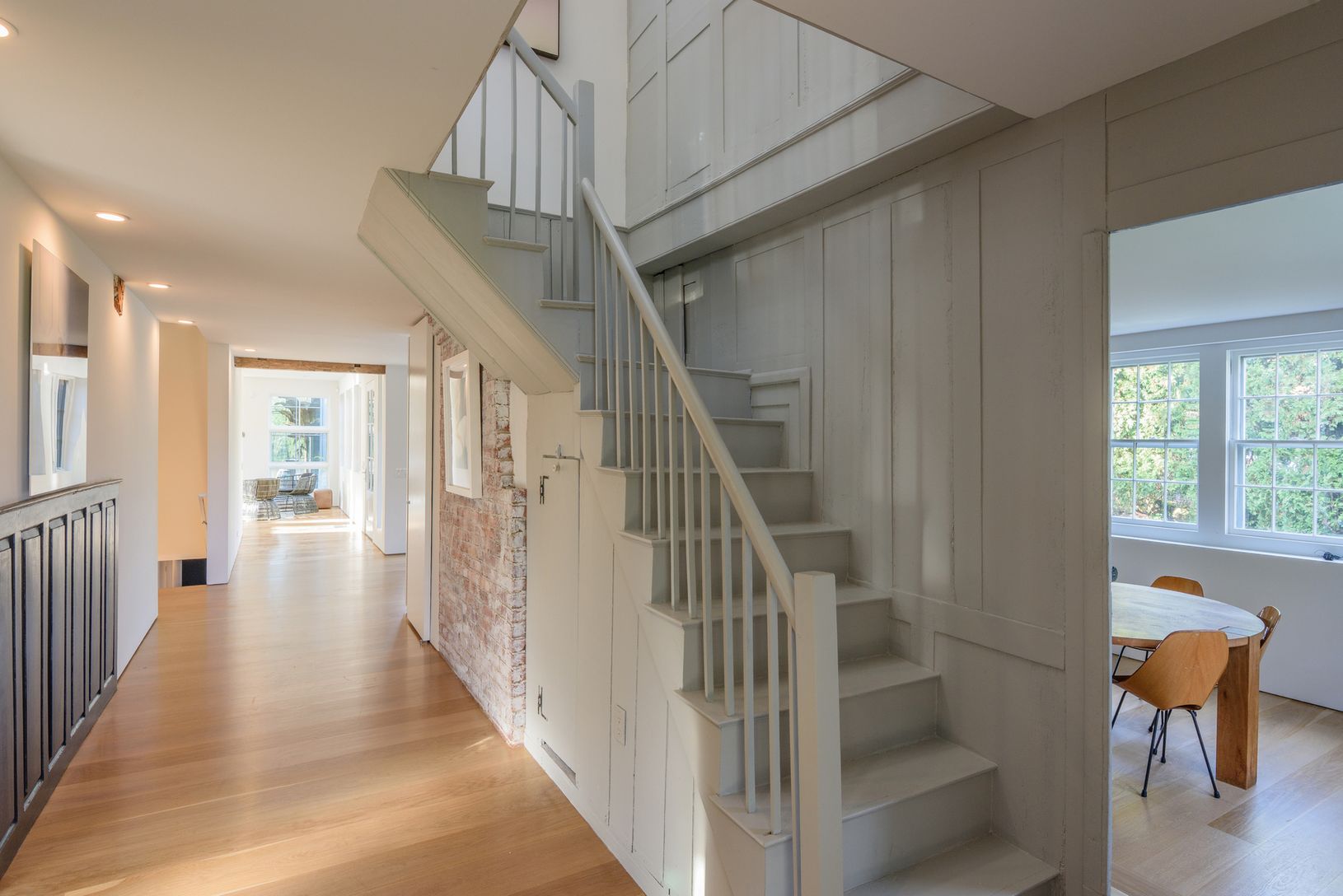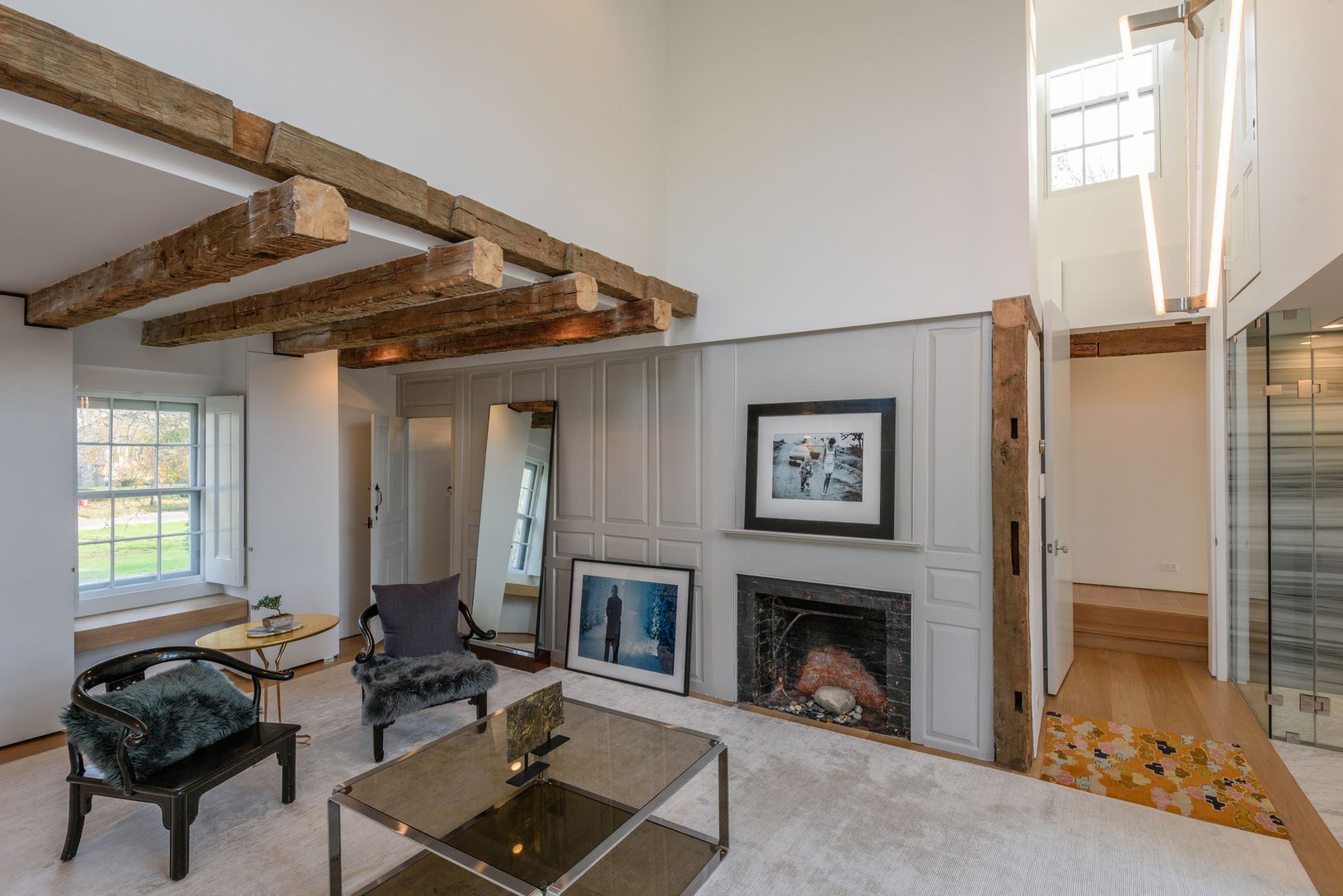This strikingly redesigned historic village home was renovated and expanded by the highest standards in 2015 to combine European style with seamless modern design and flow inviting the outdoors in. Original foyer gives to a spacious living room with exposed beams, eat-in chef's Boffi kitchen and double-height great room all framed by floor to ceiling windows and doors. There are five en-suite bedrooms, including the cathedral ceiling master be