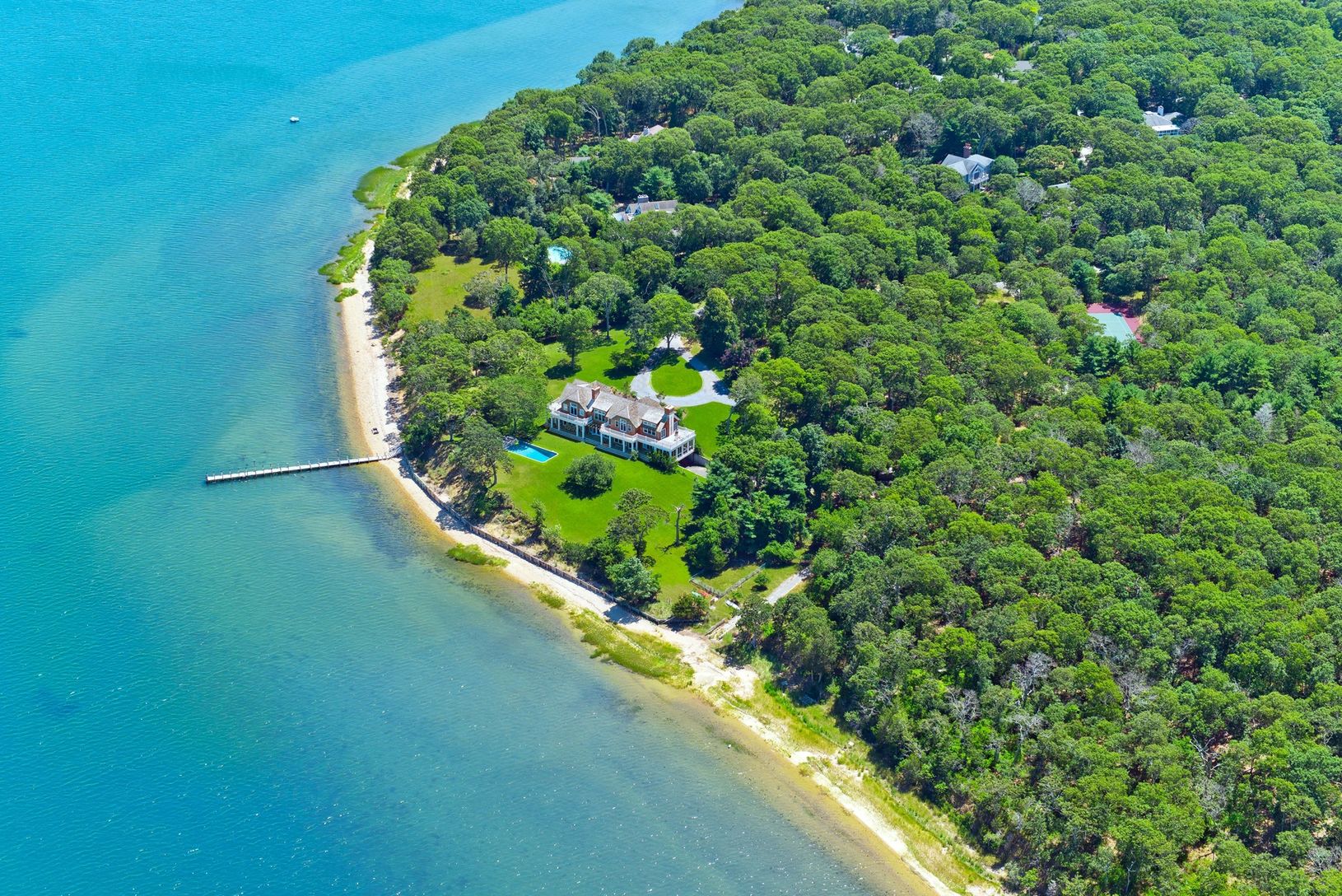Situated on a point along the southwestern shoreline of Three Mile Harbor, this one of a kind estate offers the opportunity to own a true waterfront compound in one of the most private settings on the East End. The property is comprised of three parcels, totaling over 12 acres. The existing home sits on 8.2 Acres and has a private dock, tennis, and waterside pool. The 4500 +/- sq. ft. traditional has 6 bedrooms and 5.5 bathrooms, full basem