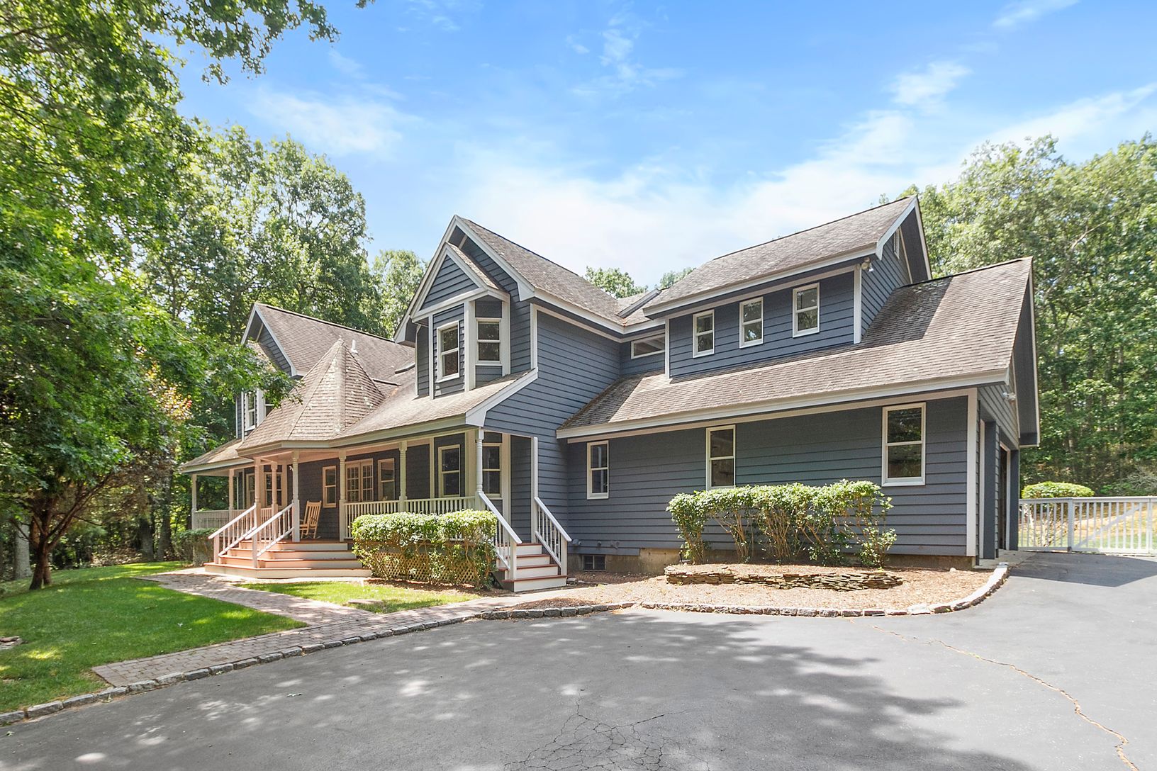 Bright, airy and open is the best way to describe this six bedroom, four bath post modern style home situated on 1.2 +/- acres in prime location. Beautiful setting on top of hill with a large flat mostly cleared lawn in the backyard. With nearly 4,000 +/- sq. ft., features a spacious two story great room with a floor to ceiling stone fireplace, two bedrooms, two and one-half baths, an eat in kitchen with granite counter tops and Viking range
