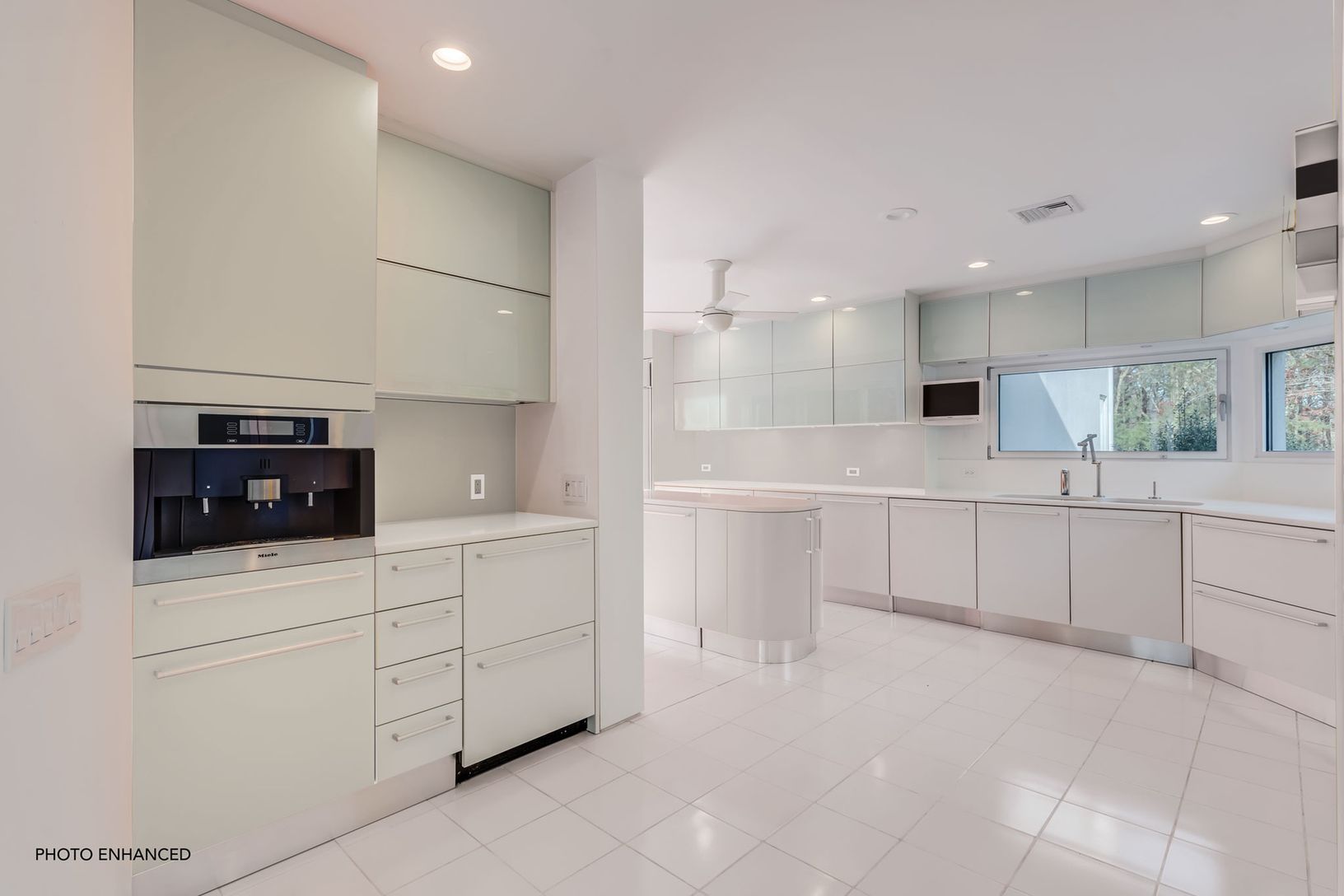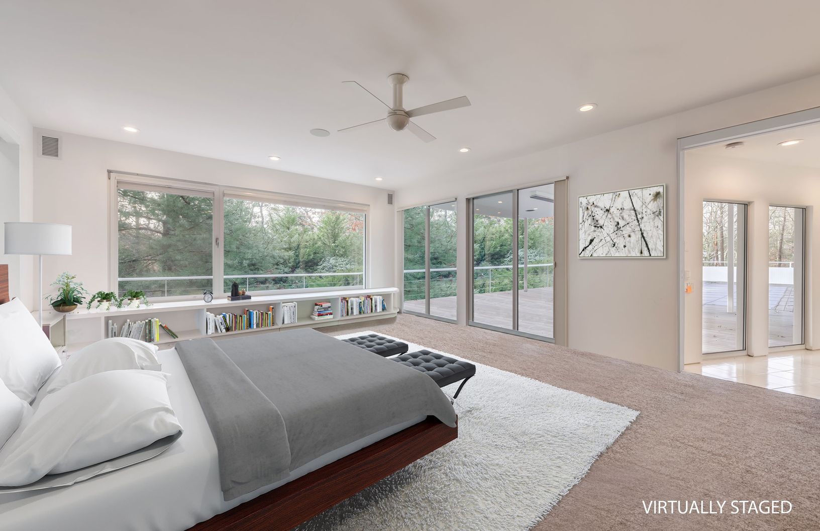 A contemporary classic, this artists' home in a quiet location in East Hampton is full of light and color. Wood floors throughout anchor white walls and ceilings, with accents of bright color. Sited on just shy of two acres, the home has four bedrooms, three full and two half baths, and a double height living room with fireplace, flooded with natural light from large windows. The open living are flows to the kitchen, which provides lots of cou