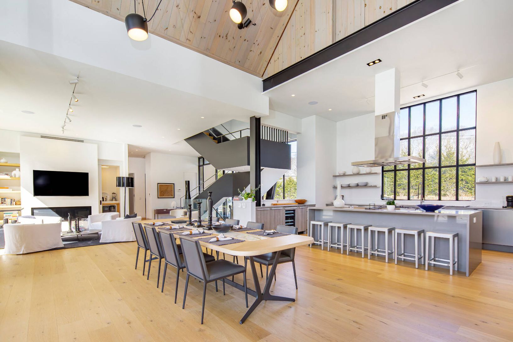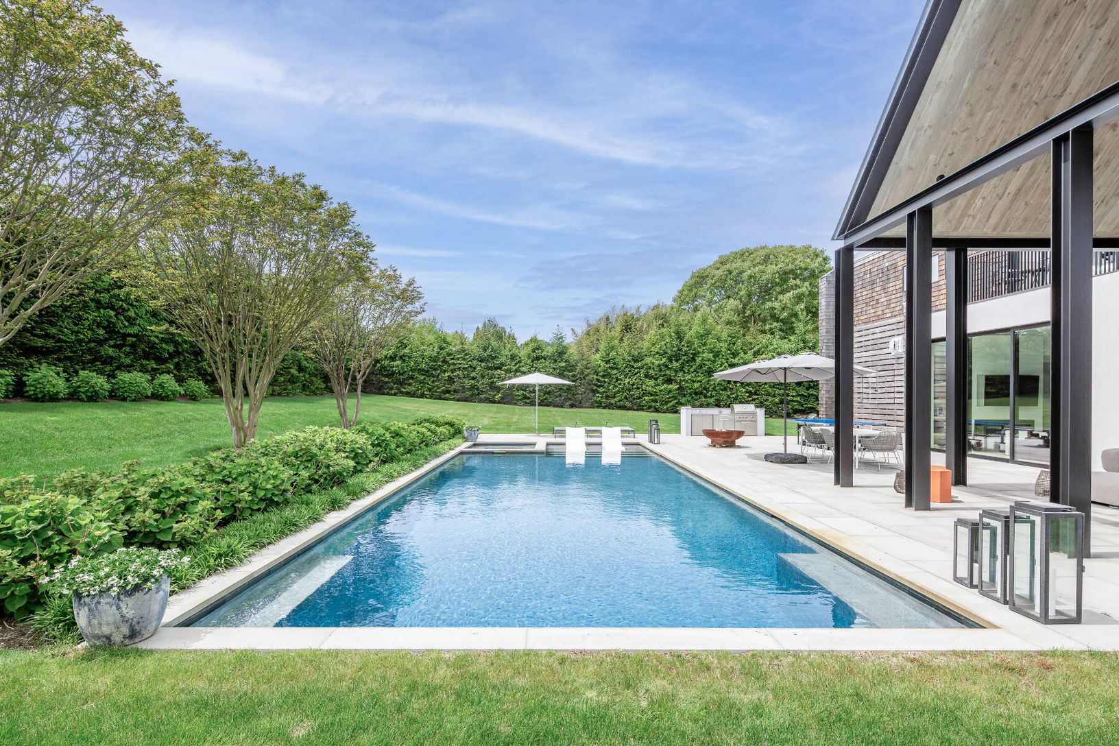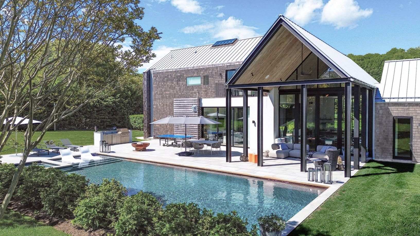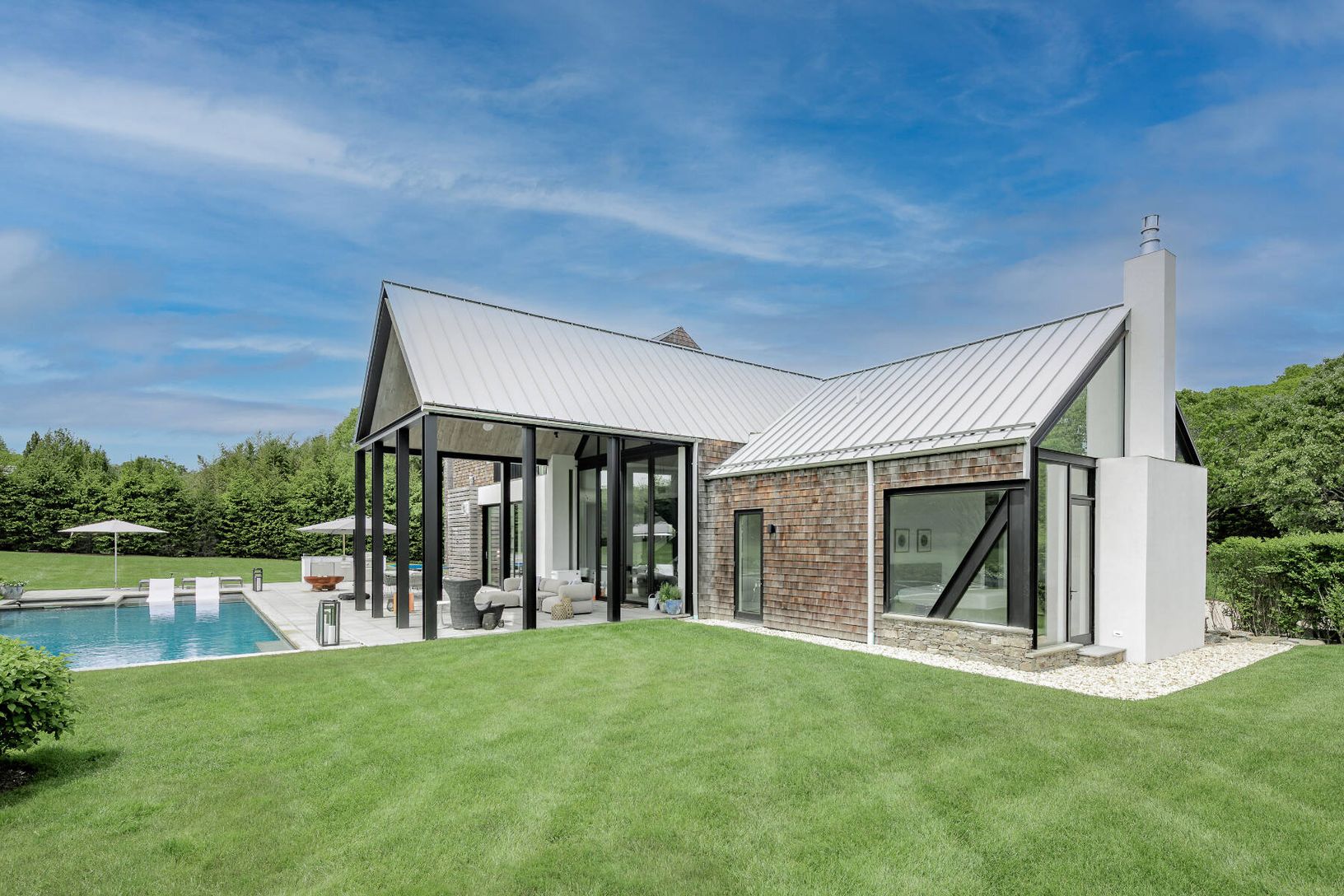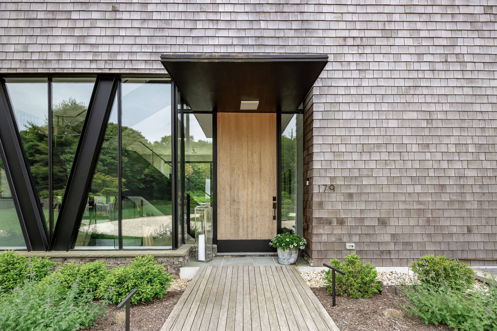 This stunning contemporary home offers 5,800± sq. ft. of impeccably designed living space with five bedrooms and six full baths. Thoughtfully designed for comfort and accessibility, the home is handicap-friendly, featuring wide entryways, an open layout, and a first-floor primary suite to ensure ease of movement throughout. Walls of glass, custom steel-framed doors, LaCantina sliders, and soaring ceilings fill the home with natural light. The